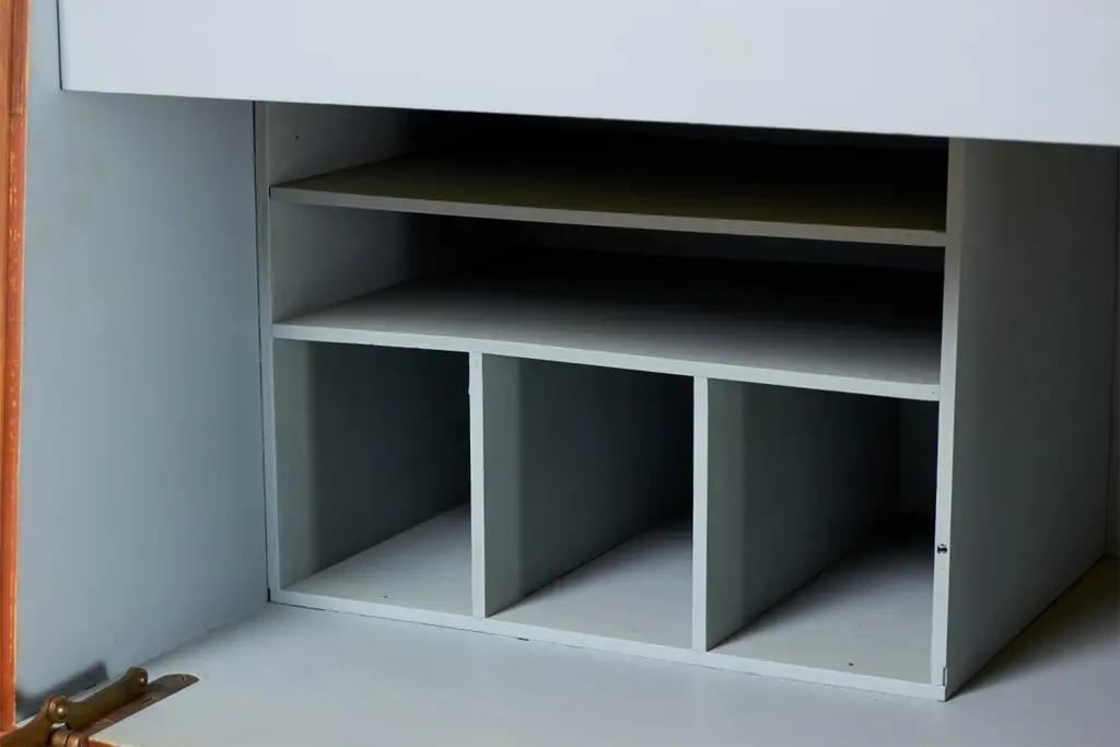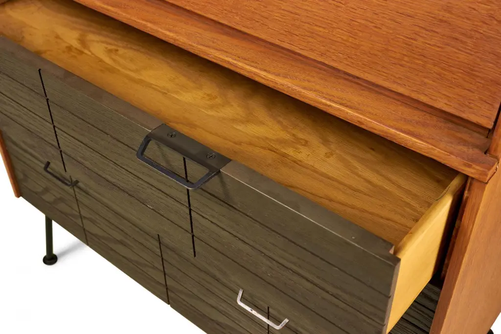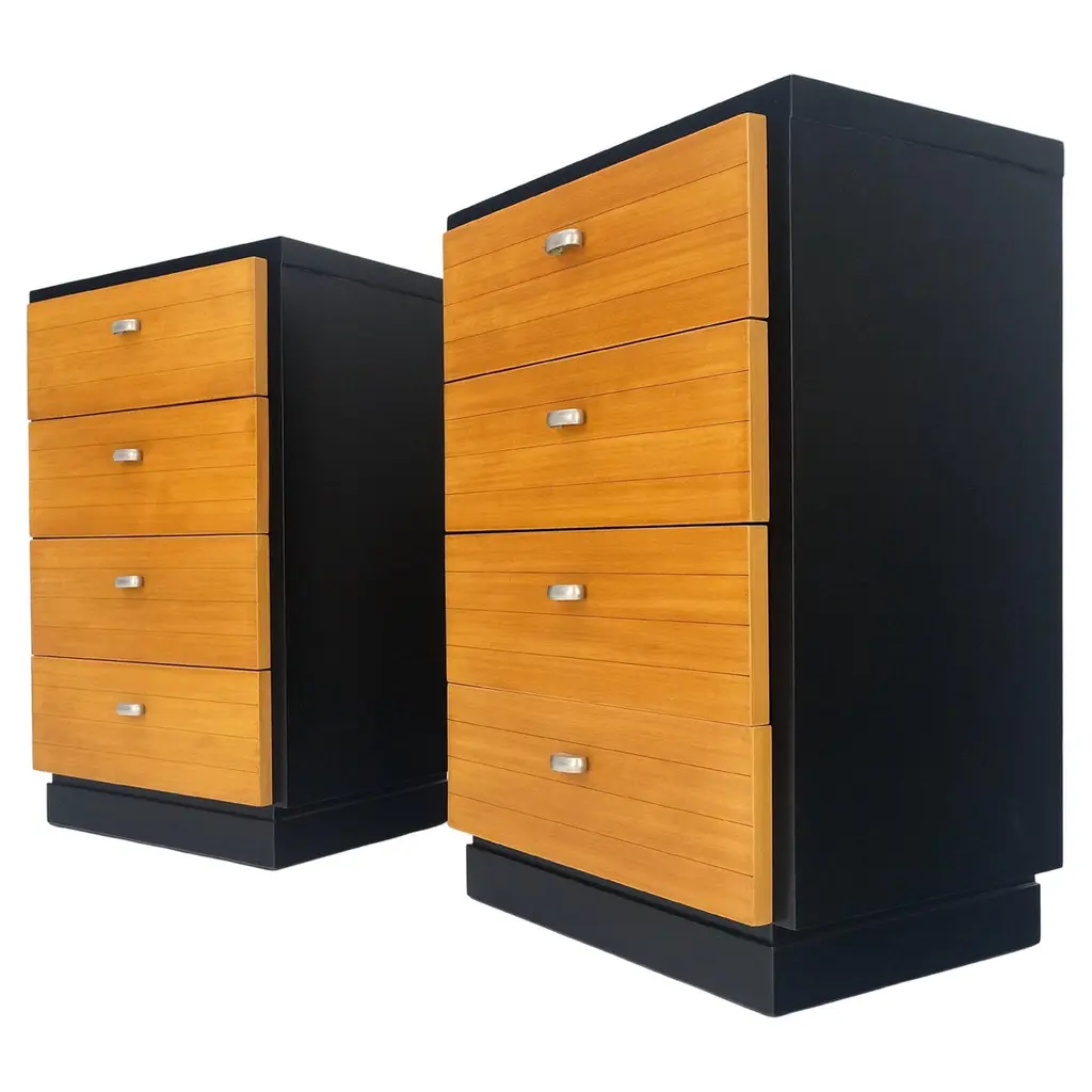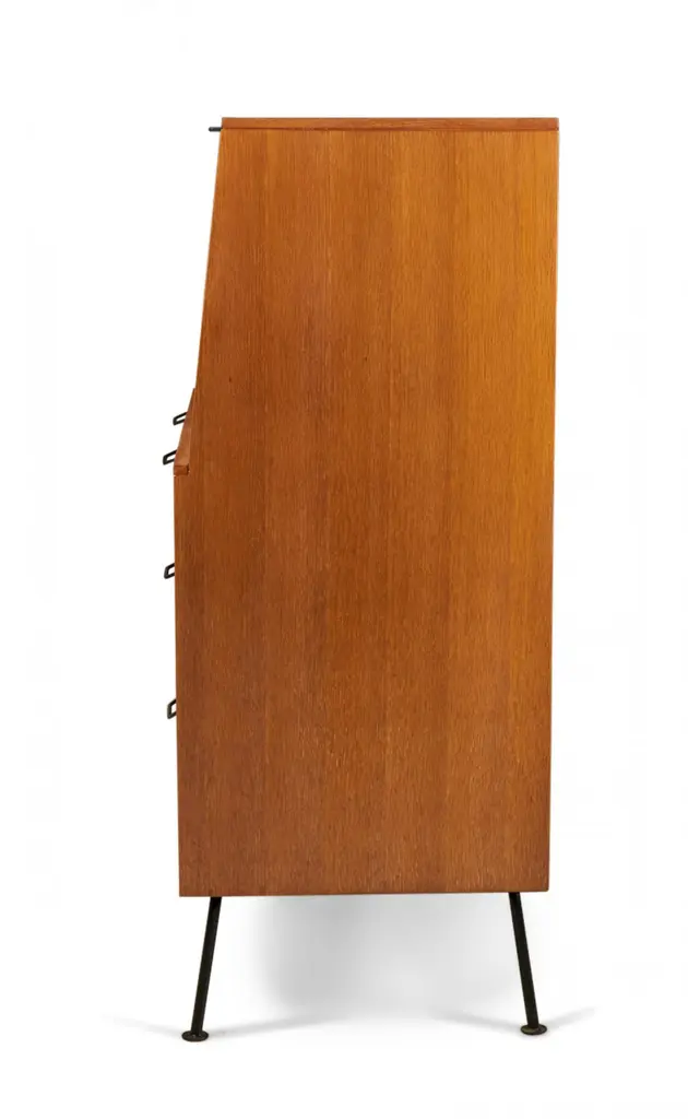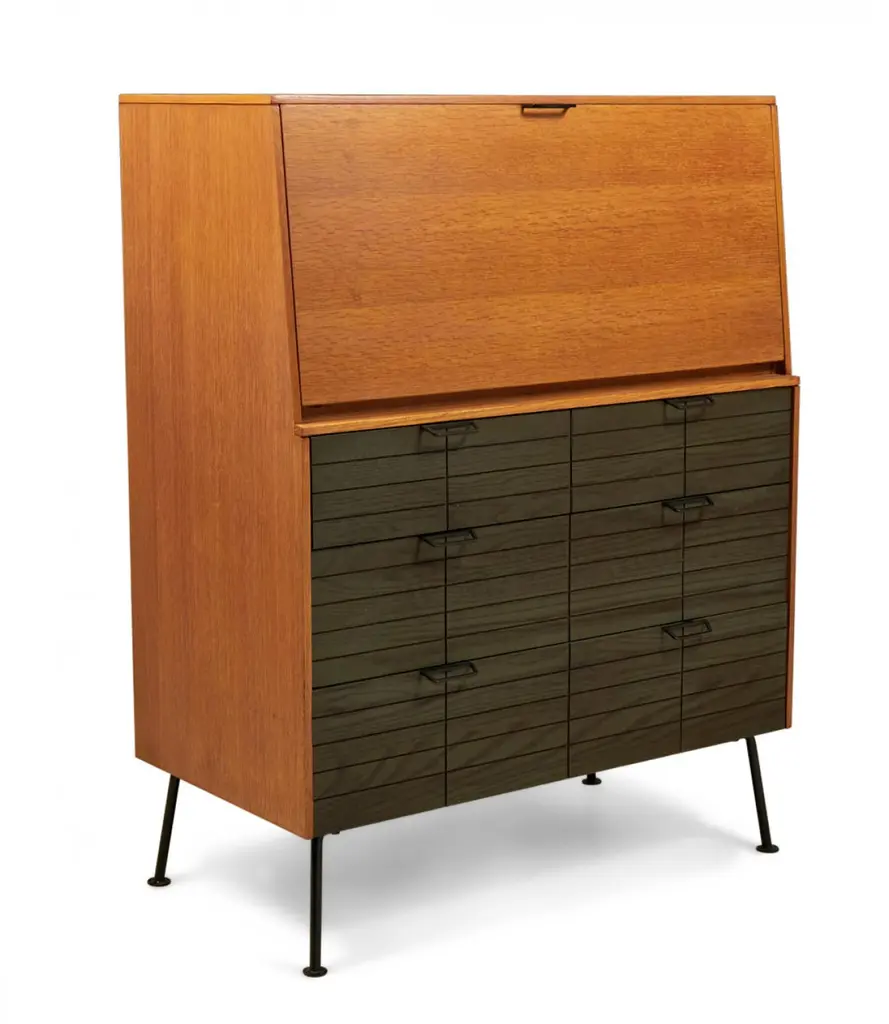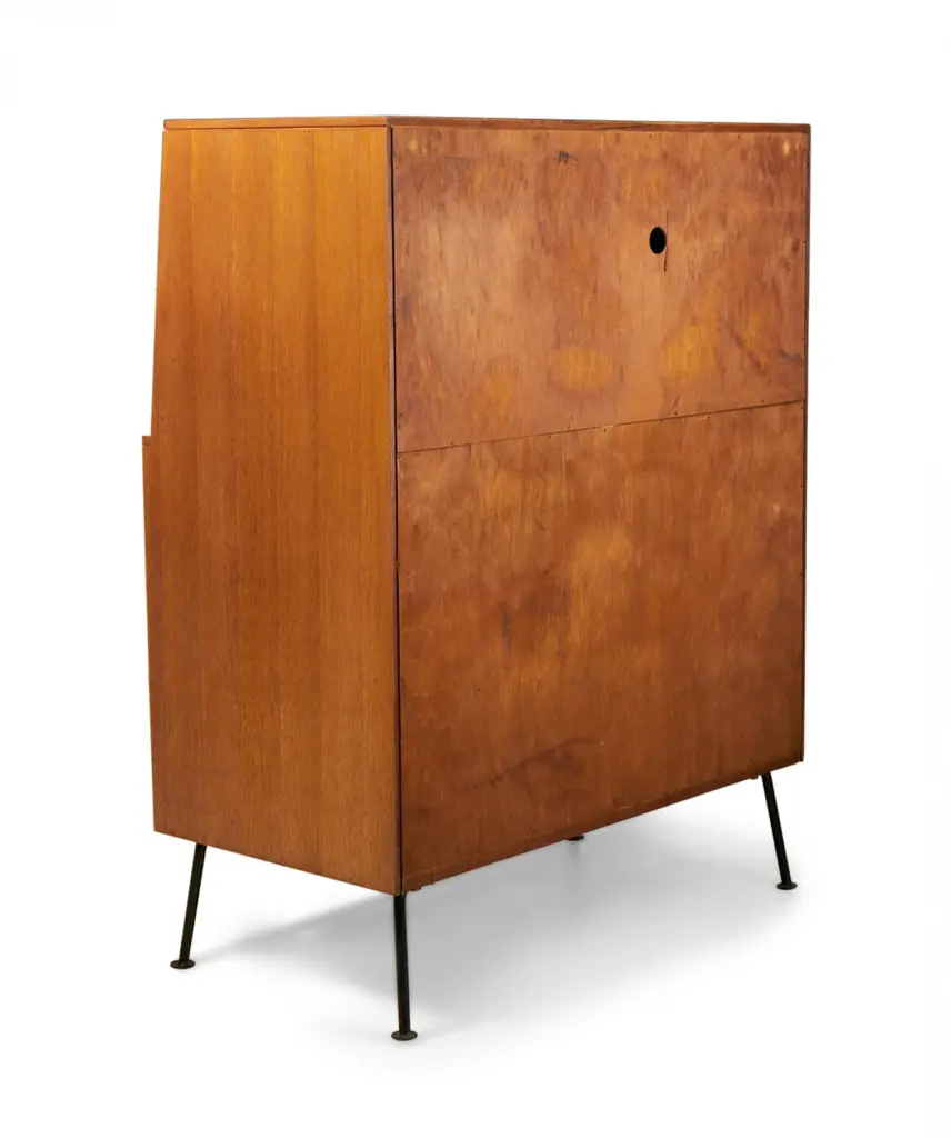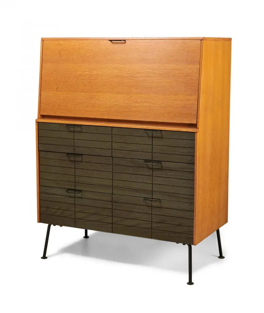 Raymond Loewy For Mengel Fall-Front Walnut And Iron Secretary Cabinets