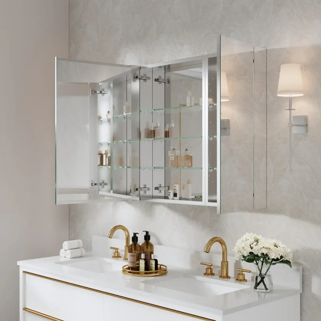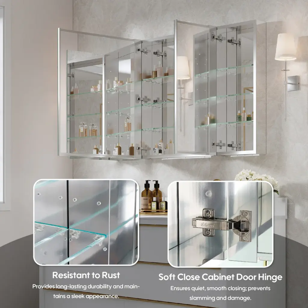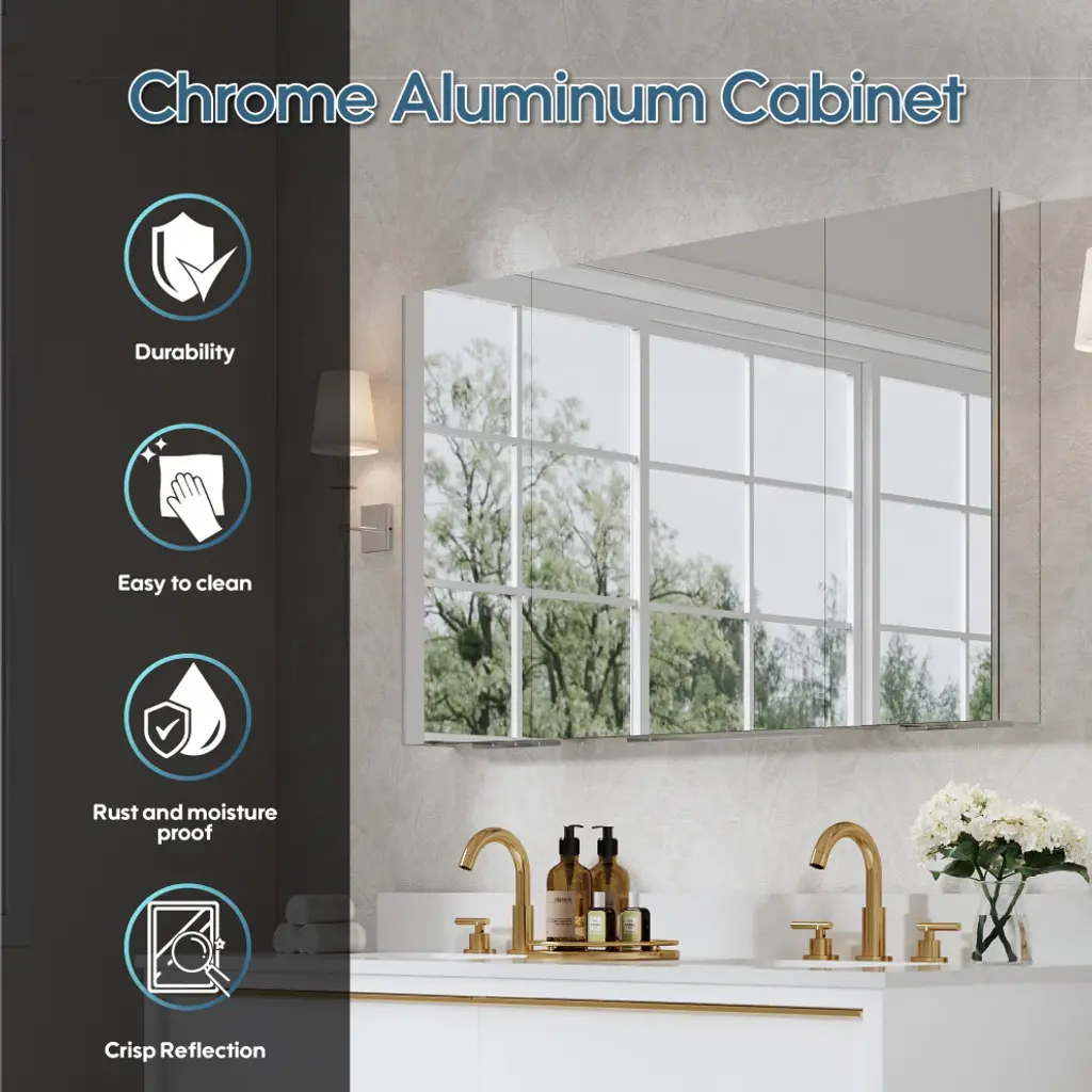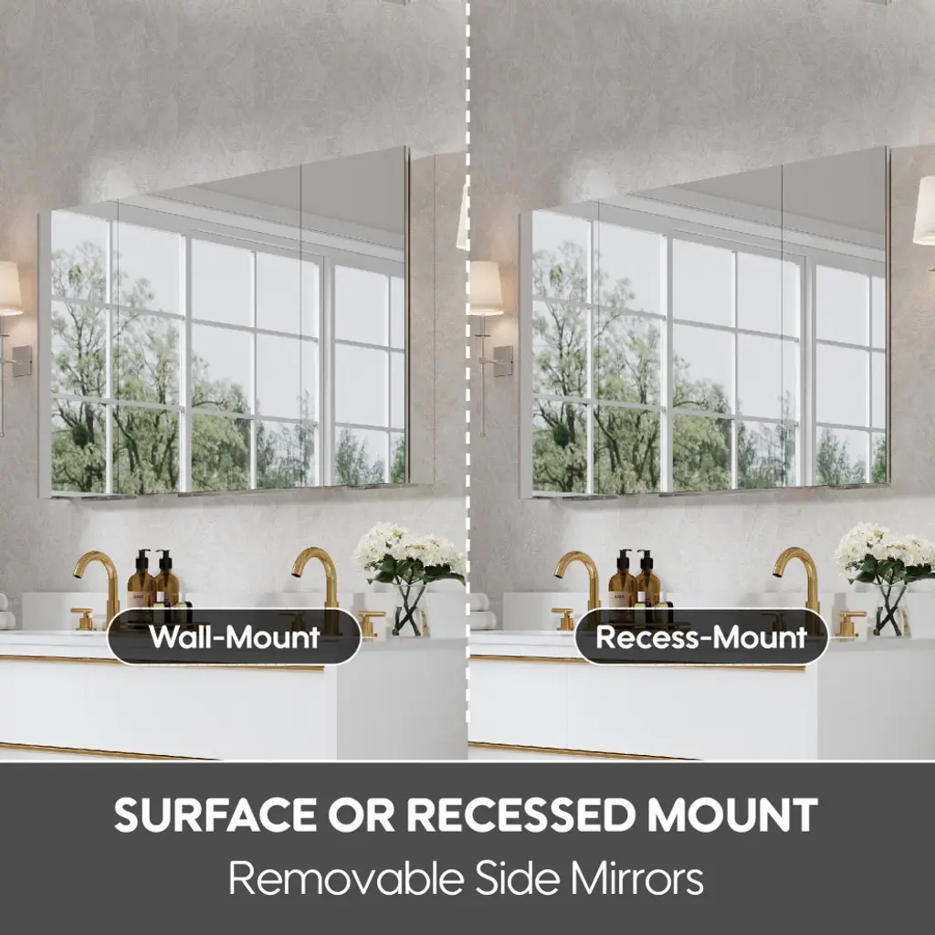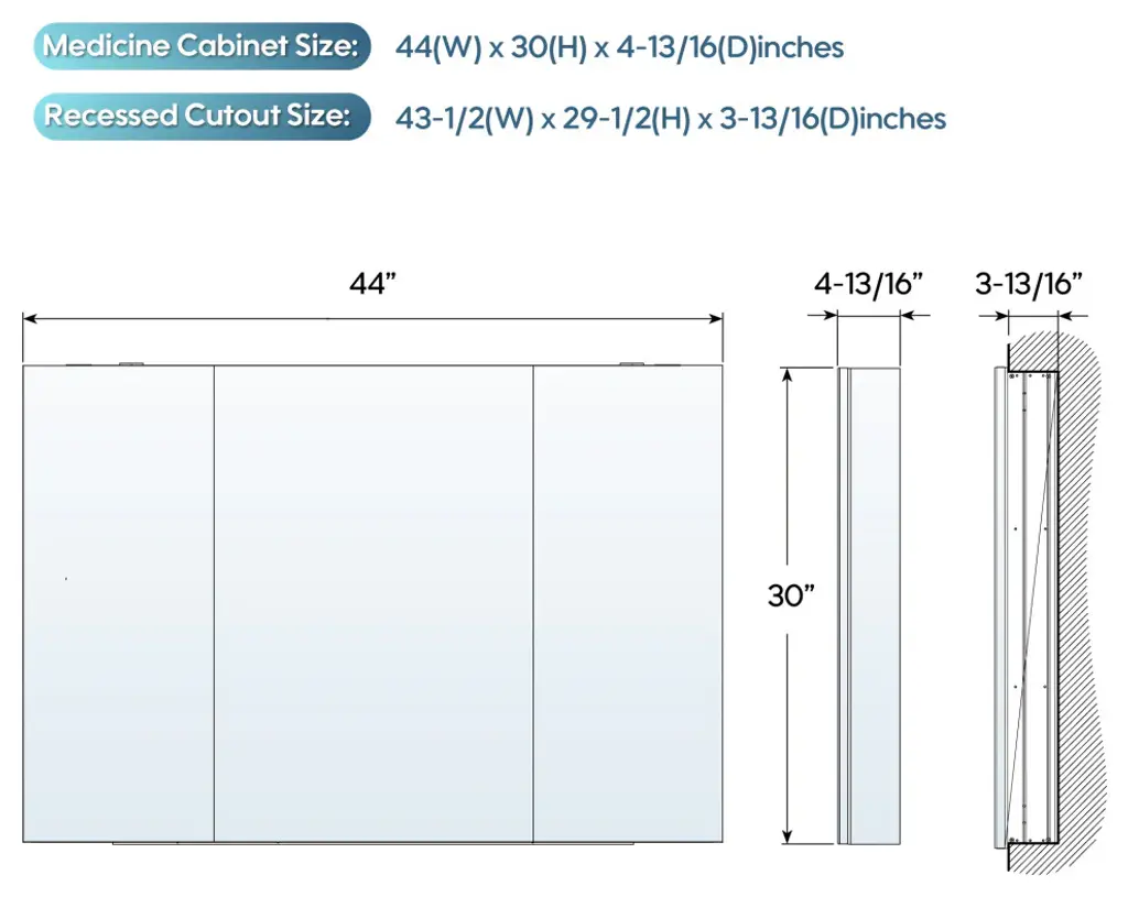 Enhance your bathroom''s style and functionality with this premium Copper-Free Tri-View Glass Mirror Cabinet. Featuring an elegant anodized chrome aluminum body, soft-close Blum® hinges, and explosion-proof glass, this cabinet combines durability and sleek design for long-lasting use. Whether wall-mounted or recessed, the flexible installation options and adjustable glass shelves provide ample storage while maintaining a modern aesthetic.• • • Key Features:Copper-Free Construction: Resistant to corrosion and tarnishing, ensuring long-term clarity and durability.Tri-View Glass Mirrors: Tri-view glass mirrors provide a wide and clear reflection, ideal for grooming and daily tasks.Soft-Close Blum® Hinges: High-quality, smooth-functioning Blum® soft-close hinges ensure quiet, gentle door closure every time.Flexible Installation Options: Can be wall-mounted or recessed, with a surface mount kit included for easy installation.Anodized Chrome Aluminum Body: Provides a sleek, modern finish while being resistant to moisture and corrosion.Explosion-Proof Glass: Offers added safety and durability, making it a secure choice for busy bathrooms.8mm Ultra Clear Adjustable Glass Shelves: Sturdy shelves for optimal storage, easily adjustable to fit your storage needs.Reversible Installation: The door can be easily installed to open from either the left or right side, with a simple 180° rotation.5-Year Limited Warranty: Enjoy peace of mind with our comprehensive warranty covering defects in materials and workmanship.• • • Specification:Included: Mounting HardwareMount Style: Recess/Surface MountNumber of Doors: 3Number of Shelves: 9Shelf Size W• D• H(inch): 10 3/8• 9/16• 5/16; 18 3/8• 3 9/16• 5/16Weight Capacity(Lbs): 35Cabinet Size W• D• H(inch): 44• 4 13/16"• 30"Ressess Rough-in Size: 43 1/5• 3 13/16• 29 1/2"