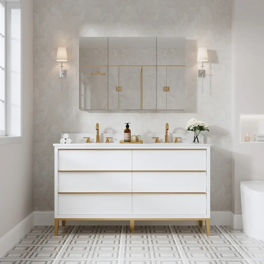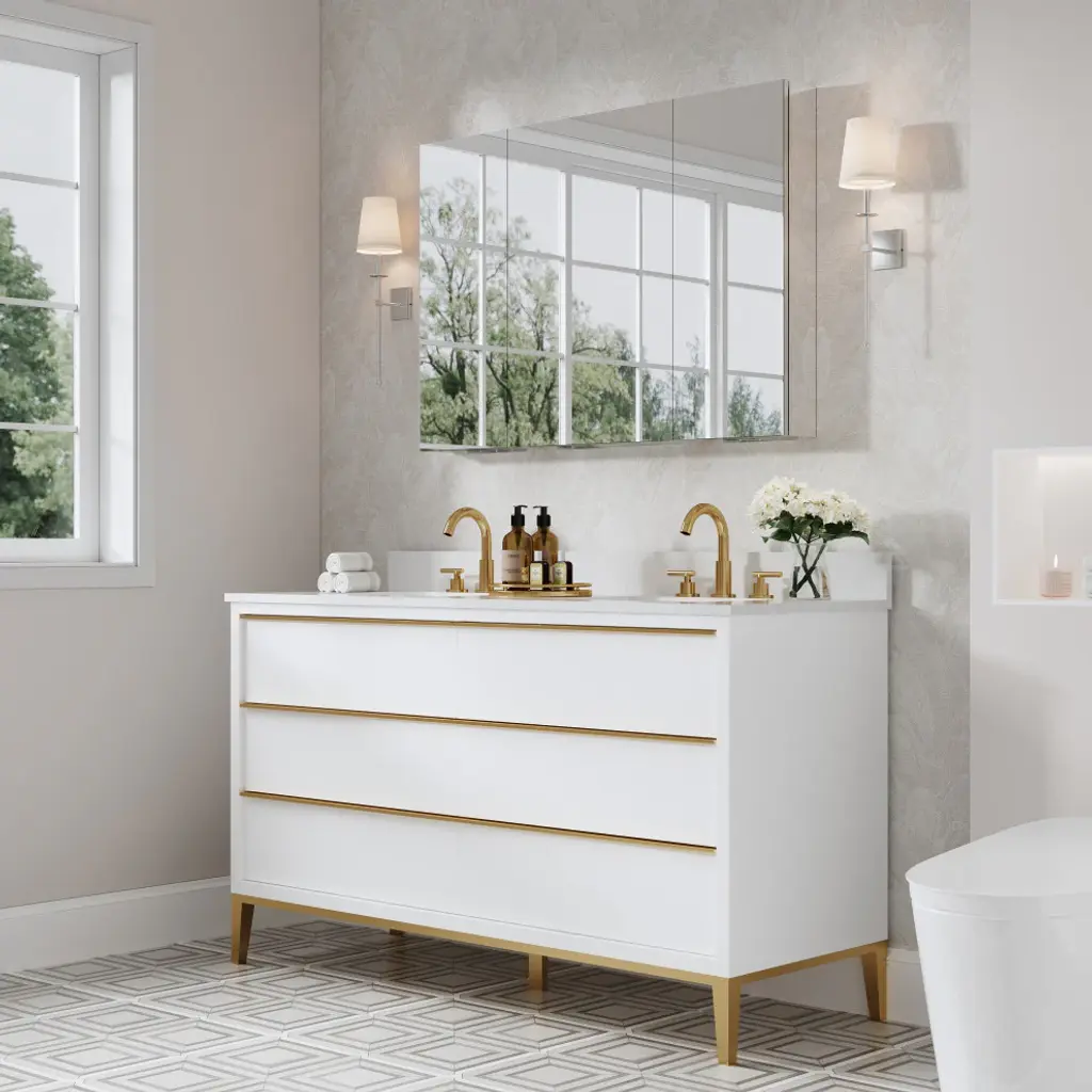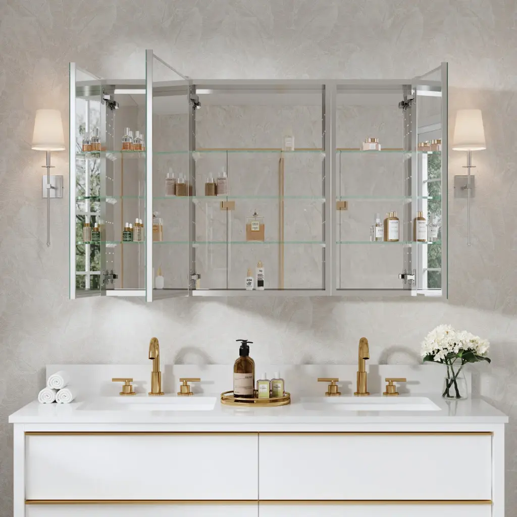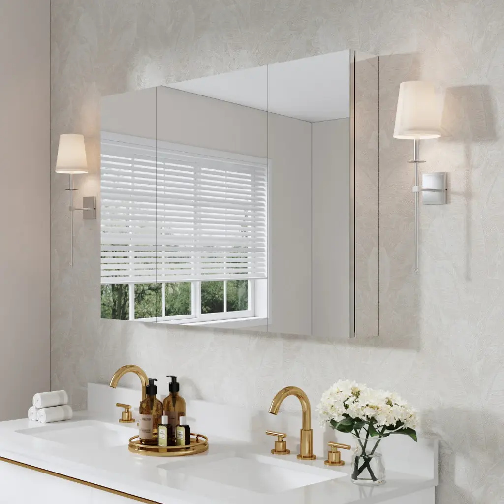 Enhance your bathroom''s style and functionality with this premium Copper-Free Tri-View Glass Mirror Cabinet. Featuring an elegant anodized chrome aluminum body, soft-close Blum® hinges, and explosion-proof glass, this cabinet combines durability and sleek design for long-lasting use. Whether wall-mounted or recessed, the flexible installation options and adjustable glass shelves provide ample storage while maintaining a modern aesthetic.• • • Key Features:Copper-Free Construction: Resistant to corrosion and tarnishing, ensuring long-term clarity and durability.Tri-View Glass Mirrors: Tri-view glass mirrors provide a wide and clear reflection, ideal for grooming and daily tasks.Soft-Close Blum® Hinges: High-quality, smooth-functioning Blum® soft-close hinges ensure quiet, gentle door closure every time.Flexible Installation Options: Can be wall-mounted or recessed, with a surface mount kit included for easy installation.Anodized Chrome Aluminum Body: Provides a sleek, modern finish while being resistant to moisture and corrosion.Explosion-Proof Glass: Offers added safety and durability, making it a secure choice for busy bathrooms.8mm Ultra Clear Adjustable Glass Shelves: Sturdy shelves for optimal storage, easily adjustable to fit your storage needs.Reversible Installation: The door can be easily installed to open from either the left or right side, with a simple 180° rotation.5-Year Limited Warranty: Enjoy peace of mind with our comprehensive warranty covering defects in materials and workmanship.• • • Specification:Included: Mounting HardwareMount Style: Recess/Surface MountNumber of Doors: 3Number of Shelves: 9Shelf Size W• D• H(inch): 10 3/8• 9/16• 5/16; 18 3/8• 3 9/16• 5/16Weight Capacity(Lbs): 35Cabinet Size W• D• H(inch): 44• 4 13/16"• 30"Ressess Rough-in Size: 43 1/5• 3 13/16• 29 1/2"