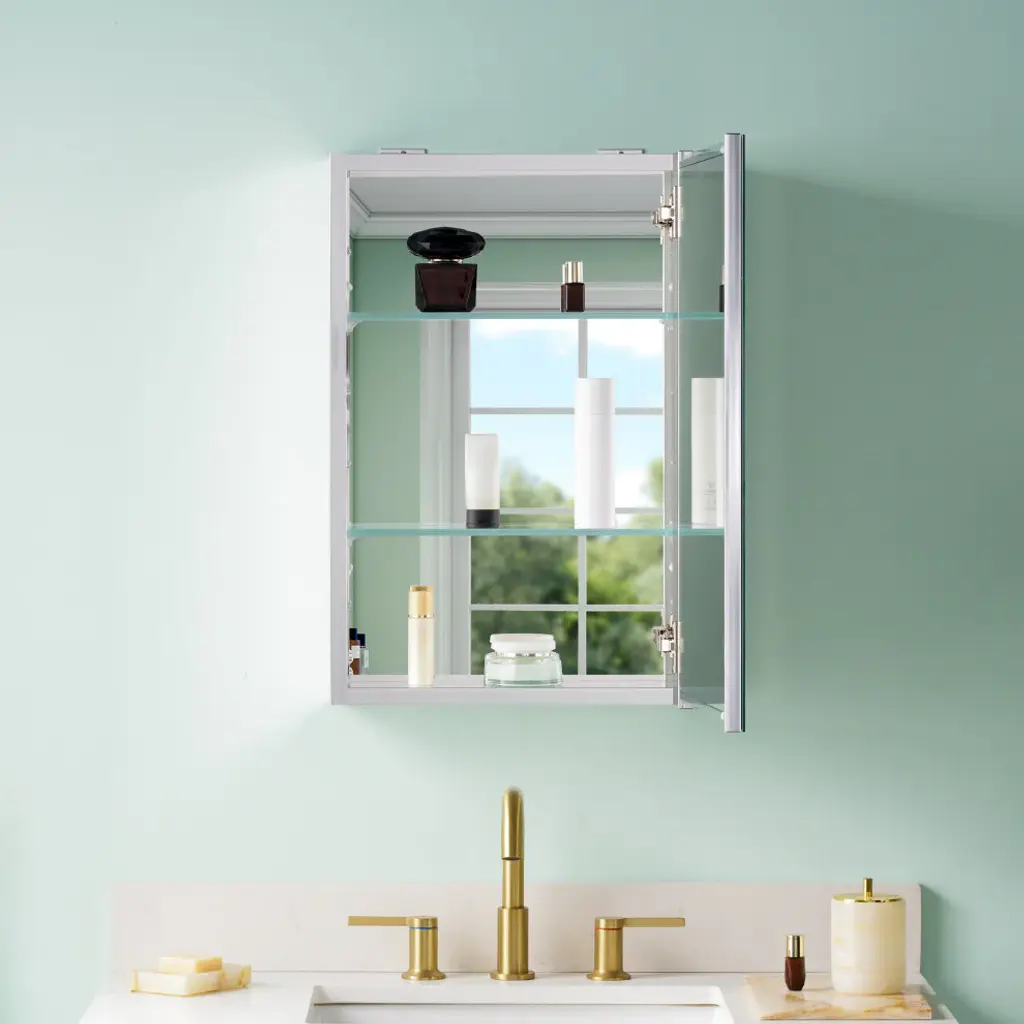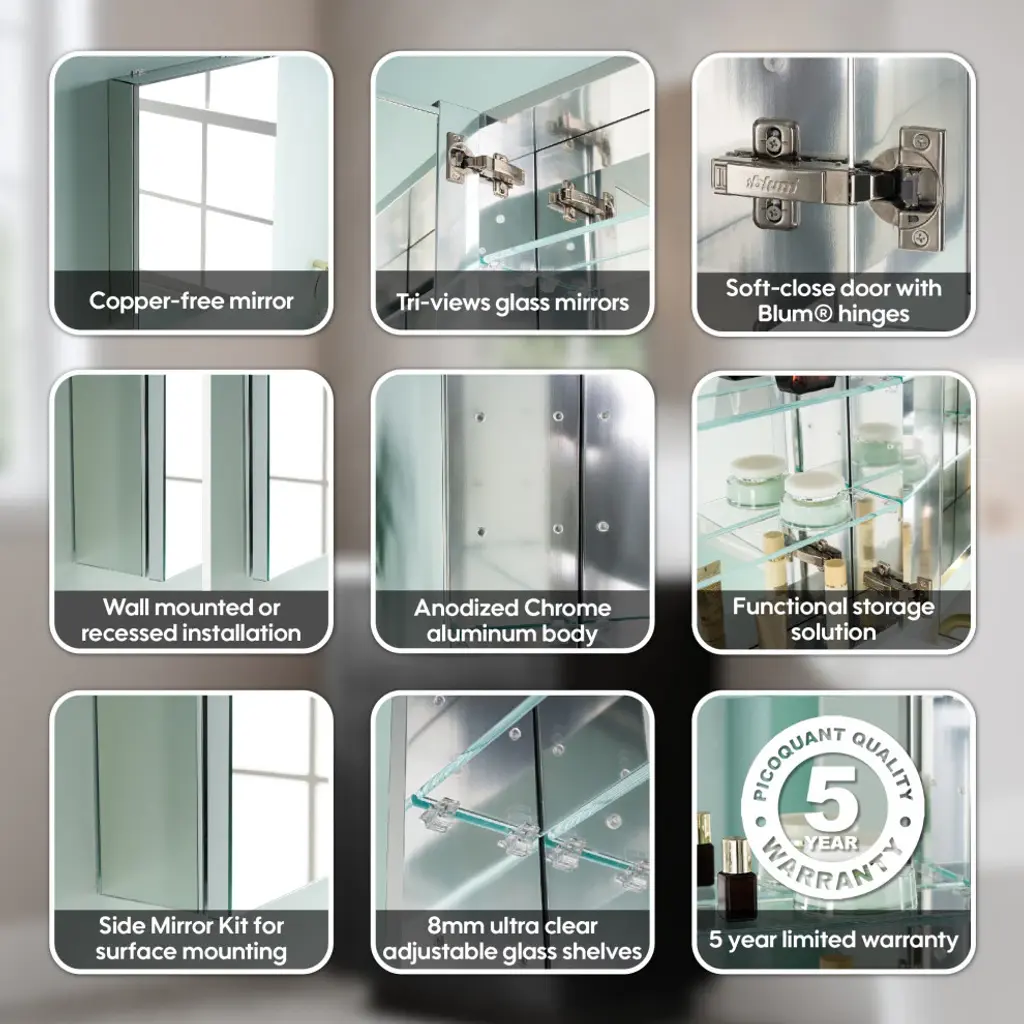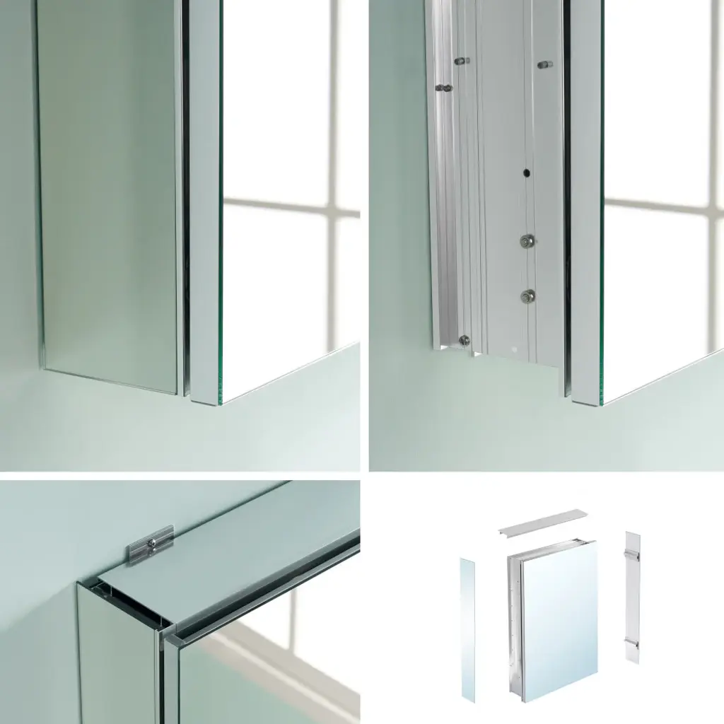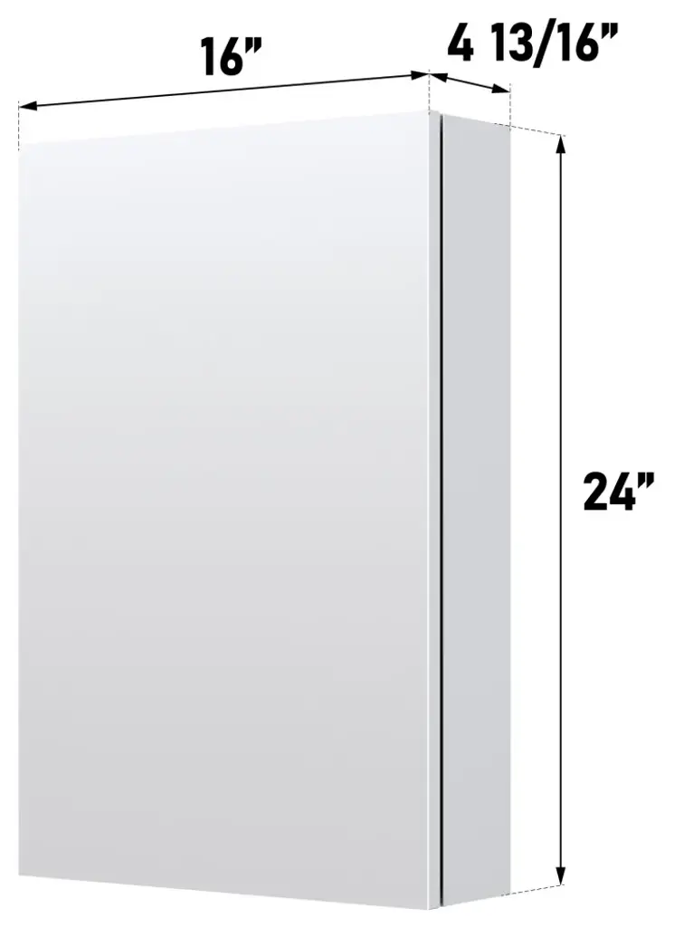 Enhance your bathroom''s style and functionality with this premium Copper-Free Tri-View Glass Mirror Cabinet. Featuring an elegant anodized chrome aluminum body, soft-close Blum® hinges, and explosion-proof glass, this cabinet combines durability and sleek design for long-lasting use. Whether wall-mounted or recessed, the flexible installation options and adjustable glass shelves provide ample storage while maintaining a modern aesthetic.• • • • Key Features:Copper-Free Construction: Resistant to corrosion and tarnishing, ensuring long-term clarity and durability.Tri-View Glass Mirrors: Tri-view glass mirrors provide a wide and clear reflection, ideal for grooming and daily tasks.Soft-Close Blum® Hinges: High-quality, smooth-functioning Blum® soft-close hinges ensure quiet, gentle door closure every time.Flexible Installation Options: Can be wall-mounted or recessed, with a surface mount kit included for easy installation.Anodized Chrome Aluminum Body: Provides a sleek, modern finish while being resistant to moisture and corrosion.Explosion-Proof Glass: Offers added safety and durability, making it a secure choice for busy bathrooms.8mm Ultra Clear Adjustable Glass Shelves: Sturdy shelves for optimal storage, easily adjustable to fit your storage needs.5-Year Limited Warranty: Enjoy peace of mind with our comprehensive warranty covering defects in materials and workmanship.• • • • Specification:Door Swing: Right SwingIncluded: Mounting HardwareMount Style: Recess/Surface MountNumber of Doors: 1Number of Shelves: 2Shelf Size W• D• H(inch): 14 5/16• 3 9/16• 5/16Weight Capacity(Lbs): 35Cabinet Size W• D• H(inch): 16• 4 13/16"• 24" Ressess Rough-in Size: 15 1/2• 3 3/4• 23 1/2"