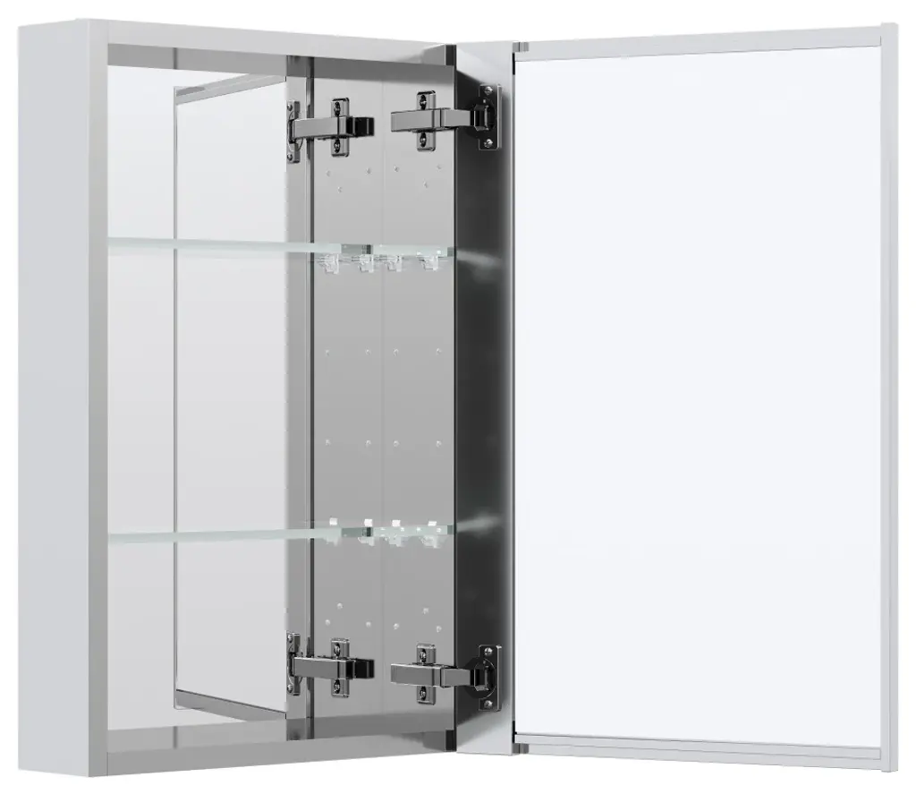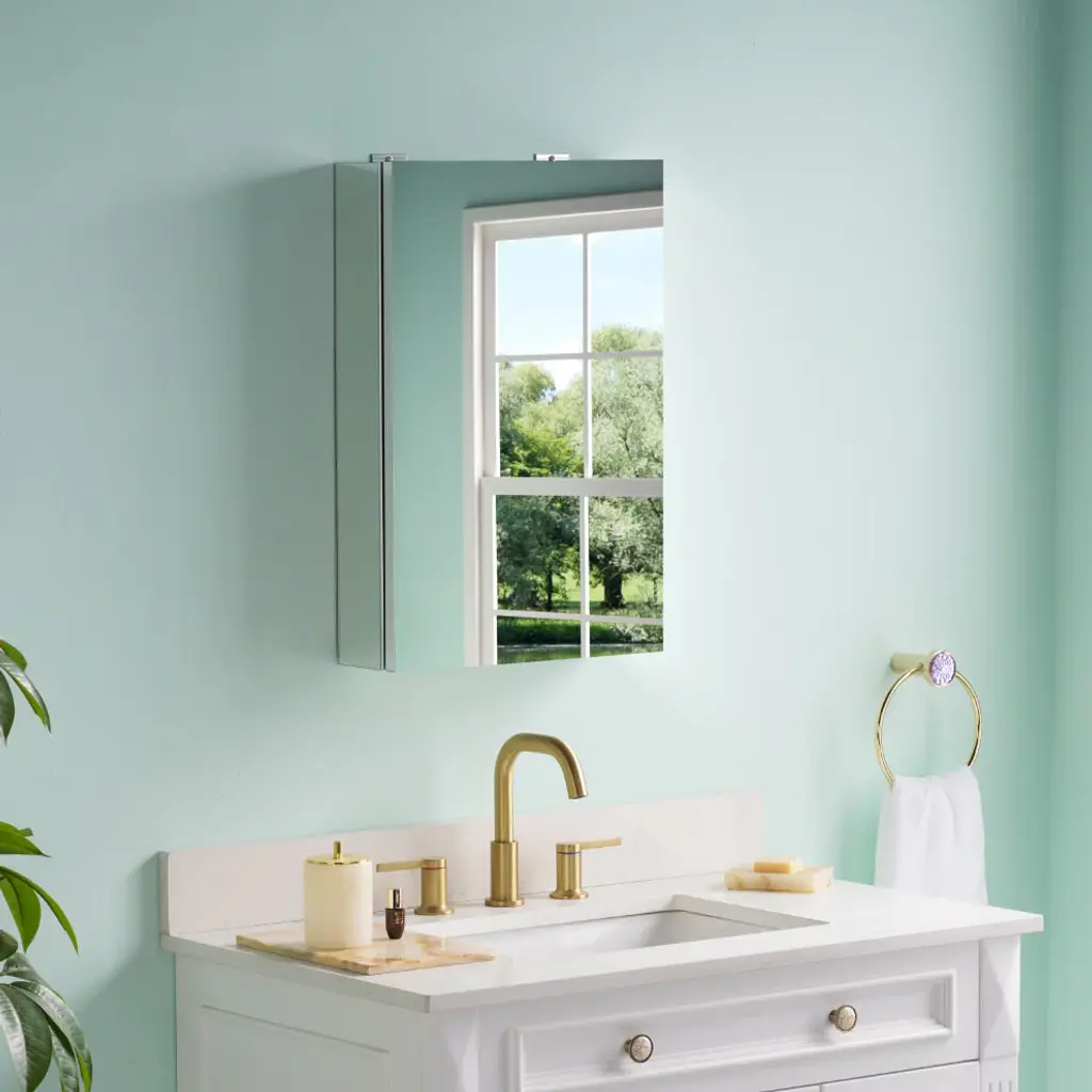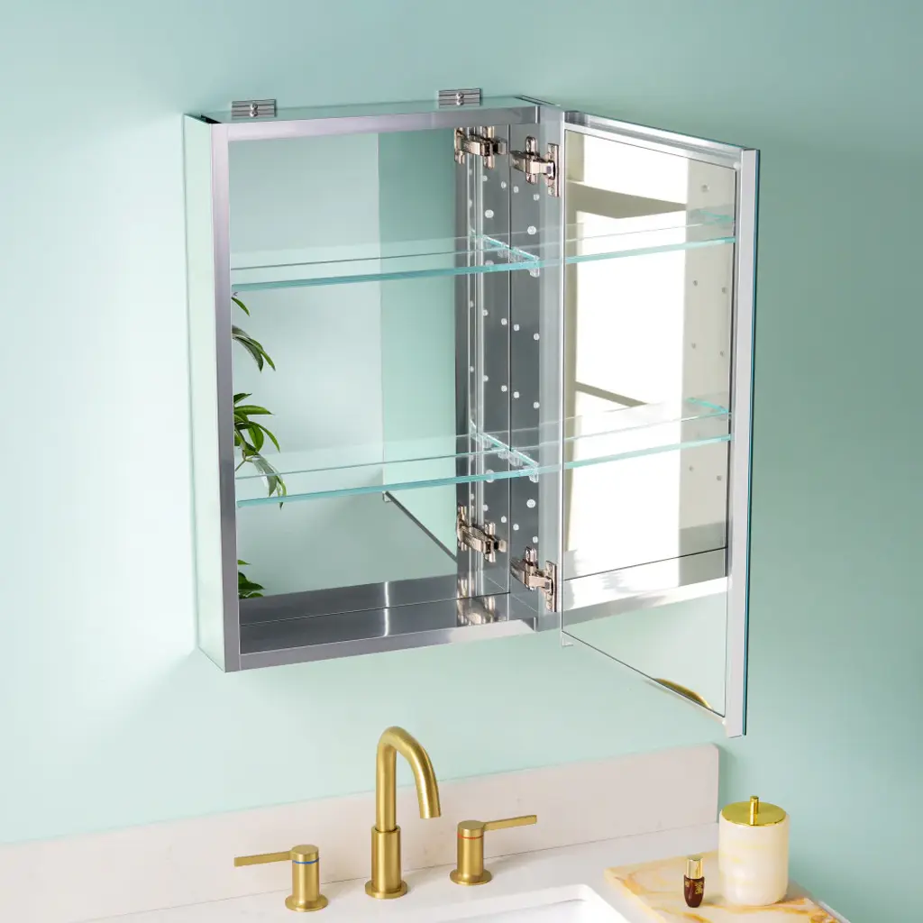 Enhance your bathroom''s style and functionality with this premium Copper-Free Tri-View Glass Mirror Cabinet. Featuring an elegant anodized chrome aluminum body, soft-close Blum® hinges, and explosion-proof glass, this cabinet combines durability and sleek design for long-lasting use. Whether wall-mounted or recessed, the flexible installation options and adjustable glass shelves provide ample storage while maintaining a modern aesthetic.• • • • Key Features:Copper-Free Construction: Resistant to corrosion and tarnishing, ensuring long-term clarity and durability.Tri-View Glass Mirrors: Tri-view glass mirrors provide a wide and clear reflection, ideal for grooming and daily tasks.Soft-Close Blum® Hinges: High-quality, smooth-functioning Blum® soft-close hinges ensure quiet, gentle door closure every time.Flexible Installation Options: Can be wall-mounted or recessed, with a surface mount kit included for easy installation.Anodized Chrome Aluminum Body: Provides a sleek, modern finish while being resistant to moisture and corrosion.Explosion-Proof Glass: Offers added safety and durability, making it a secure choice for busy bathrooms.8mm Ultra Clear Adjustable Glass Shelves: Sturdy shelves for optimal storage, easily adjustable to fit your storage needs.5-Year Limited Warranty: Enjoy peace of mind with our comprehensive warranty covering defects in materials and workmanship.• • • • Specification:Door Swing: Right SwingIncluded: Mounting HardwareMount Style: Recess/Surface MountNumber of Doors: 1Number of Shelves: 2Shelf Size W• D• H(inch): 14 5/16• 3 9/16• 5/16Weight Capacity(Lbs): 35Cabinet Size W• D• H(inch): 16• 4 13/16"• 24" Ressess Rough-in Size: 15 1/2• 3 3/4• 23 1/2"
