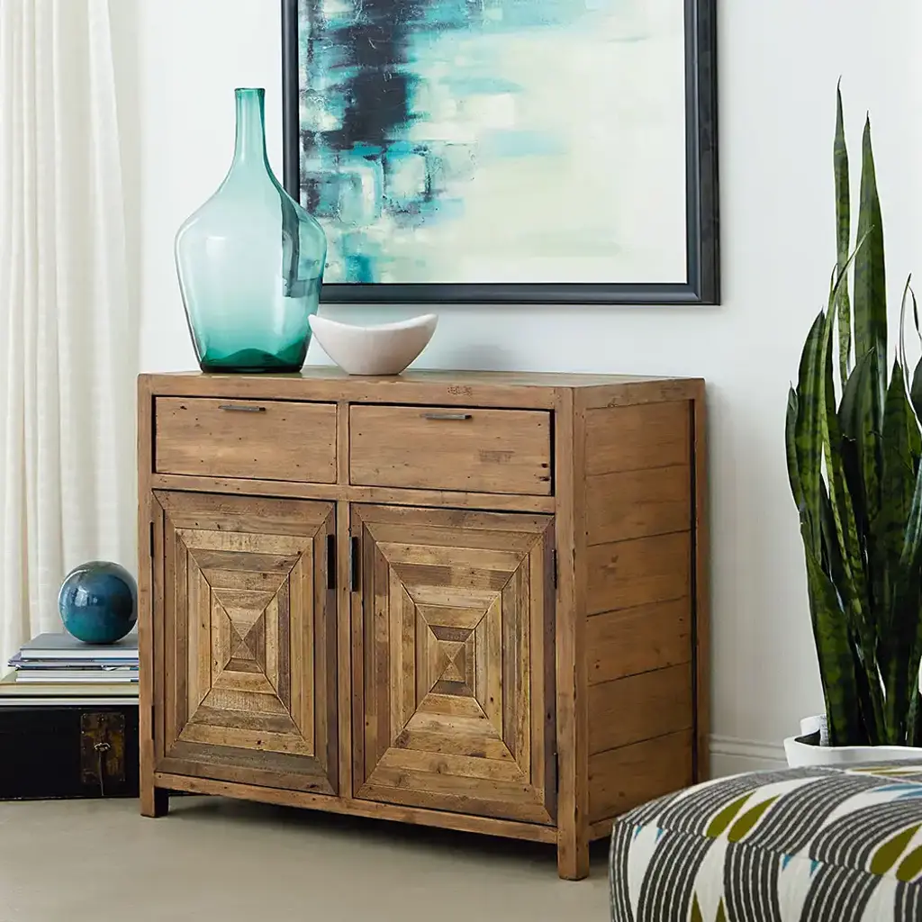 Discover the rustic charm of the Reclamation Place Accent Cabinet, a testament to sustainable design and functional beauty. Crafted from FSA-approved reclaimed wood, this cabinet tells a story of renewal with every knot and grain. Behind its weathered doors lies a world of organization: two spacious drawers for tucking away essentials, flanked by dual adjustable shelves separated by a practical partition. The sawtooth bracket system allows for customizable storage, adapting to your ever-changing needs. More than just furniture, this accent piece brings a touch of history and eco-consciousness to your space, proving that style and sustainability can coexist in perfect harmony.