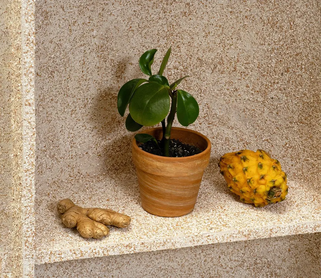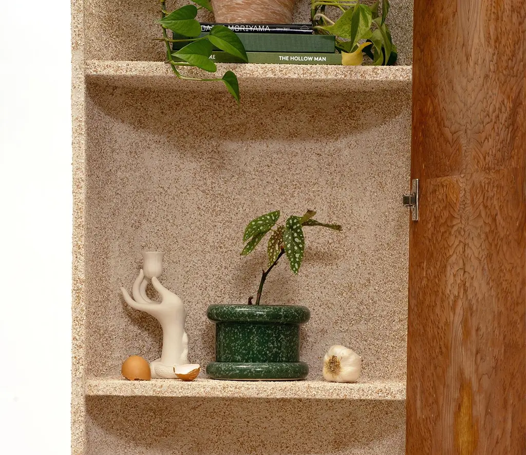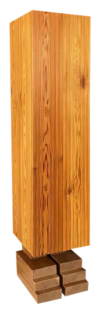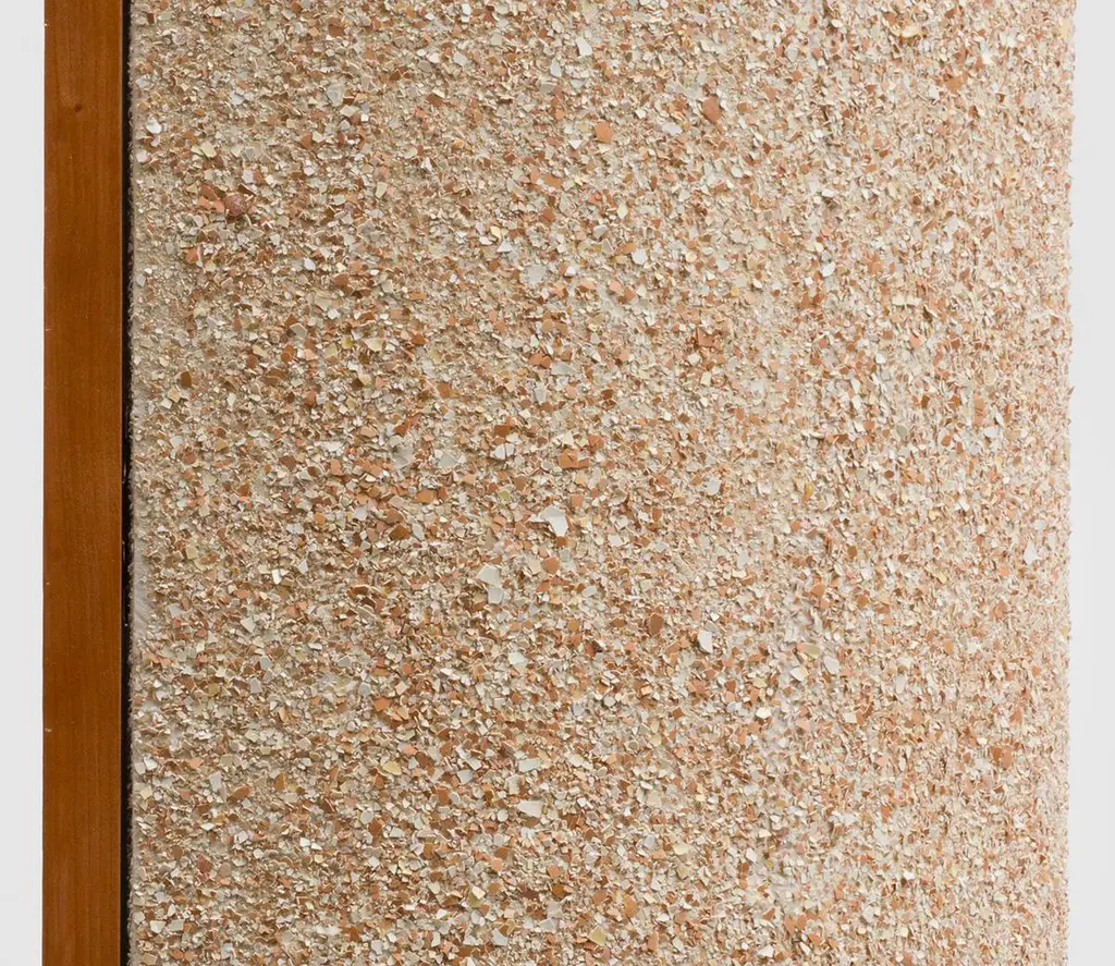 A thin monolith half moon atop a plinth of redwood burl veneer, the Special Damages cabinet has a curved back covered in — of all things — crushed eggshells. Rest Energy founder Caleb Engstrom looks at these materials as a duality: Burl wood – a warped, dense grain – is a tree’s reaction to sickness or duress, a desperate protection strategy. As beautiful as it may be, it is a byproduct of something unwanted. Crushed eggshells, symbolizing fragility and new beginnings, cover the cabinet's back and interior. The use of both key materials here is about outcomes and their unpredictability. Where we may operate with intention, it’s the unknowable, the mystery outside of ourselves, something unknown that is present.This piece can be made in custom sizes.