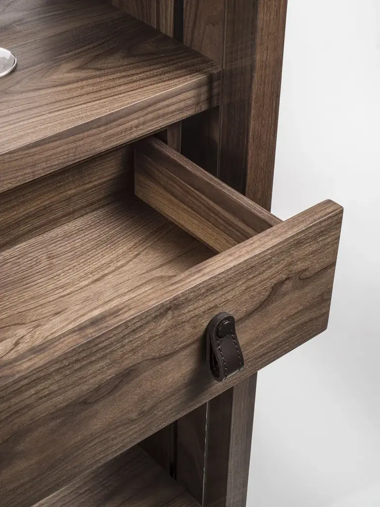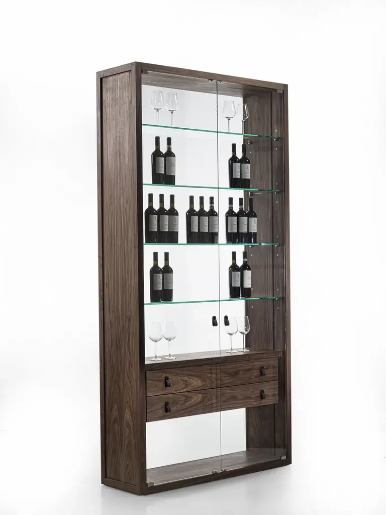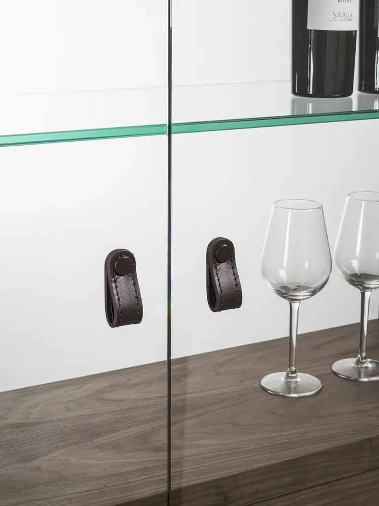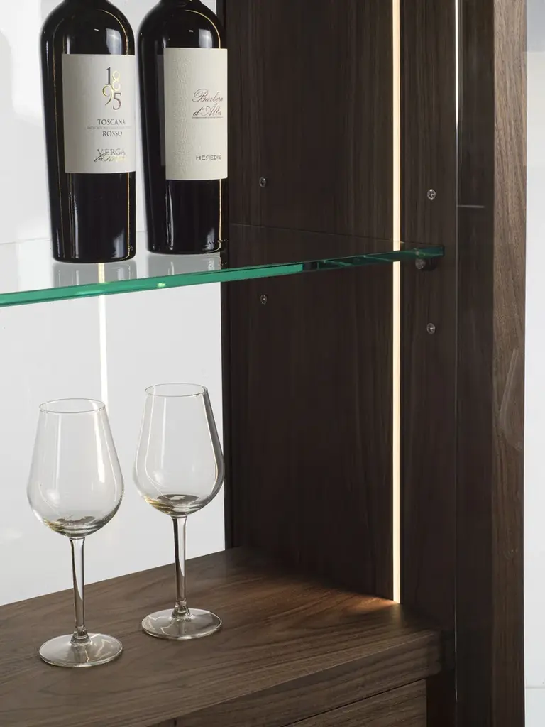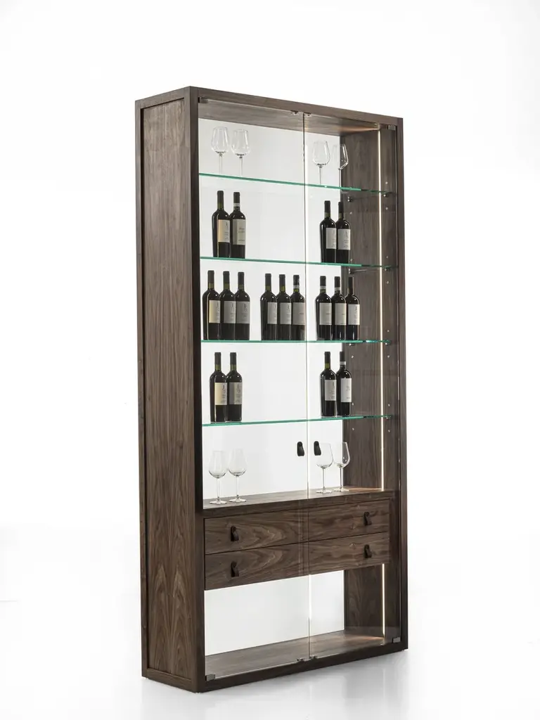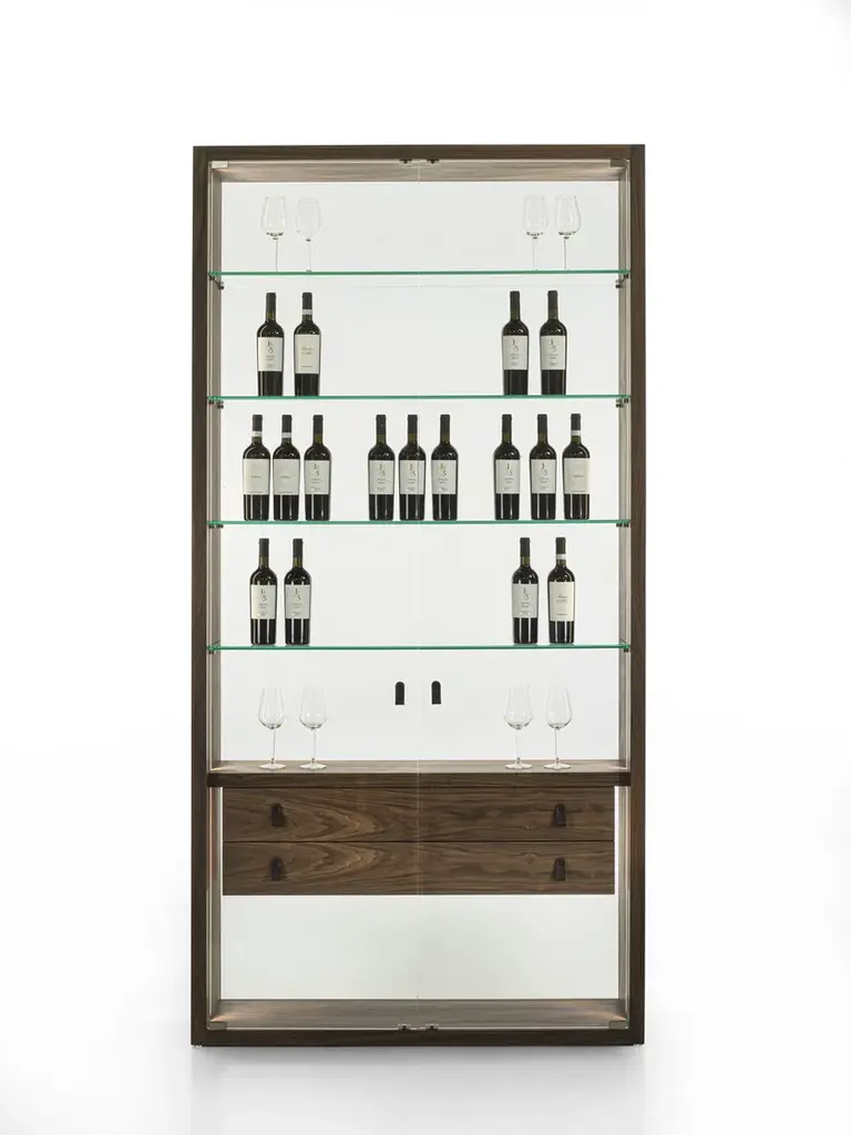 Reflex is a high display cabinet with solid wood and blockboard structure, characterized by doors, four shelves on the inside, and a glass back. Equipped with an internal chest of drawers composed of two drawers. Leather handles for ease of opening. Lit by a system of vertical LED lights.