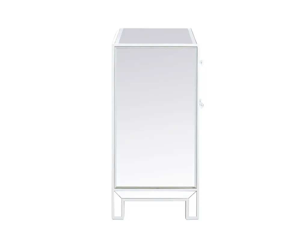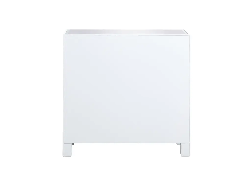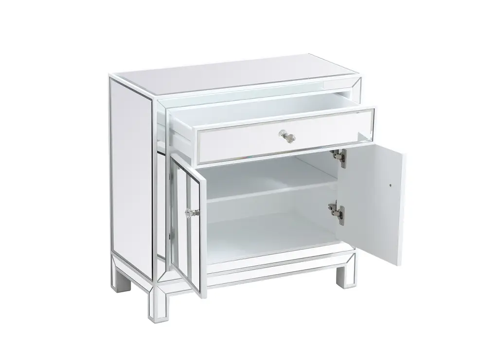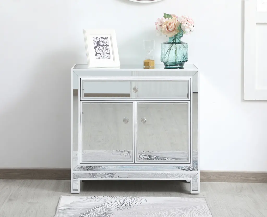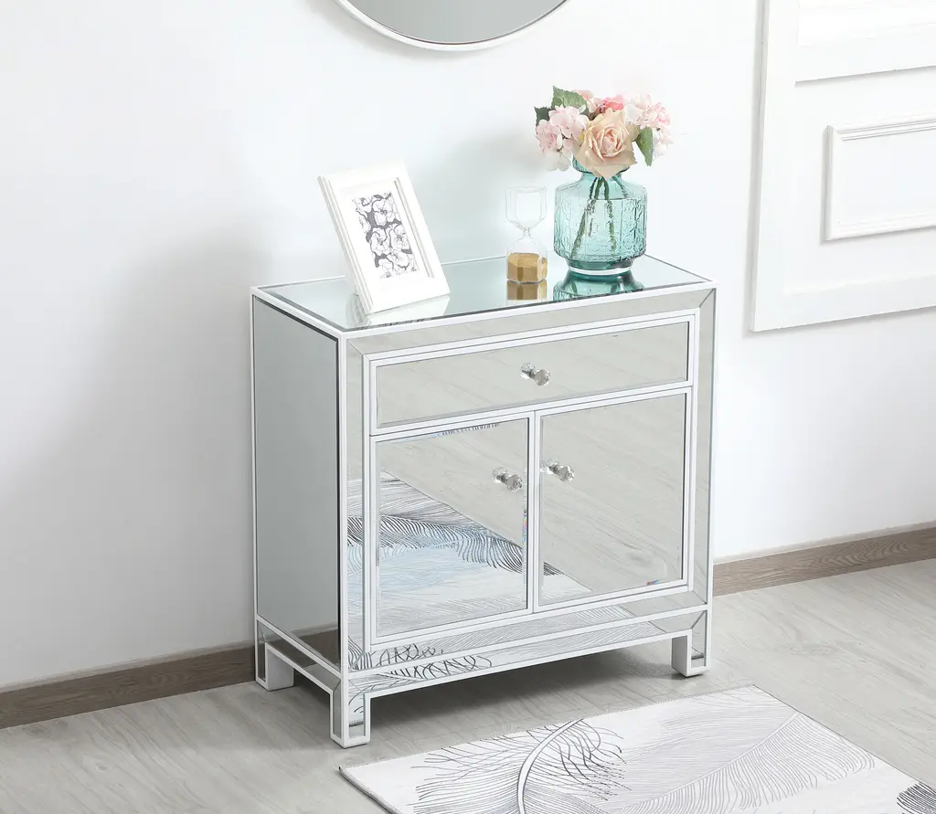 A perfect balance of contemporary style and practical utility, this chic one drawer, two doors mirror cabinet will enhance any room in your home. Featuring a hand painted finish, top quality mirror panels in distinctive mitered corner, jewel like crystal door knobs, it will provide you with stylish storage space you often need.