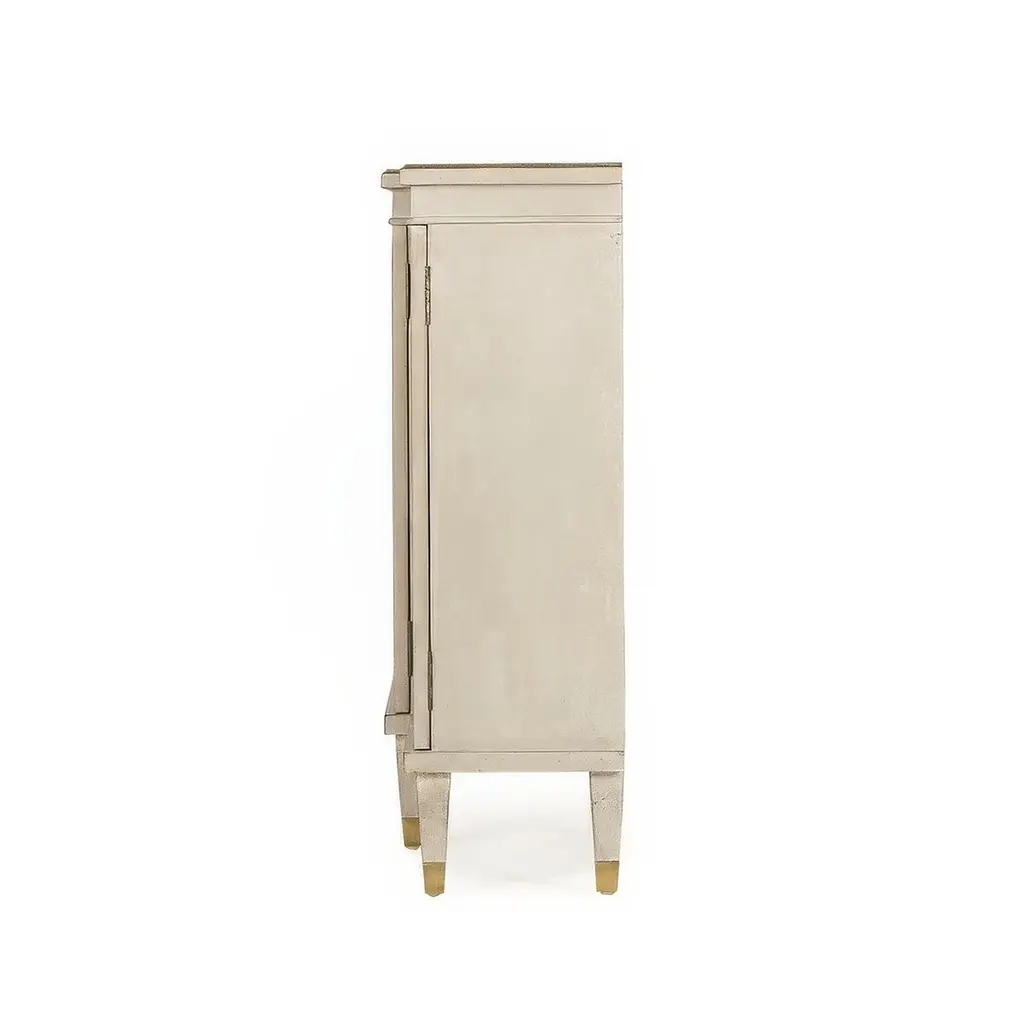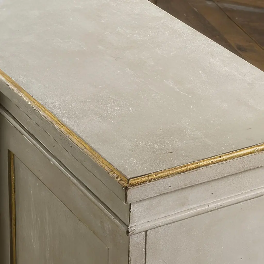 Gray Painted Credenza combines sophisticated style with delicate gilt accents that highlight its classical architectural details. The antiqued grey painted finish is applied to the breakfront form cabinet.With four doors that open to interior storage space each with an adjustable shelf. The elevated design on tapered legs creates an airy presence, making it a versatile addition to formal dining rooms, entryways, or living spaces where classical sophistication is desired.Dimensions: 62" W x 12.5" D x 36.5" H