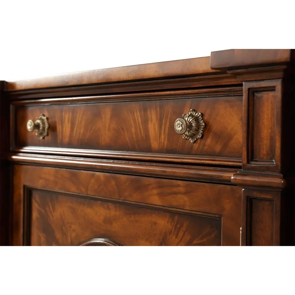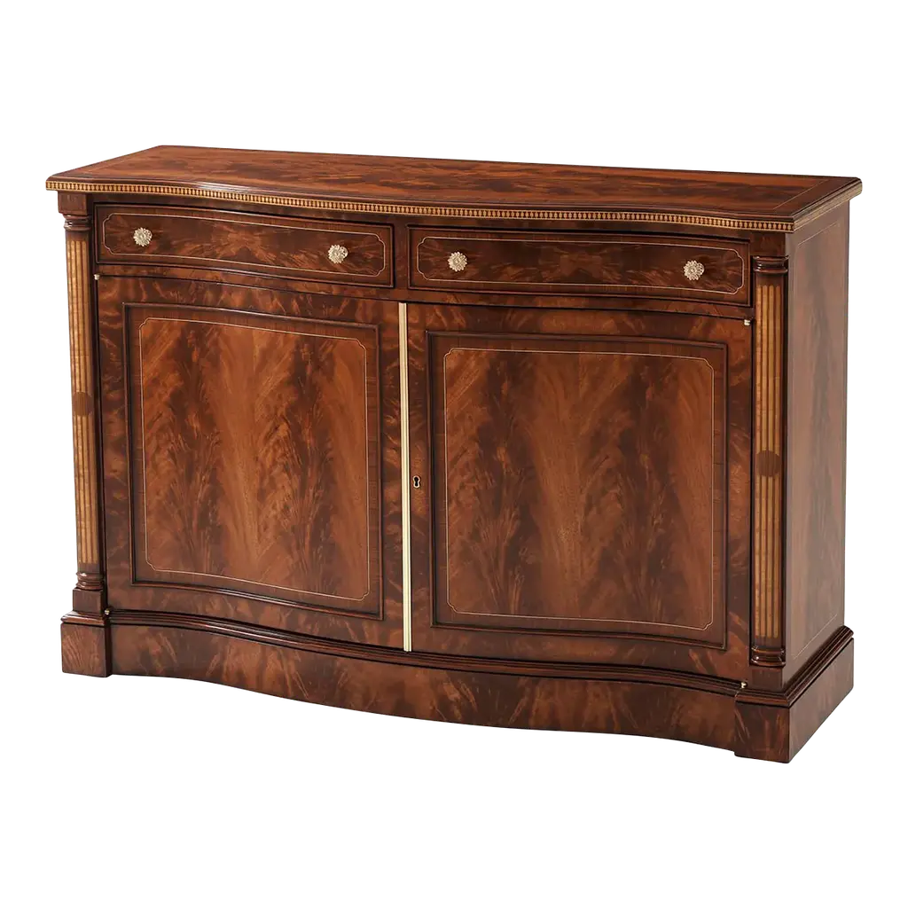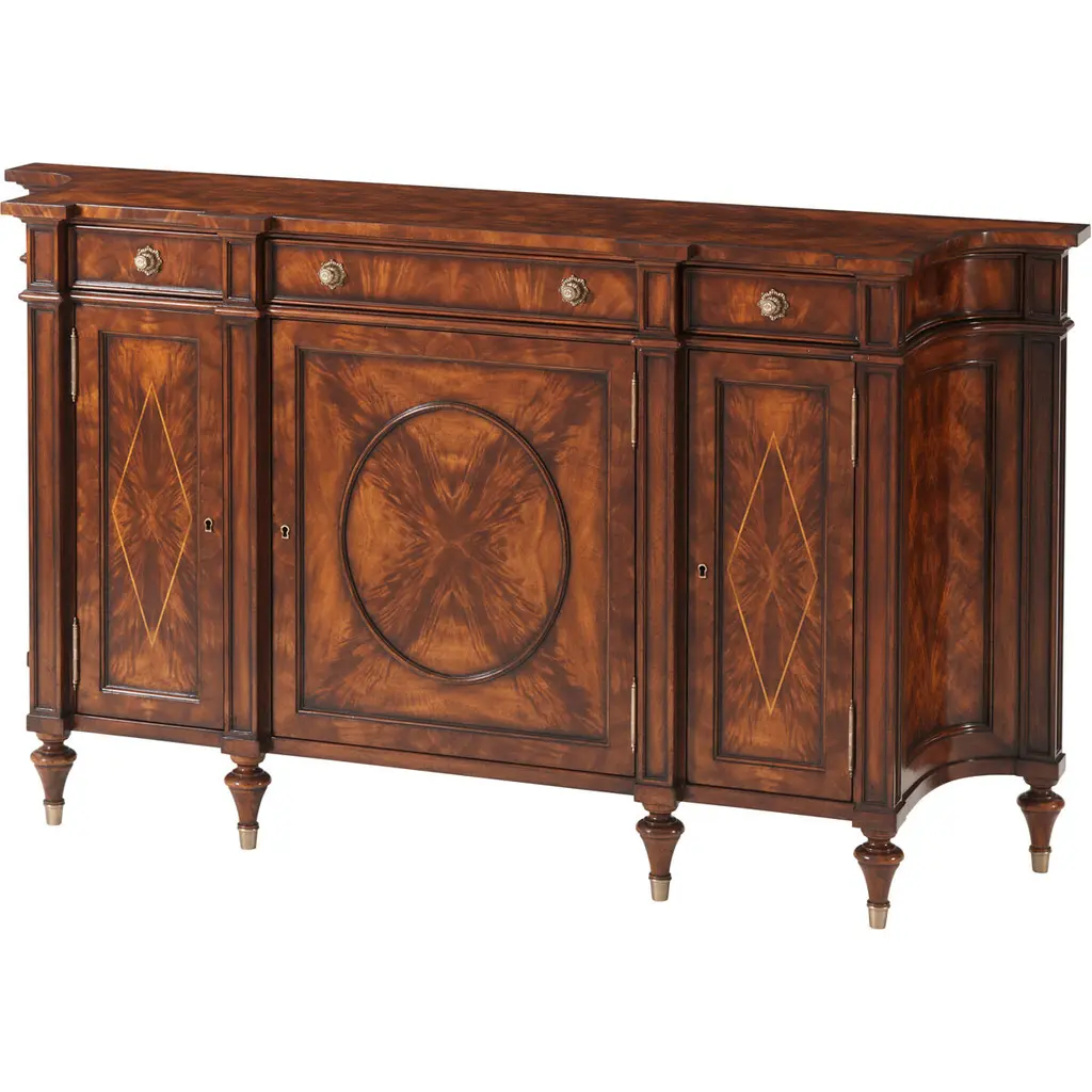 A fine Regency style mahogany and burl mahogany banded side cabinet, with three frieze drawers above corresponding oval panel and lozenge inlaid doors enclosing adjustable shelves, with concave sides, on turned legs with brass cappings. Dimensions: 64" W x 16" D x 36.25".