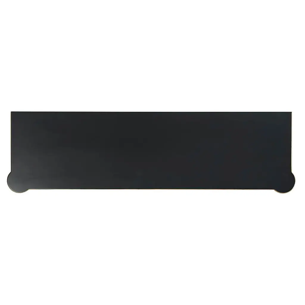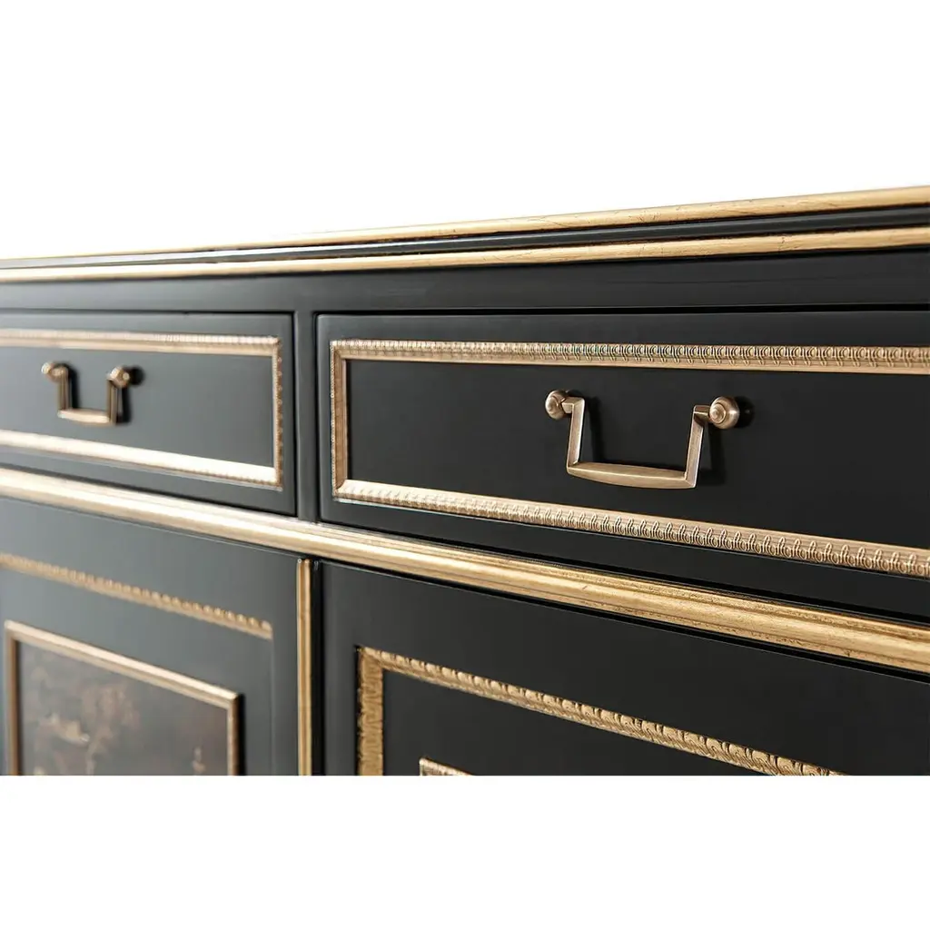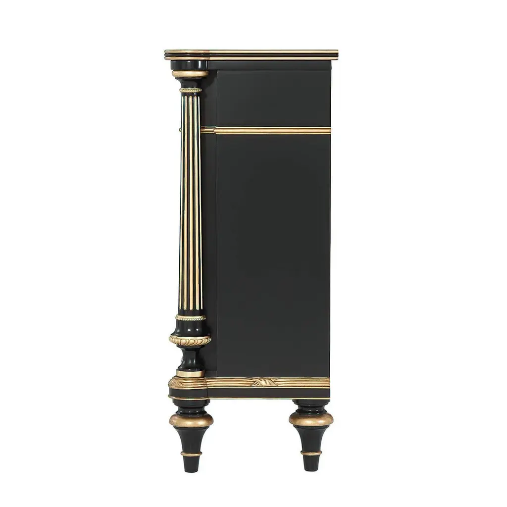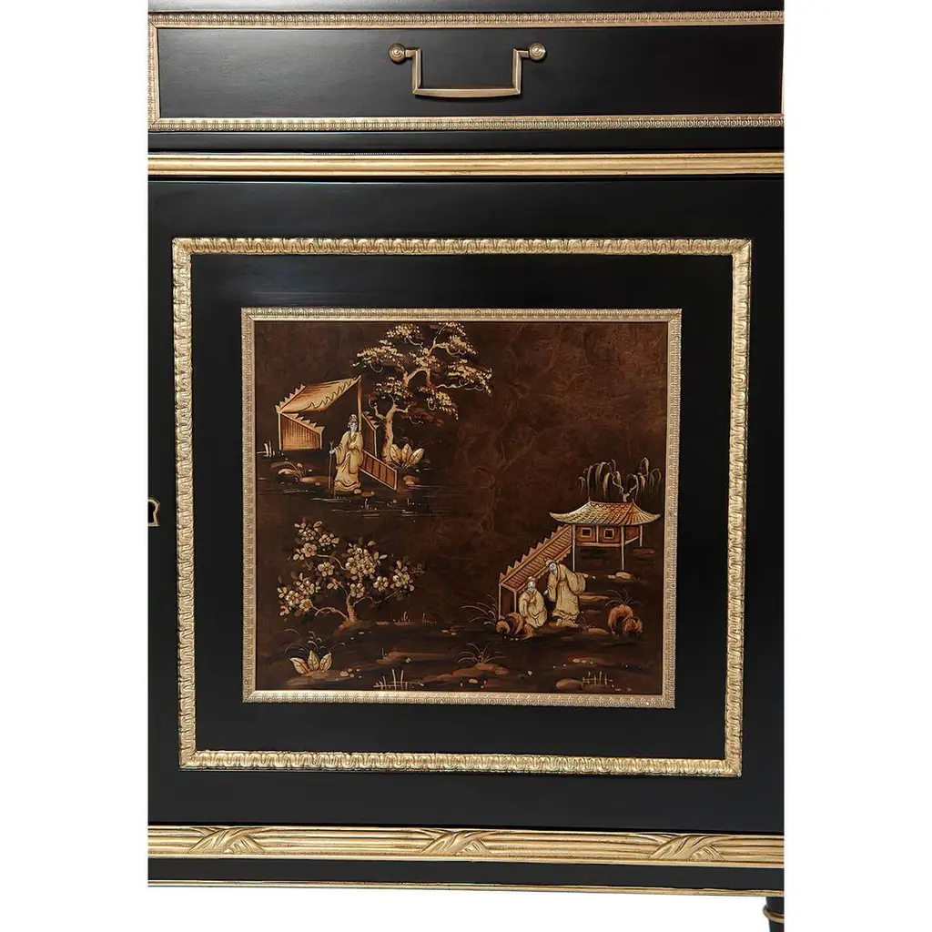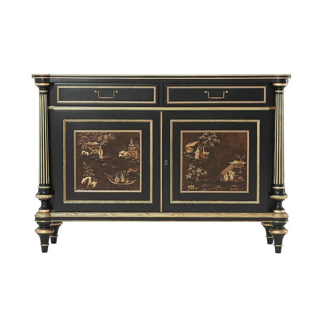 An ebonized mahogany and parcel gilt chinoiserie side cabinet, the rectangular molded edge top with protruding rounded corners, above two brass molding paneled drawers with brass handles, above two brass molding paneled and carved doors with hand painted chinoiserie scenes, the base with bound reed carved details flanked by turned and fluted columns and on turned and tapering legs.Dimensions: 46" W x 13" D x 32" H