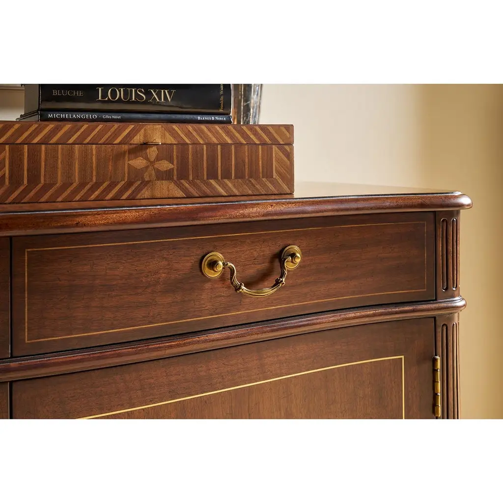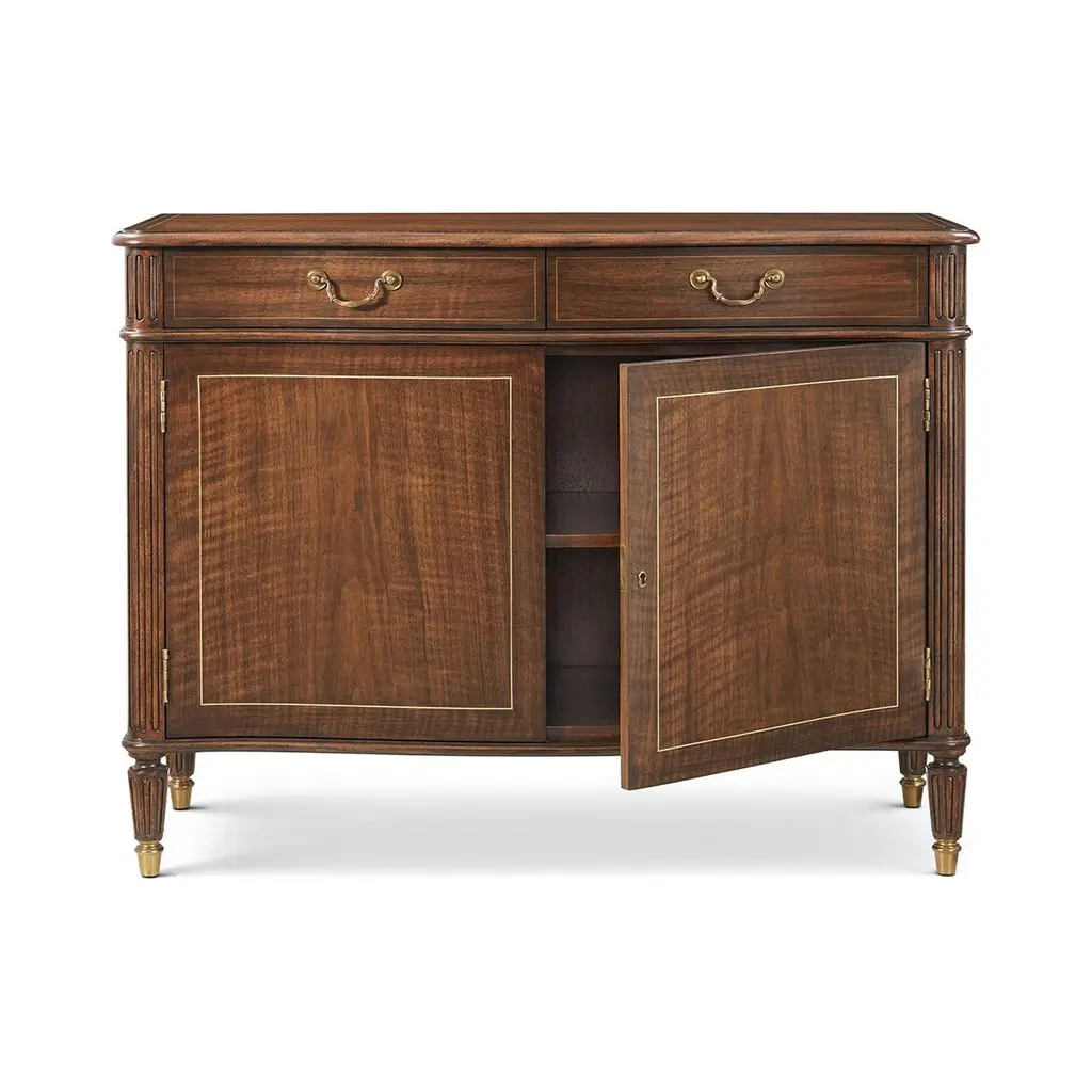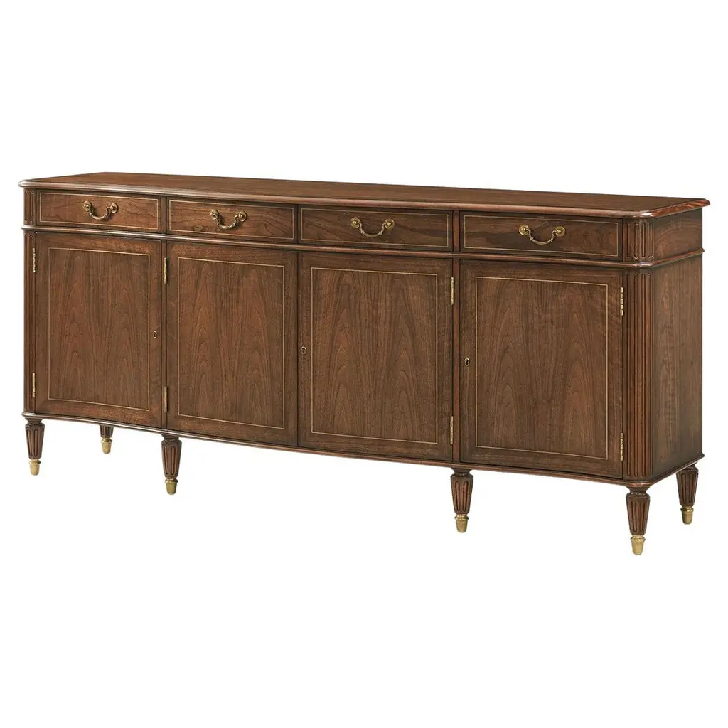 Meticulously crafted to reflect the refinement of early 19th-century English design. Made from beautifully figured wood in a warm walnut finish, it features four paneled doors with fine brass inlay and flanked by reeded quarter column stiles. The serpentine shaped top is arranged with two drawers that provide ample storage, all adorned with classic brass pulls.Resting on reeded and tapered legs capped with brass sabots, this sideboard offers stately balance and architectural character. The subtly bowed front and refined proportions make it a timeless centerpiece for formal dining rooms or sophisticated interiors.Dimensions: 48" W x 20" D x 36.5" H