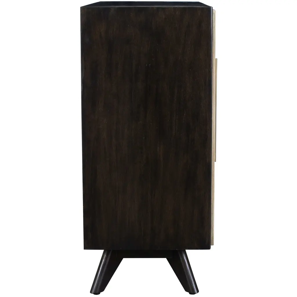 This 2 Door Cabinet Comprised Of Mango And Java Wood Veneers Presents A Striking Contrast With Its Sleek Dark Walnut Finished Case And Light Toned Alternating Grain Direction Doors. Creating A Dynamic Juxtaposition That Adds Depth And Visual Intrigue, Finished With Elegant Gold Finished Hardware. Has Soft Close Hinges.