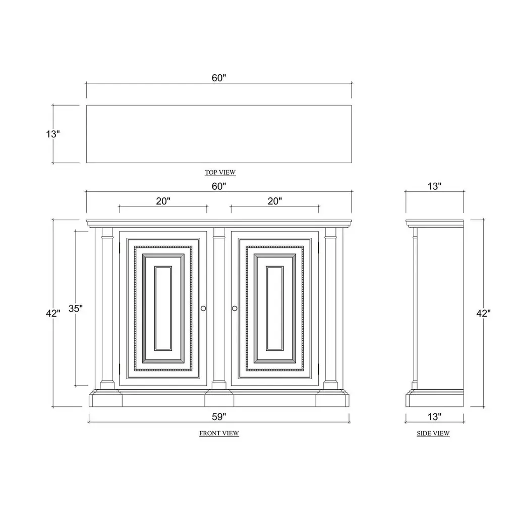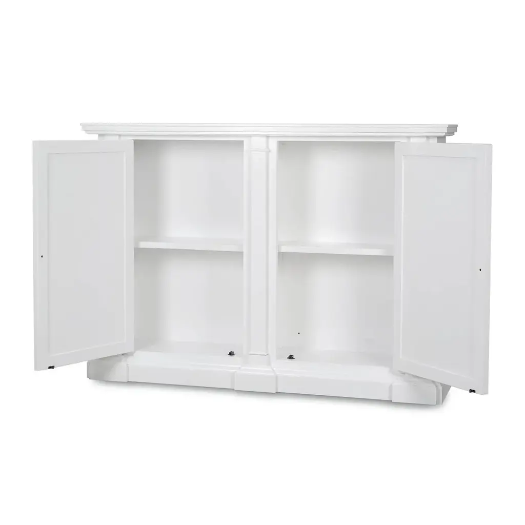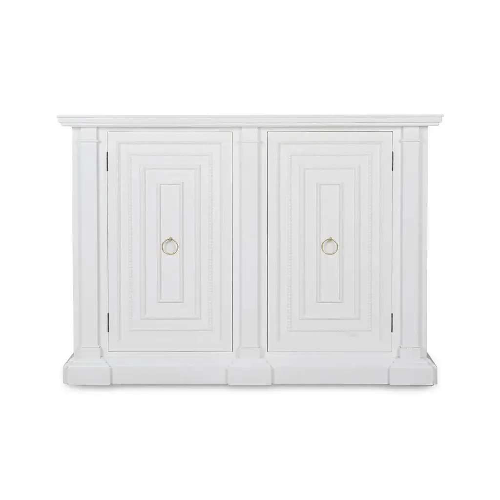 With its stunning chic and sophisticated design, this 42" tall cabinet will add a touch of class to any room. Perfect for keeping your space organized and stylish! Inspired by the French Renaissance period, this mahogany cabinet is hand-painted in our True White finish. The two paneled trimmed cupboard doors, with brass ring handles, open to reveal shelves with ample storage. The rectangular top, with column form styles, are all raised on a stepped plinth base. Dimensions: 60" W x 13" D x 42" H
