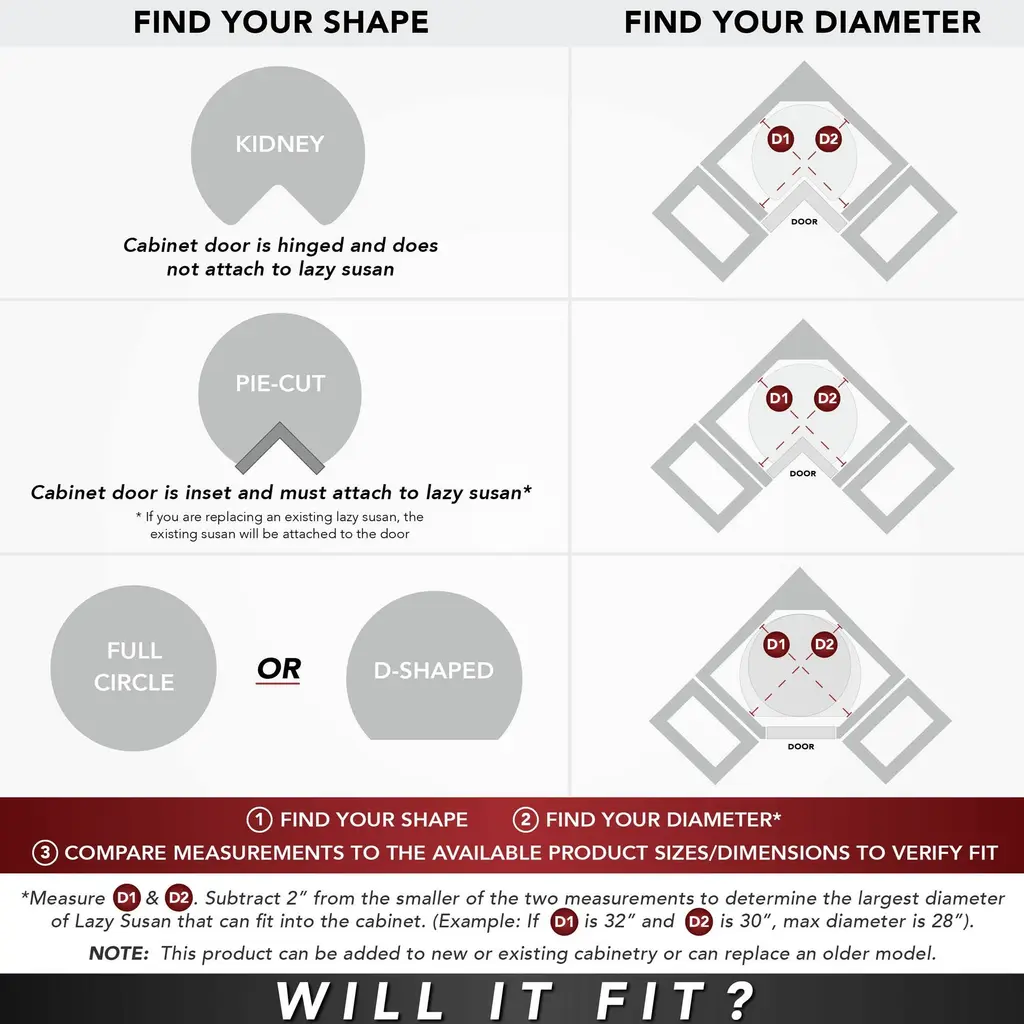 The back of a tall wall kitchen or bathroom corner cabinet is traditionally one of the most difficult to access storage spaces in the kitchen. This seamless solution for maximizing corner cabinet space gives swivel-turning access to every section of your shelf space. No need to drag a step ladder out and empty the cabinet's contents to reach what you need in the back of your cabinet when you have a Value Line Full-Circle Lazy Susan from Rev-A-Shelf installed in your corner wall cabinet. Available in single, double, and triple shelf options that independently rotate, making seeing and getting to your items a breeze. Available in 18" and 24" diameters, this full circle shaped lazy susan comes with bottom mount or Twist-n-Lock telescoping hardware options with adjustable molded hubs that make moving the polystyrene shelves effortless. The telescoping shaft adjusts from 26'' to 31'' in height. Constructed from injection-molded polymer plastic, these lazy Susans are durable and built to last. Whether you are replacing an old unit or just adding a lazy susan to your upper or corner wall cabinets, you will not be disappointed with the high-quality design and extra organized space this system brings to your cabinet. The entire system installs easily with the included mounting hardware. Double check your cabinet's opening (inside dimensions) to allow the best fit. Measure side to side (width), front to back (depth or length), and top to bottom (height). Double check to make sure your product is within measurements, and don't forget to take into account any obstructions (plumbing, hinges, etc.). Experience superior kitchen organization with the Rev-A-Shelf Circle-Shaped Lazy Susan. Full-Circle 2-shelf 20'' lazy susan is made to maximize storage space in your kitchen to keep canned food and spices organized Full Product Dimensions: 20"W x 20"D x 26"H Designed for corner wall cabinets with a minimum measurement of 20"W x 20"D x 26"H and maximum measurement of 20"W x 20"D x 31"H Adjustable post will accommodate a 26'' to 31'' interior cabinet height Constructed with injection molded polymer plastic designed for increased durability All 2 and 3 Shelf Lazy Susans for wall or base corner cabinets must first be assembled inside of the cabinet before final installation Top shelf height is adjustable once installed in your kitchen cabinet for customization Includes independently rotating hardware for easy installation Warranty: Limited lifetime warranty Product Type: Lazy Susan Color: White Material: Plastic