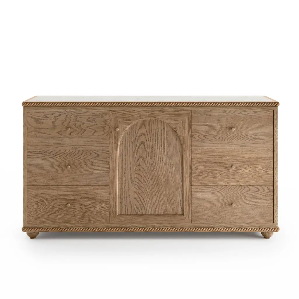 The Rey Collection's signature twisted rope detail and clean-lined simplicity combine in a fresh take on classic form. This piece features solid oak, six drawers with dovetail joinery and soft-close glides, as well as a center cabinet with an adjustable shelf. Offering substantial storage, it is well-suited as a dresser, sideboard, or credenza. Shown here in our Summer Aged Oak with Crema Marble top. Wood — Also available in our Sunkissed Oak, Natural White Oak, Riviera Oak, Canyon Oak, Dark Walnut and Heirloom Walnut finishes. Marble — Honed finish, also available in Rojo Marble, Nero Marble, Ceppo Grey MarbleDimensions: 62.5”W x 18.375”D x 33.75”HIncludes soft-close drawers and a center adjustable shelf in the center cabinet. All of our pieces are bench-made in Los Angeles by local artisans. Current lead time: 16-22 Weeks + transit time. Inquire about customizations, alternate materials & finishes, as well as expedite options. About August Abode:August Abode is a moving portrait of California life, an invitation to reconnect with the allure of nature to enhance our everyday lives. Founded in Los Angeles in 2019 by designer Stefani Stein, August Abode is an artisan-made home collection capturing the West Coast spirit of endless summer. We make relaxed and refined statement essentials inspired by the beauty of living in the Golden State.Through observation and abstraction of nature, we design furniture and wallcoverings in which form, function, and fine craftsmanship have the ability to positively impact our everyday lives through our homes. We are committed to making responsibly, not overproducing. Our view is to make future heirlooms. Discouraged by the impact of Los Angeles landfills being the largest in the county, we aim to reduce our participation in the epidemic of thoughtless production. Our made-to-order pieces encourage a steady flow of business to LA’s rich artisan trade community, while keeping our production process local and environmentally ethical. We are investing in the next generation of skilled makers, to encourage a sustainable and vertical model that reduces wasteful production.