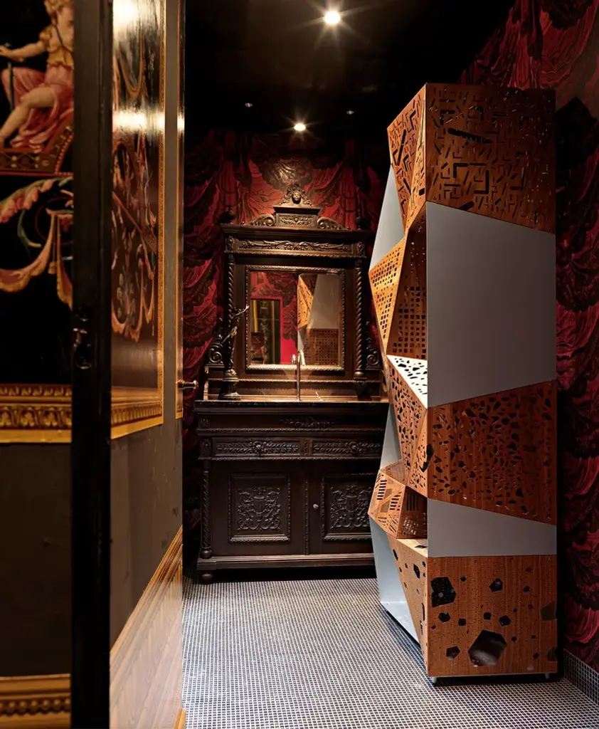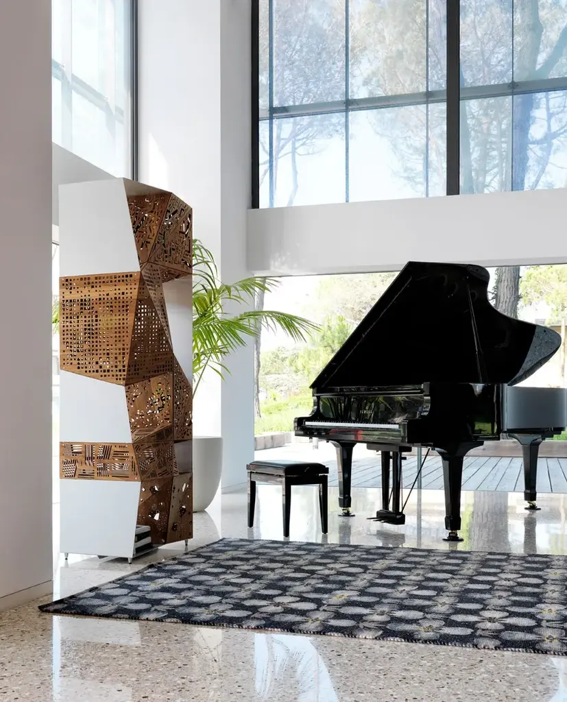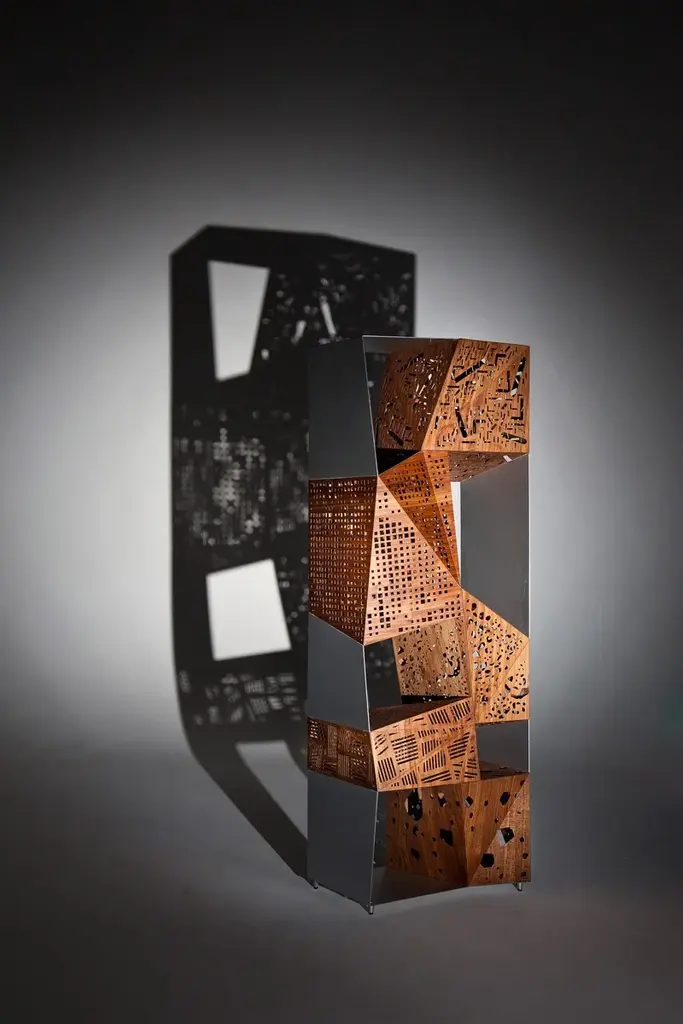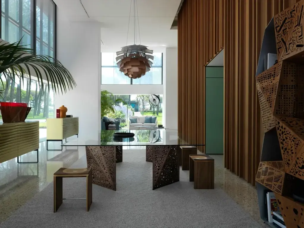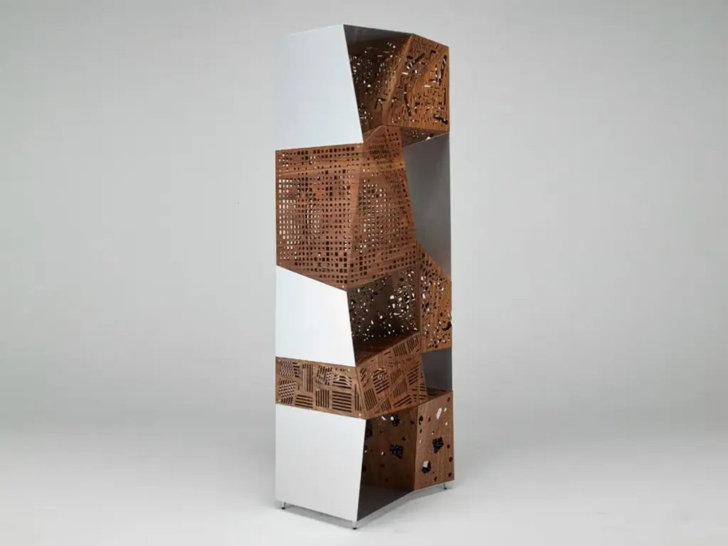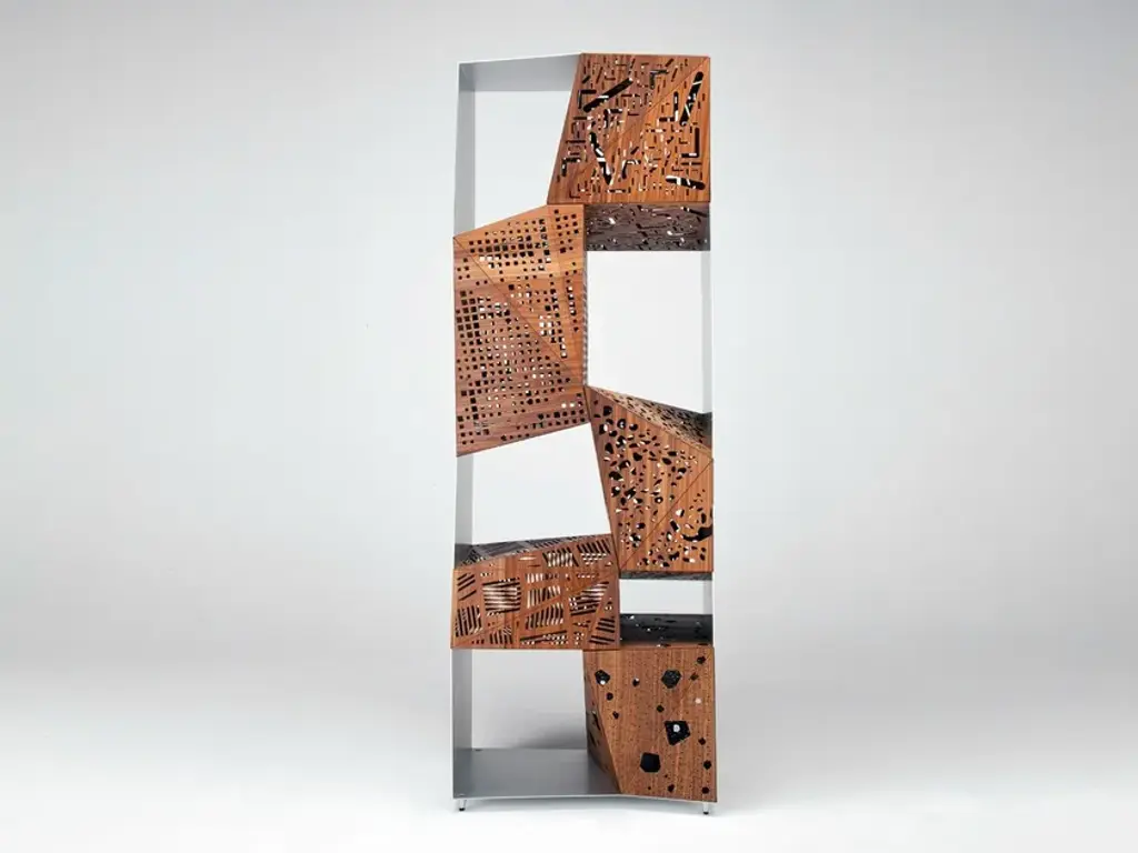 A true work of art, it consists of an aluminium frame and #ve elements made of origami-folded 2-mm wooden sheets thanks to a complex and patented technological process. Riddled Totem conveys great charm and elegance through its sculptural volumes, already characterized by the typical perforated texture of many famous works by Steven Holl. The result is afaceted container, light and bright as a diamond but made of wood following Horm.it’s unmistakable style.Five different containers with door with magnetic closure made from a material designed and patented by Horm.it, composed of a sandwich of wood and fabric 2.2 mm thick, which, thanks to a number of superficial incisions made with a laser cutter, can be folded up like origami. Structure made from anodized aluminium, 3 mm thick. Adjustable feet made from anodized aluminium. Wooden crate.FINISHStructure: aluminiumWooden elements: walnutDIMENSIONS (LxdXH)cm 70x50x205 - 27.6”x19.7”x 80.8”The originality and workmanship of its legs are the outstanding features of the Riddled table, which incorporates the notion of porosity found in multiple architecture works by Steven Holl. The thin sheets of wood, folded through laser engraving, make this project even more spectacular in its apparent defiance of the laws of physics. These two legs, akin to origami sculptures, allow the passage of the internal light to create a myriad of lights and shadows.Extra-clear tempered glass top with polished edge, 12 mm thick. Legs made from a material designed and patented by Horm.it, composed of a sandwich of wood and fabric 2.2 mm thick, which, thanks to a number of superficial incisions made with a laser cutter, can be folded up like origami. The stainless steel plates, measuring 30 mm in diameter and 10 mm in height, are fixed with M6x18 screws on the triangular frame made of solid wood and attached with UV adhesive onto the glass top. The legs are fixed on the frame with studs with galvanized thread and flat point. Optional LED system with rechargeable batteries (6 hour battery life) on the inside of the legs. FINISHFeet: walnutTop: tempered glass
