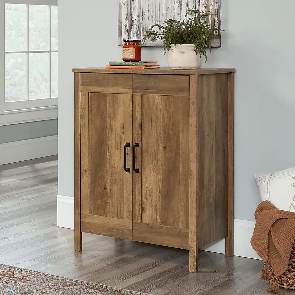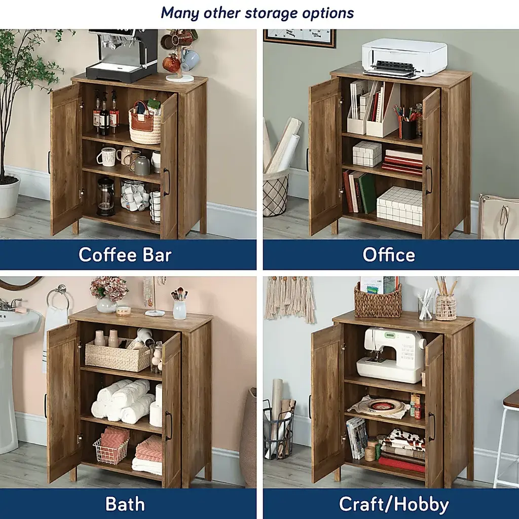 The Ridgesun brown storage cabinet has hidden storage behind the doors that will help control clutter and optimize small spaces. Two adjustable shelves provide versatile storage options. Customer assembly is required.
