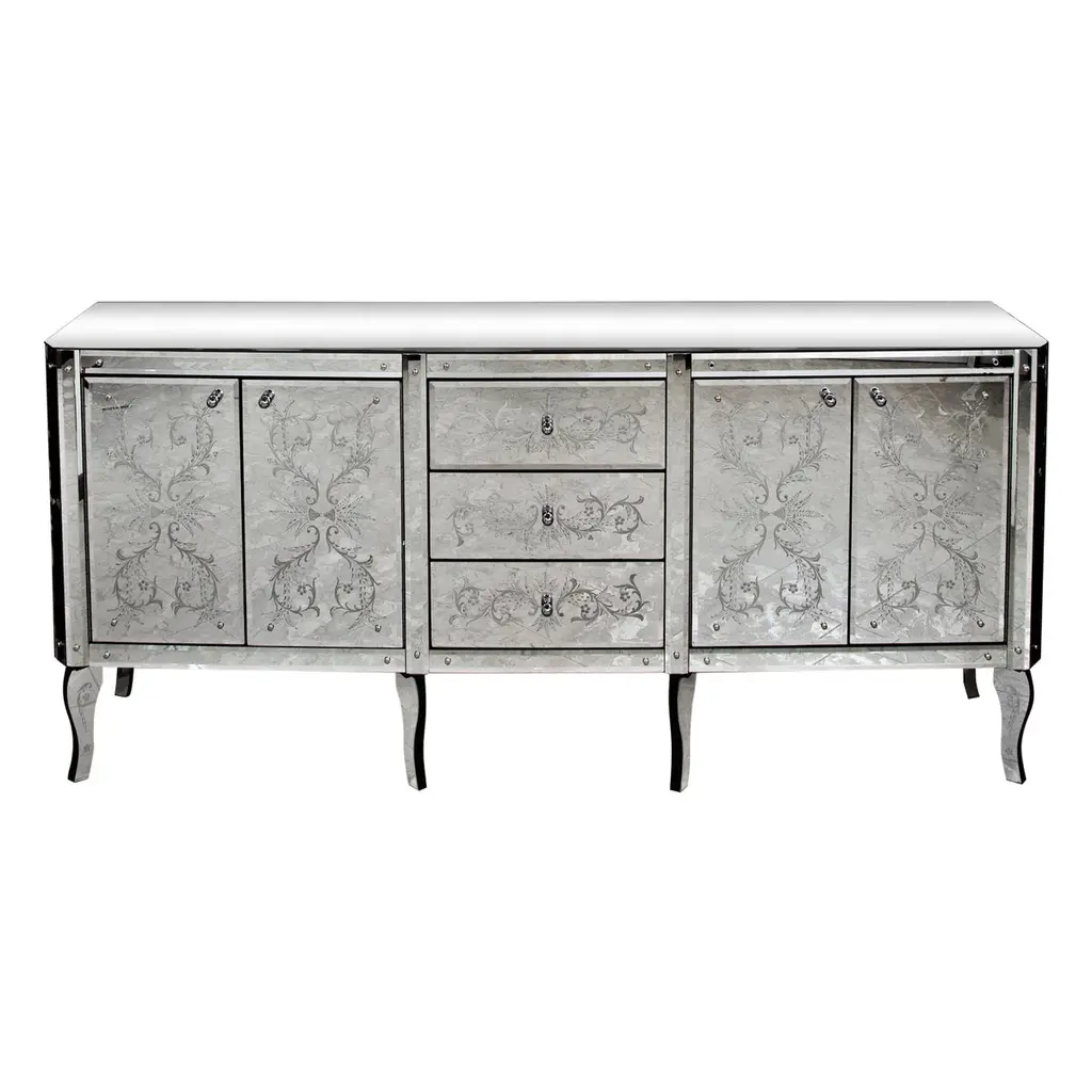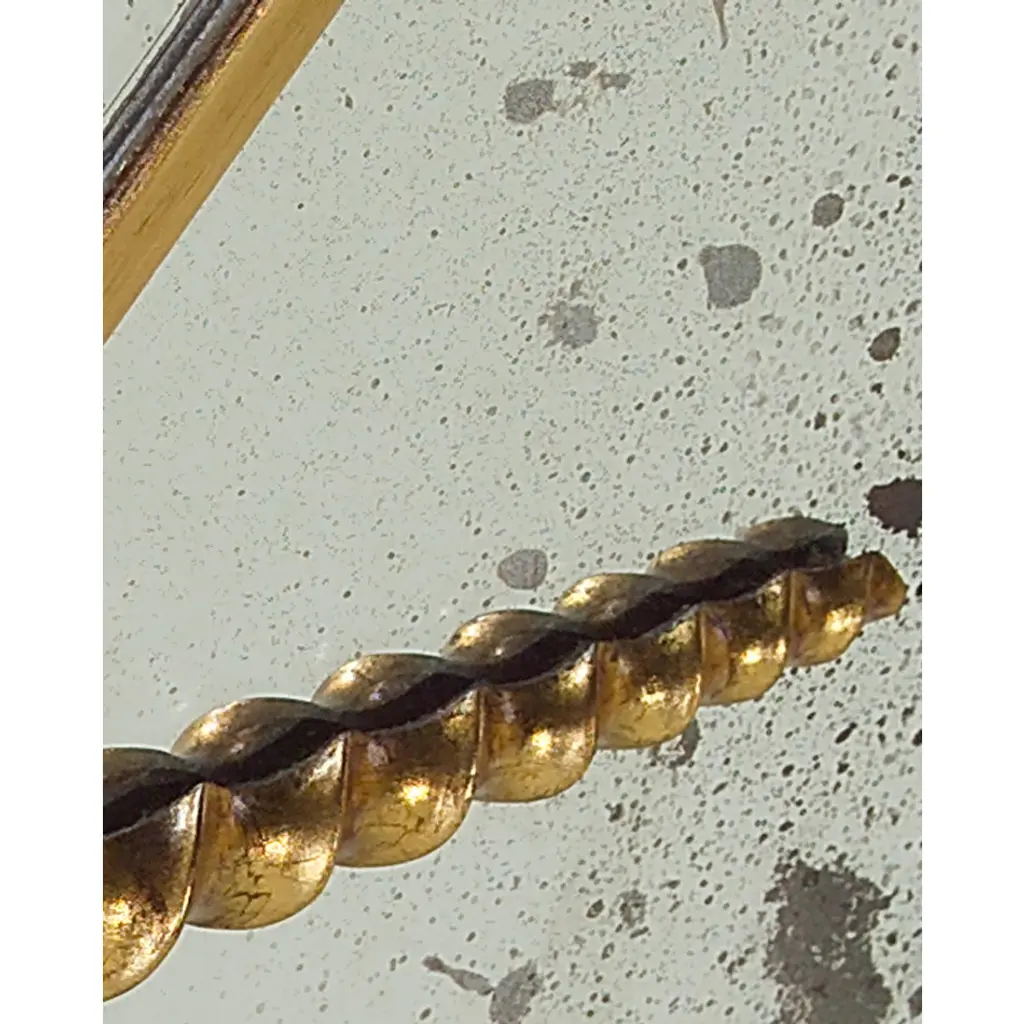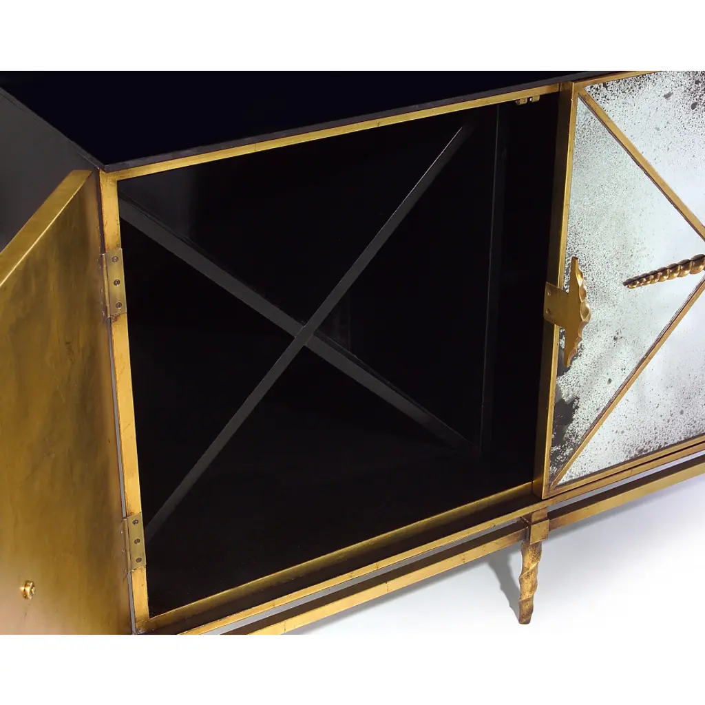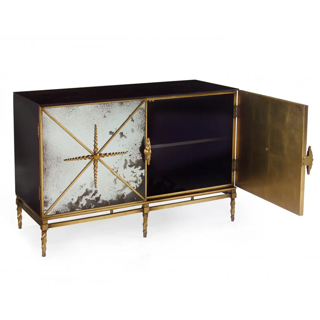Below the black glass top, the doors and steel base frame are finished in old gold, while the ends are black lacquer. The doors have a central, decorative, carved spiral twist feature applied over foxed mirror panes. The spiral twis