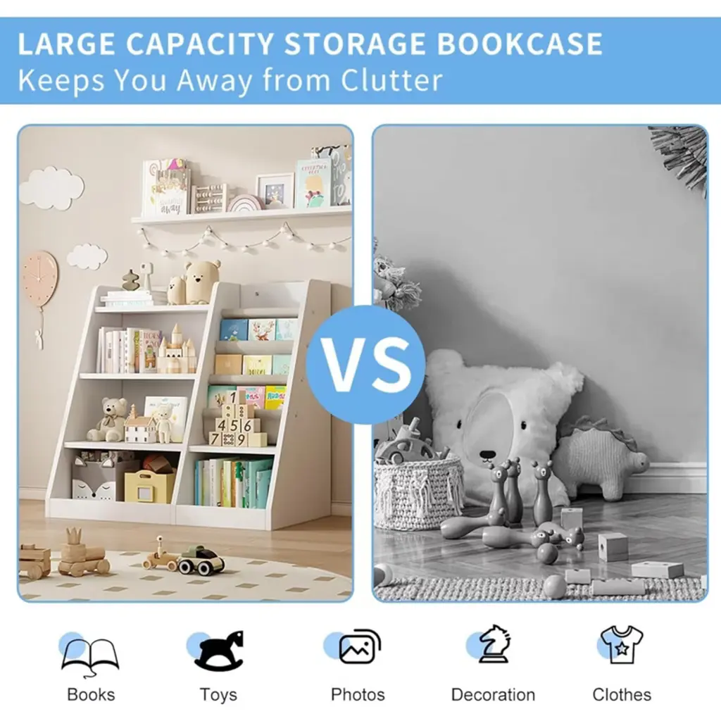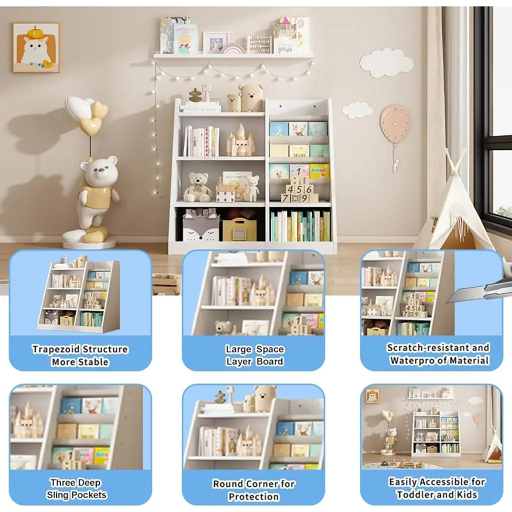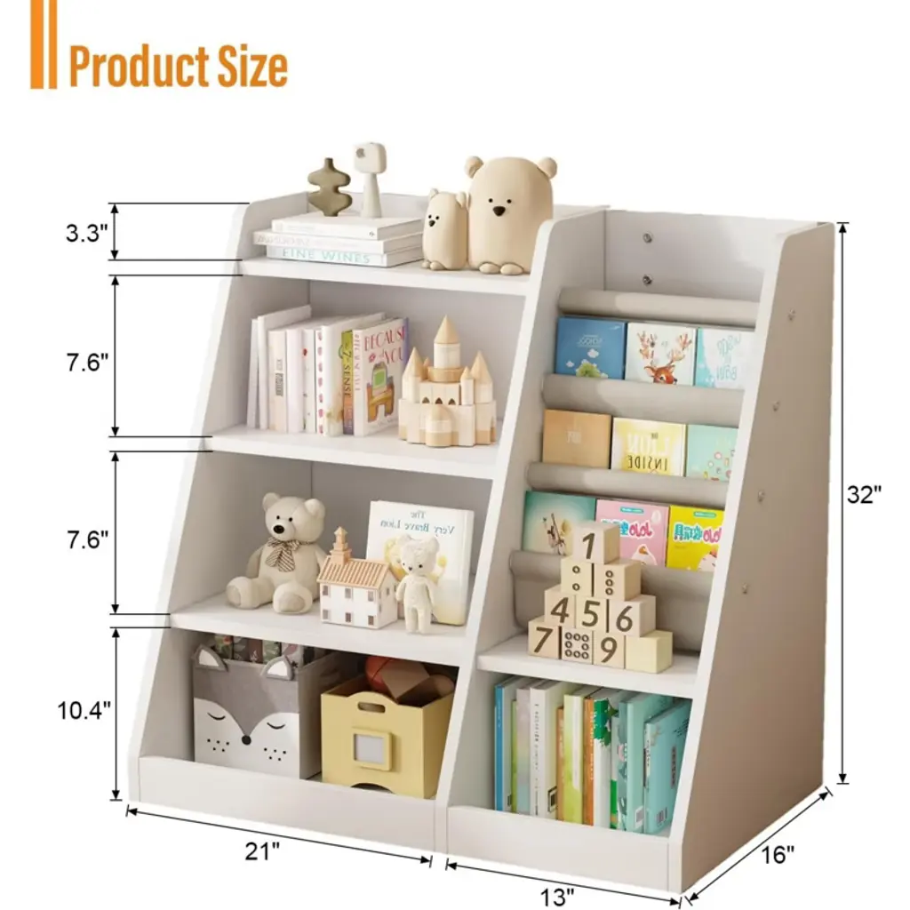 Simplify Storage & Spark Independence with the 4-Tier Wooden Kids Bookshelf.The Wooden Kids Bookshelf is designed to grow with your child while keeping their spaces tidy and engaging. Its easy-to-use sling pockets allow even the youngest toddlers to identify and grab their favorite books by the cover, turning cleanup time into a fun, independent activity. The sturdy, low-profile design (31.5”H) ensures preschoolers can safely access all four tiers, whether storing storybooks, coloring sets, or plush toys.Crafted for effortless adaptability, this Montessori-inspired bookshelf blends seamlessly into any room. Use it as a toy organizer in playrooms, a reading nook centerpiece, or a classroom storage cabinet. The wipeable materials and rounded corners make maintenance a breeze, while the anti-tip kit guarantees peace of mind for parents. By combining practical storage with child-centric accessibility, this bookshelf helps cultivate lifelong organizational habits—one tidy shelf at a time.
