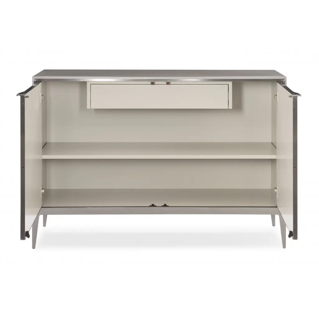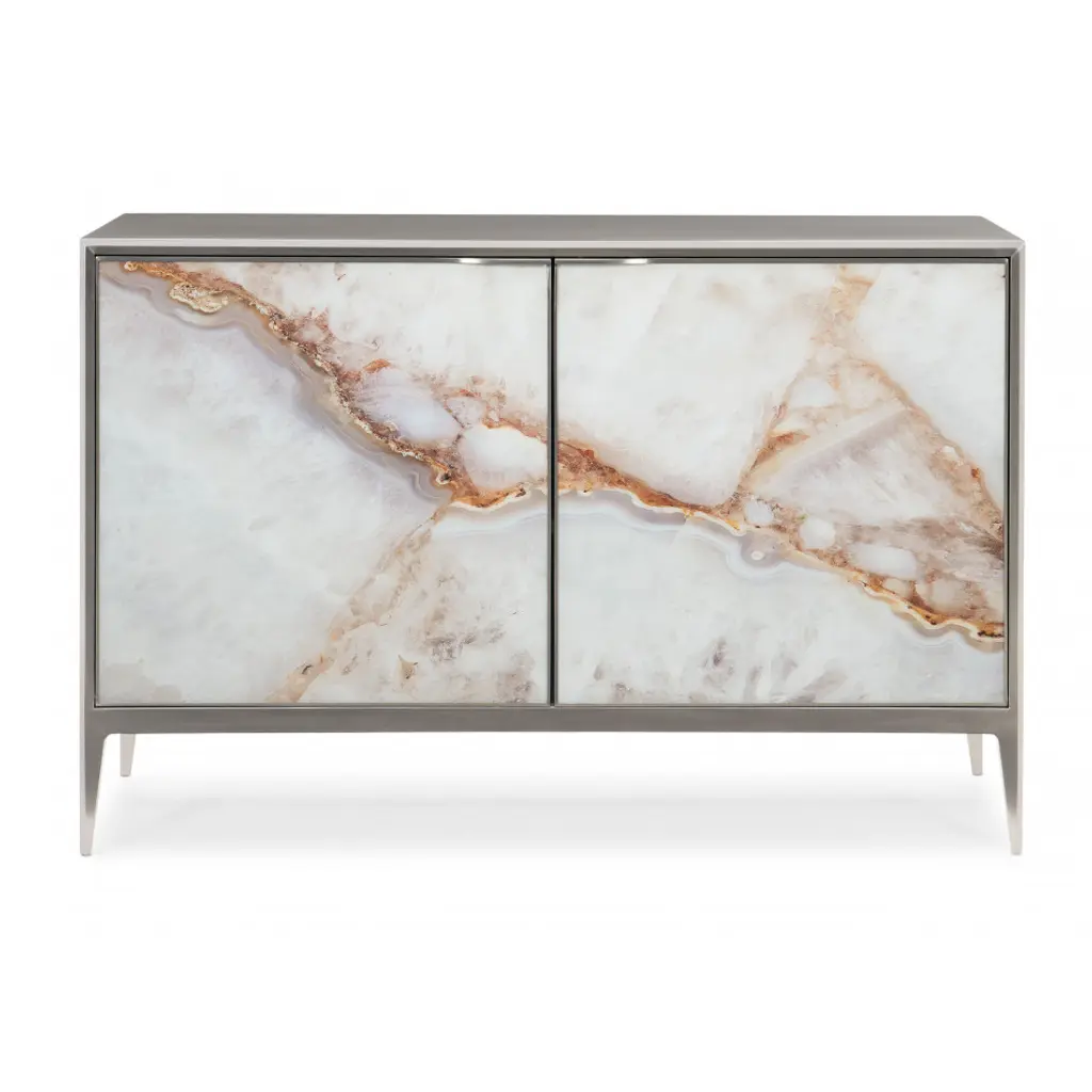 A stellar example of nature’s beauty, the Rock Steady cabinet adds modern character to any space. Wrapped in a metal frame highlighted with a Brushed Nickel finish, its two glass doors feature a one-of-a-kind painted agate pattern in a color palette of cool whites and grays punctuated by earthy shades of terracotta. Subtle finger pulls add function without taking away from the stunning brilliance of its design. Inside, you’ll find a storage area fully finished in Putty with an adjustable shelf and storage drawer. Tapered legs complete the look of this fashionable statement piece.