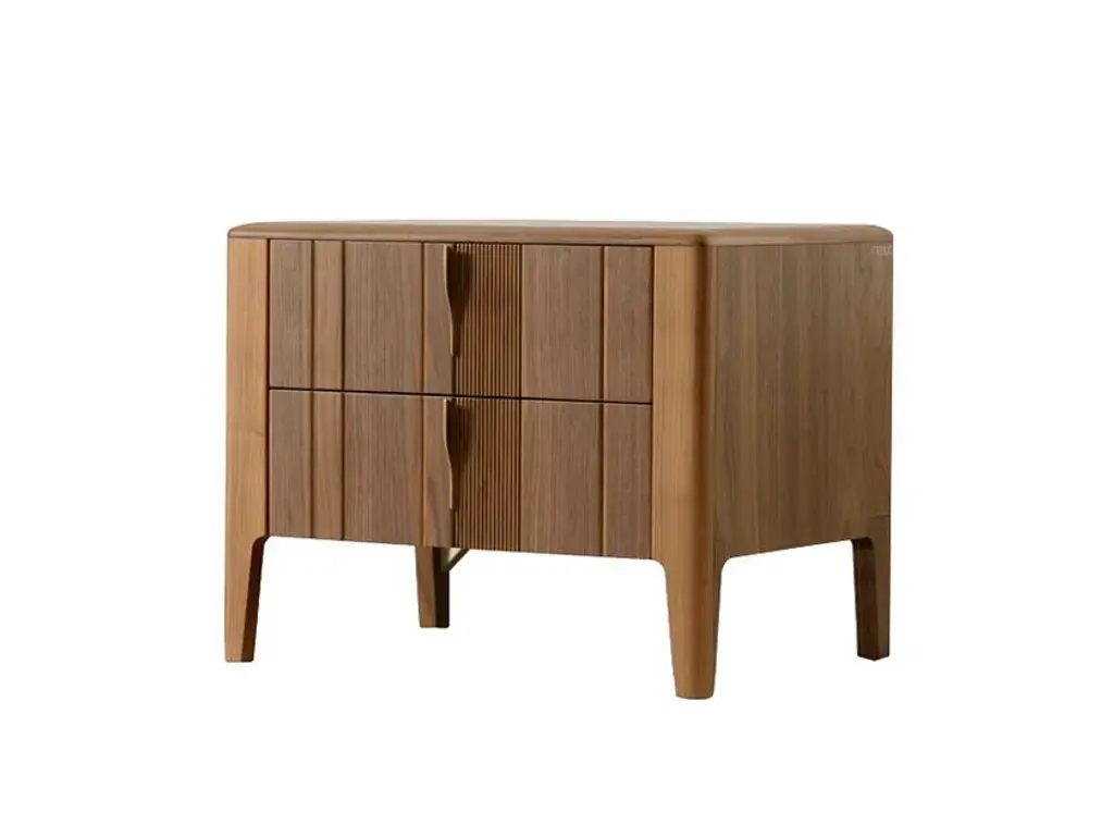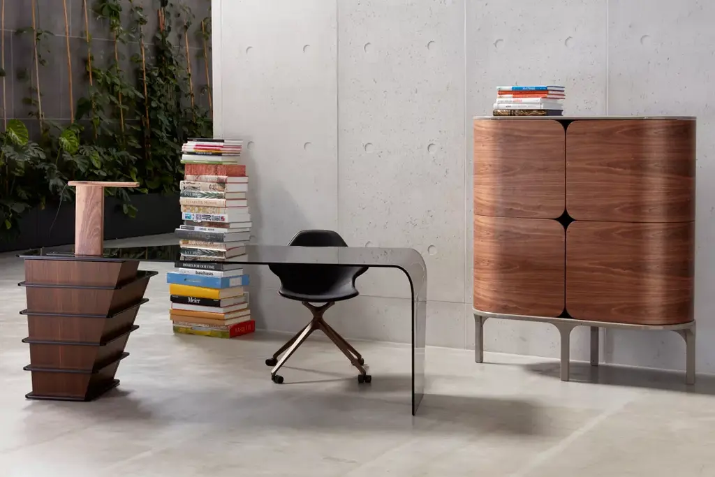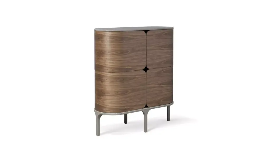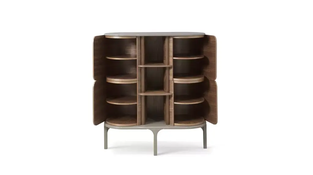 This China unit evokes the idea of metamorphosis. In beech and walnut veneer, it features two cylinders that pivot open to give access to the storage inside.