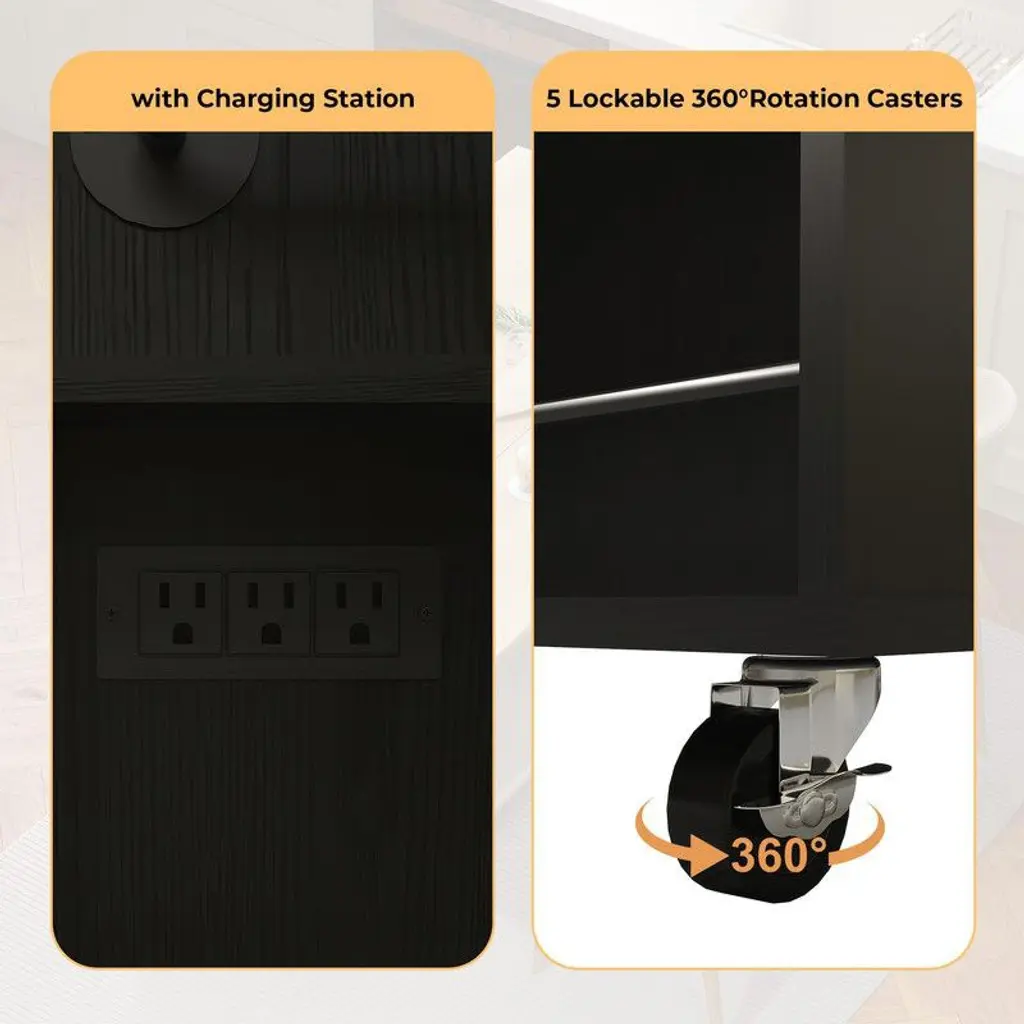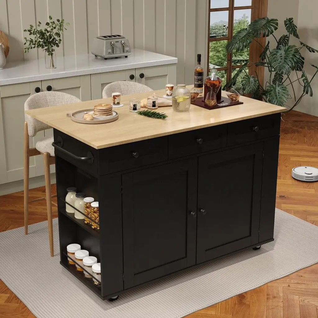 Rolling Kitchen Island Cart With Power Outlet & Drop Leaf, Kitchen Storage Cabinet On Wheels, Black