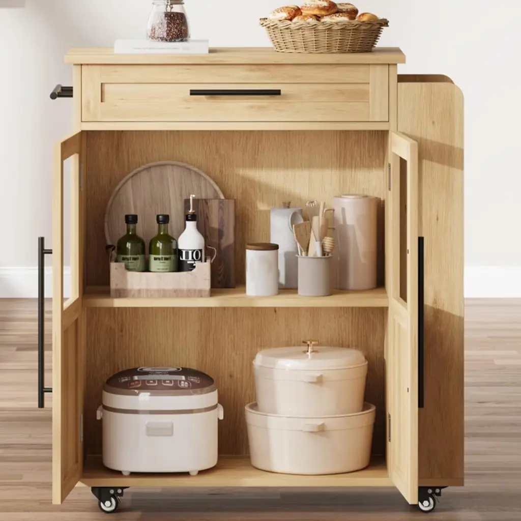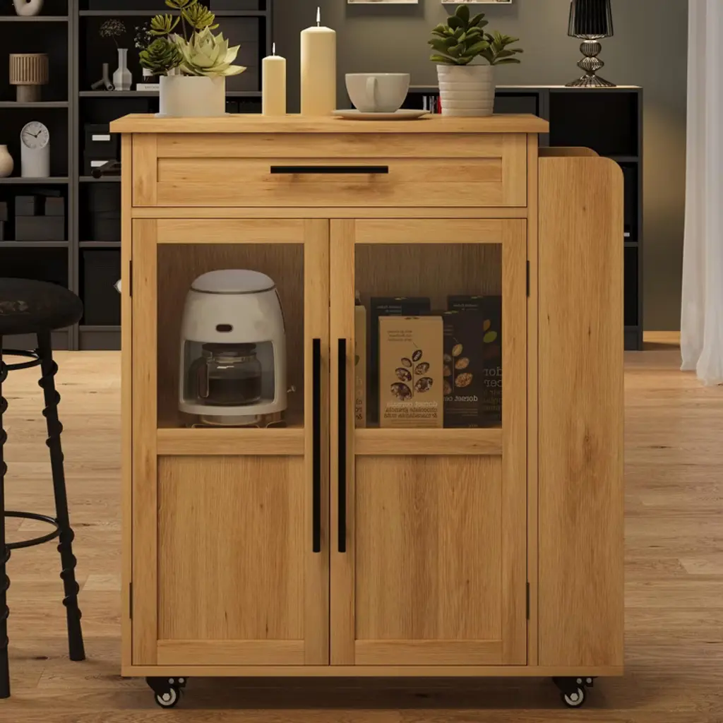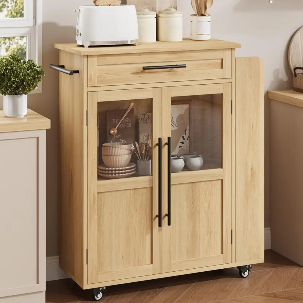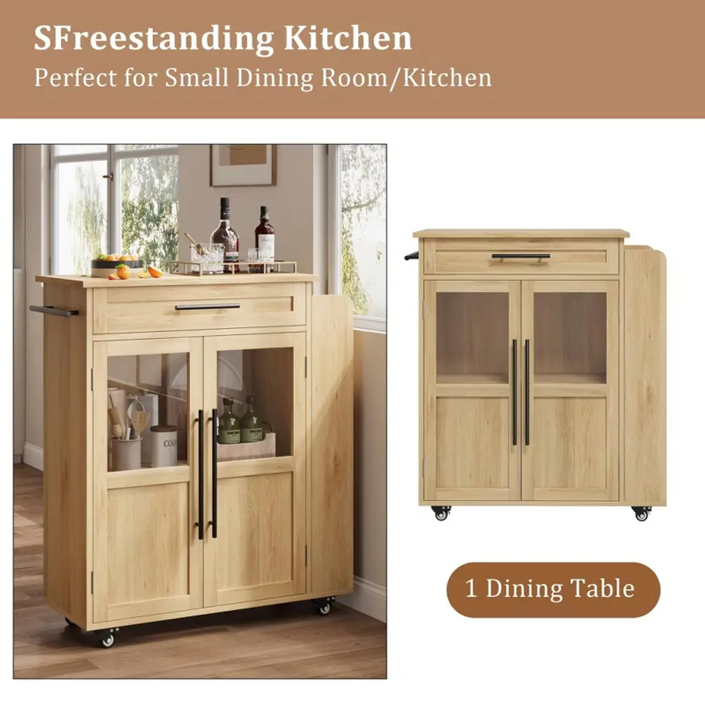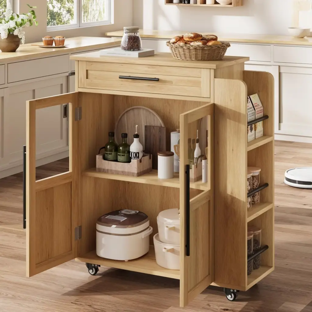 Upgrade your kitchen with this rolling island cart featuring a solid wood build, glass doors, drawer, three-tier spice rack, and smooth-rolling wheels. Perfect for kitchen, dining room, bar, or breakfast nook, this multi-purpose trolley blends chic style with functional storage. Its compact size fits small spaces, bringing modern convenience and elegance to your home. Easy to assemble and simple to move anywhere you need extra prep or storage.