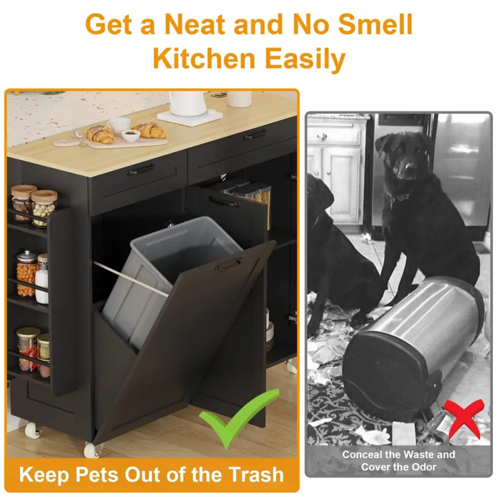 Rolling Kitchen Island With Power Outlet & Drop Leaf, Kitchen Cart With Trash Storage Cabinet