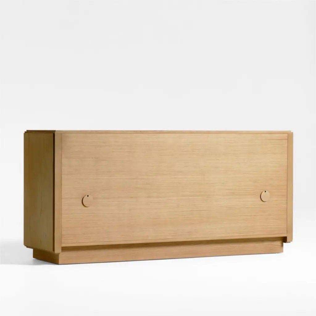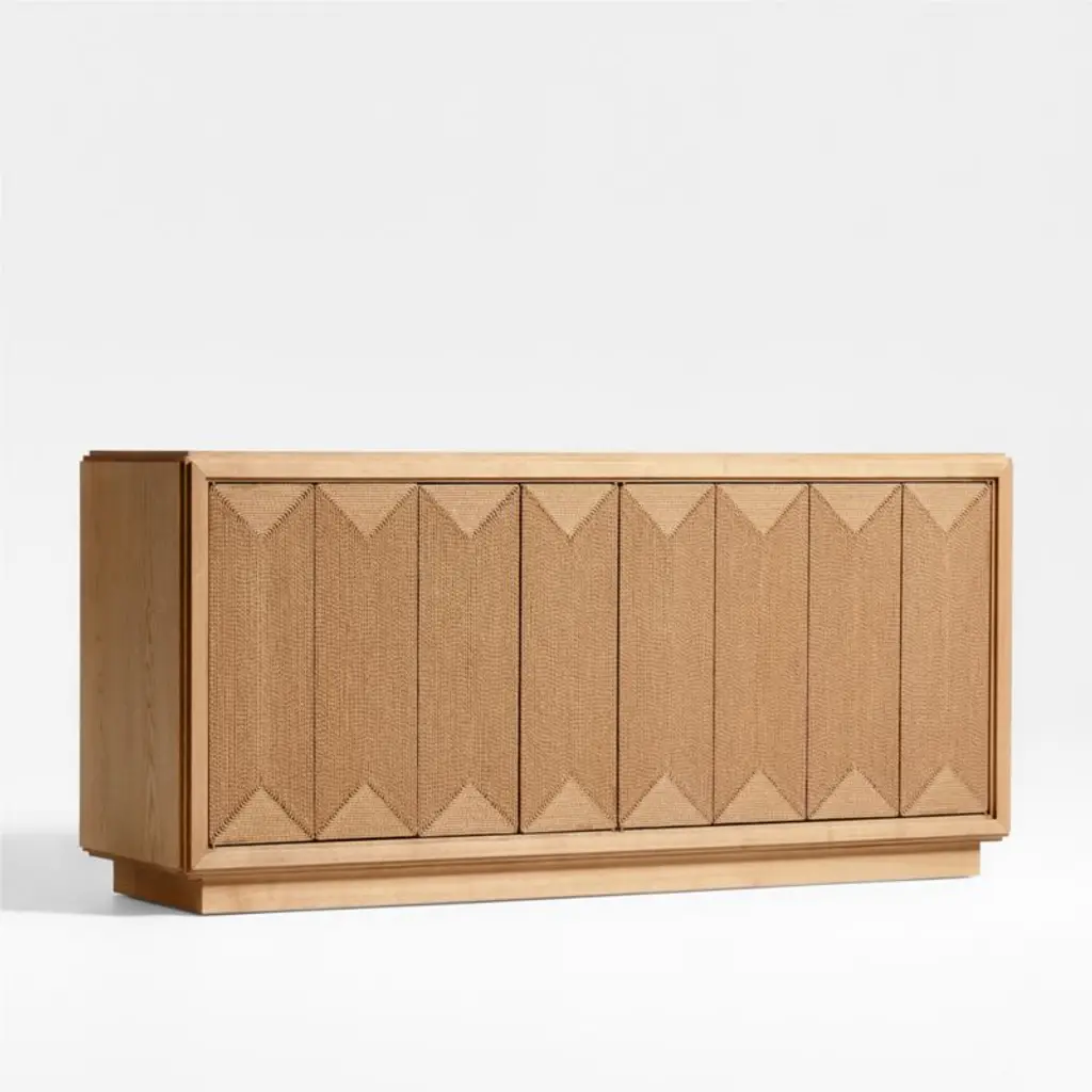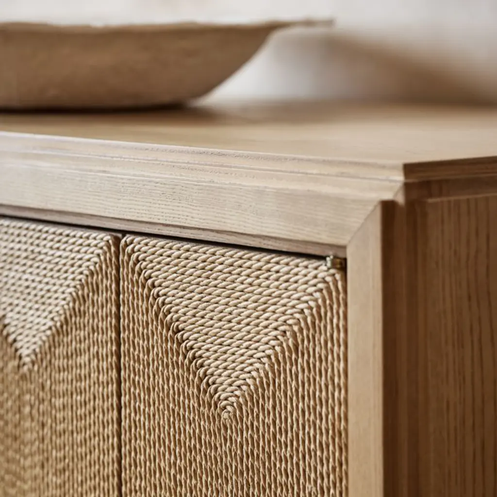 Using rope made of twisted paper, skilled artisans in Vietnam weave the classic rush pattern showcased in this beautifully crafted credenza. Presenting a seamless facade concealing four push-open, bifold doors, the decorative patterning warms the clean-lined cabinet with organic texture. Solid ash and ash veneer frames the front panel, echoing its linear design with stepped and mitered corners. A natural finish emphasizes the detailing and wood grain, while the recessed plinth base lightens the look. Not just great to look at, the sideboard provides roomy storage in two cabinets.