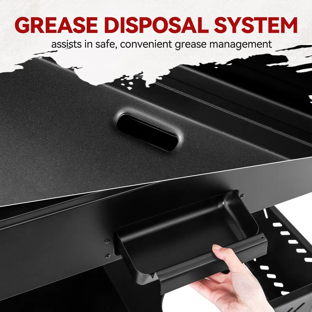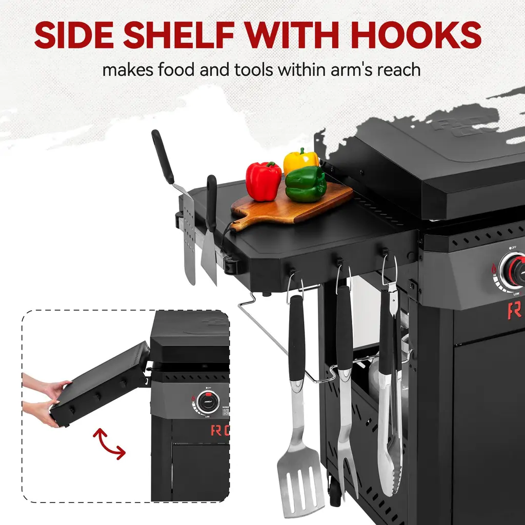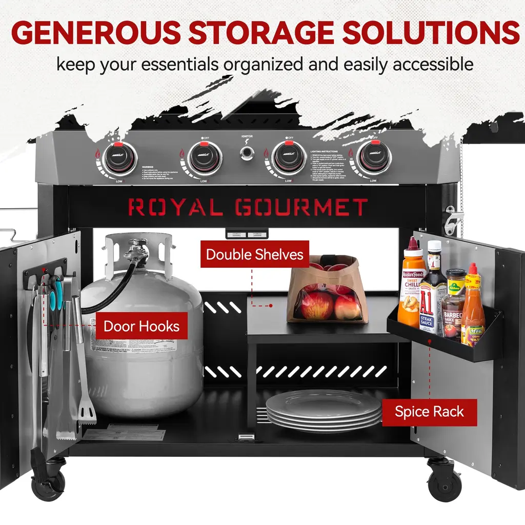 With limited tools at hand outdoors, the Royal Gourmet GB4008D Premium 4-Burner Gas Griddle with Hood makes cooking as easy as in your own kitchen. Its multi-functional hood serves as a windshield when the griddle is in use and protects the cooking surface during storage. Boasting a total output of 52,000 BTU and a 4.5 mm thick, ceramic-coated griddle, this appliance ensures fast heating and even heat distribution. Additionally, the two-level cabinet with foldable side shelves offers ample storage capacity, along with hooks, basket, and other accessories for organized space, allowing you to easily access what you need without lifting your legs.Features: Specifications