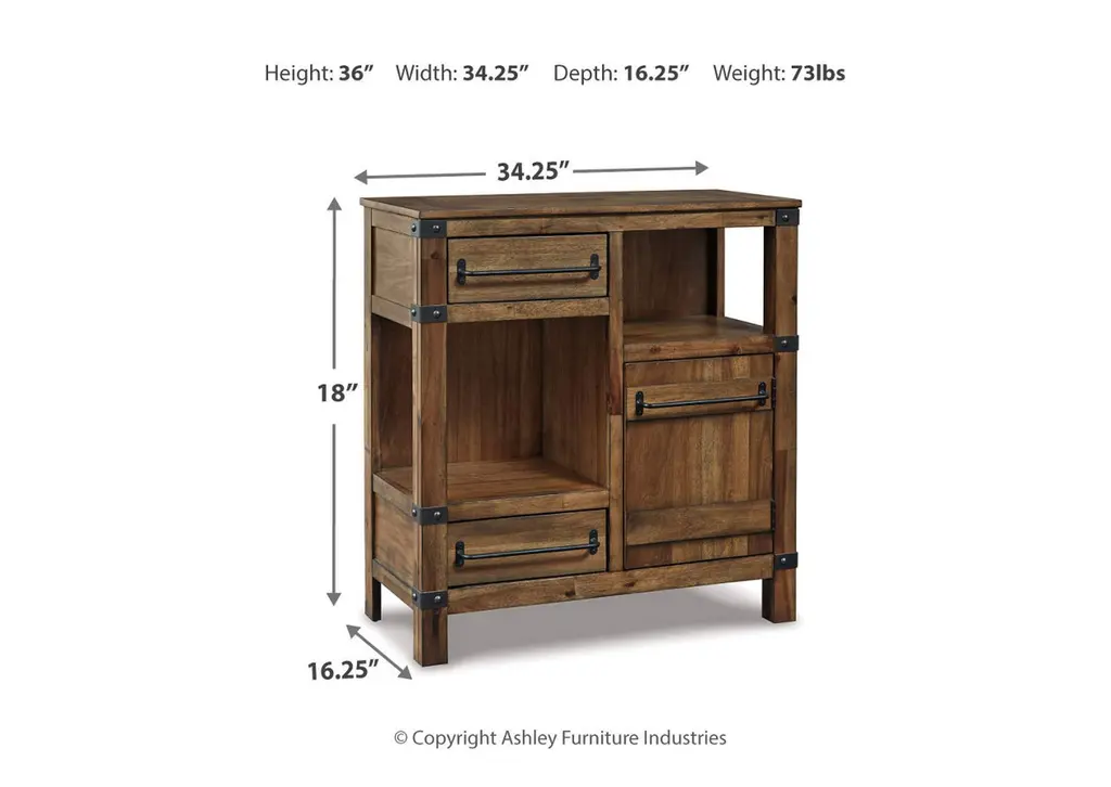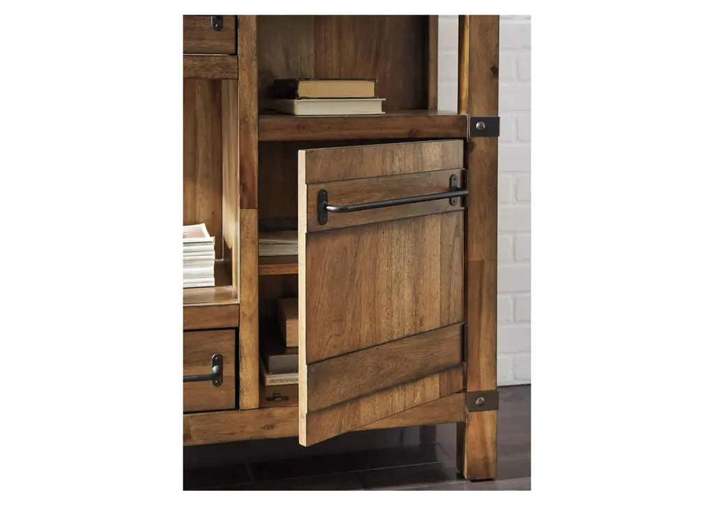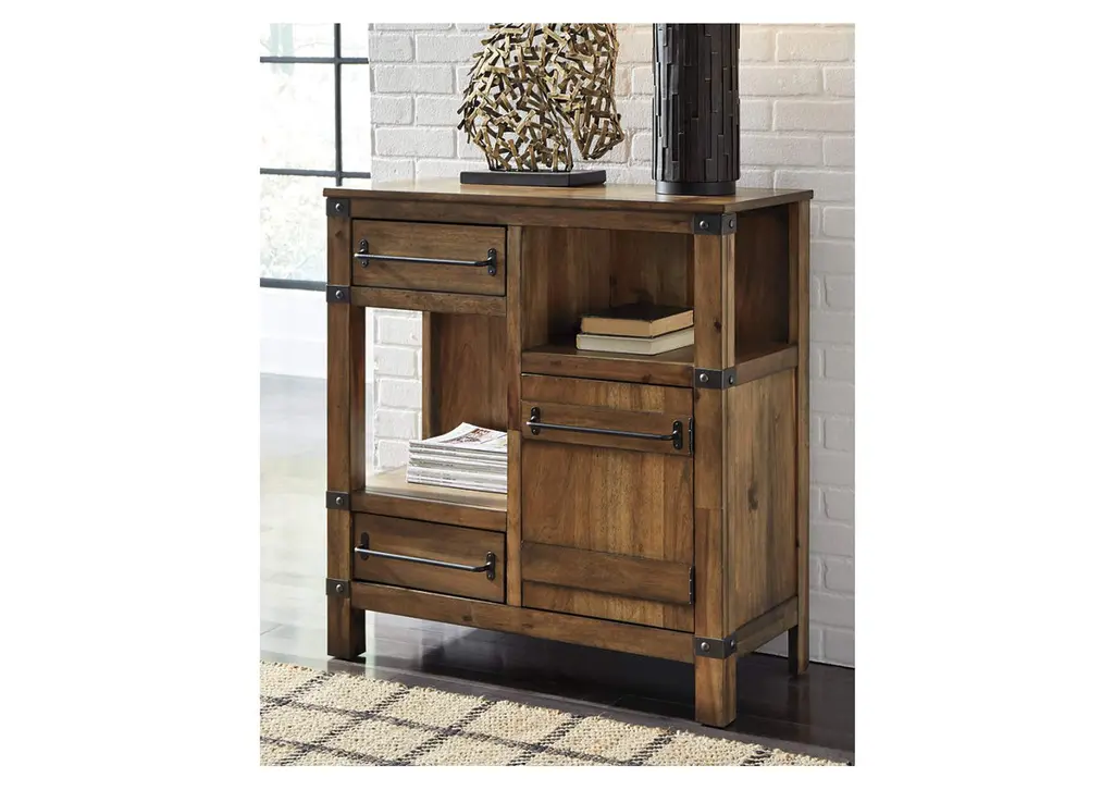 Accentuate your affinity for modern farmhouse living with the Roybeck accent cabinet. Distinctive features include a natural acacia colored finish, dark bronze-tone industrial hardware and a butterfly matched inlay pattern that’s a work of art. Merging drawer and cabinet storage with open display space, this richly crafted cabinet is loaded with possibilities. Weight 79.000 lbs. (35.55kgs.)