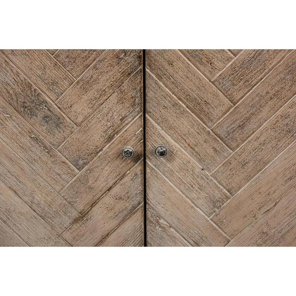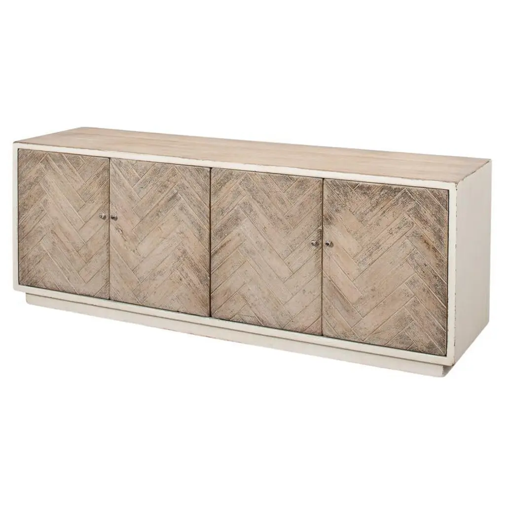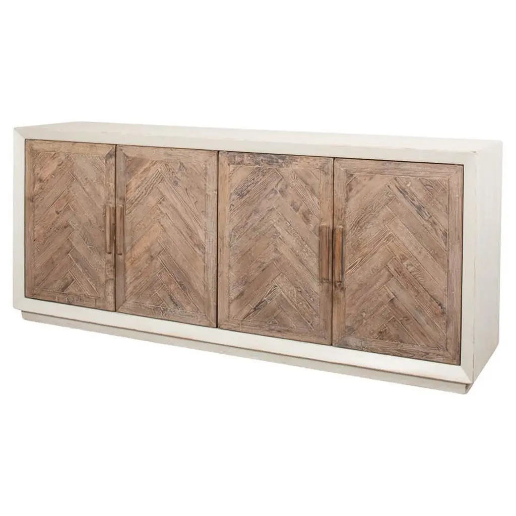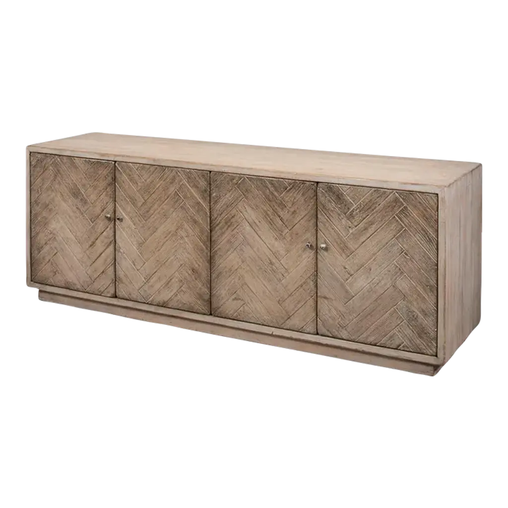 Elevate your home with the perfect blend of form and function. This sideboard boasts a timeless chevron herringbone pattern, adding a touch of artisanal sophistication to your space. With generous storage behind four sleek doors, it’s ideal for keeping your essentials tucked away yet accessible.Perfect for a mid-century modern or classic setting, this piece not only serves as a functional asset but also as a statement piece that complements your discerning taste. Made with reclaimed pine and finished in an antiqued distressed stone gray frame with natural finished doors.Dimensions: 65" W x 17" D x 24" H