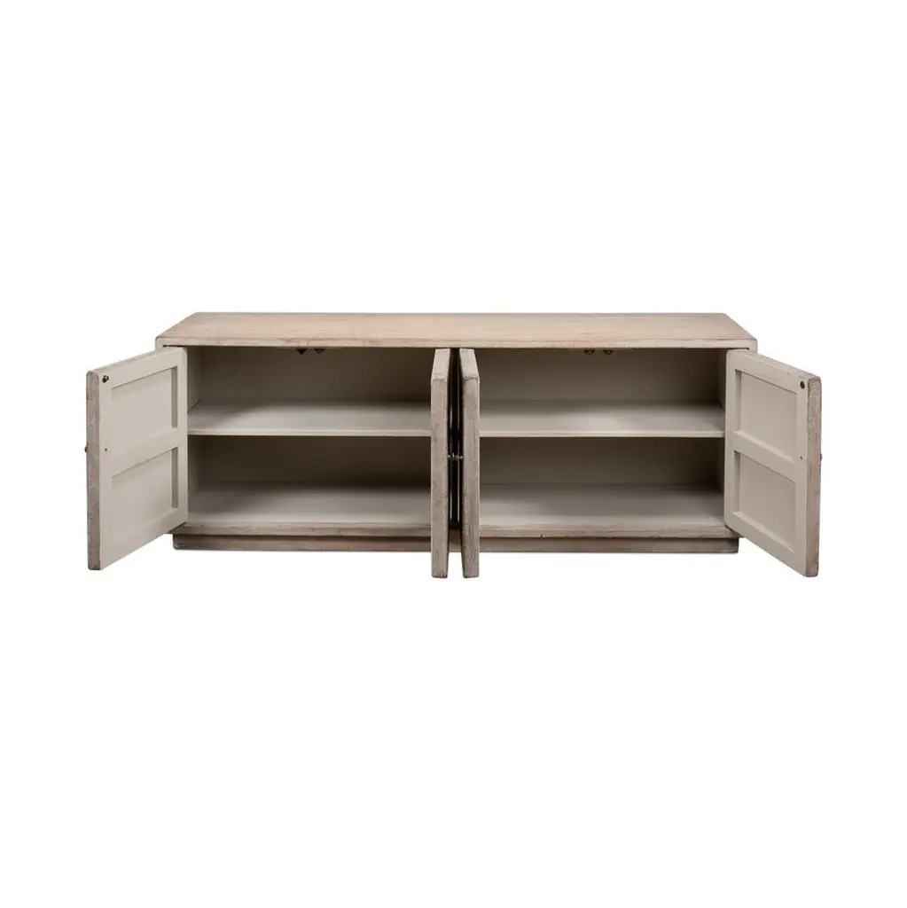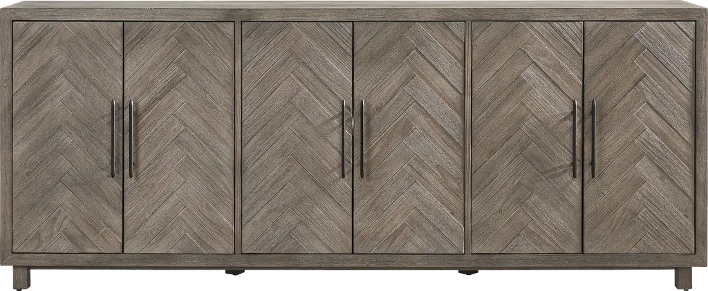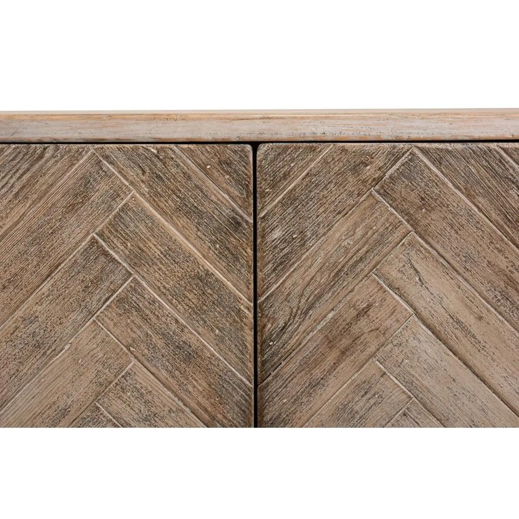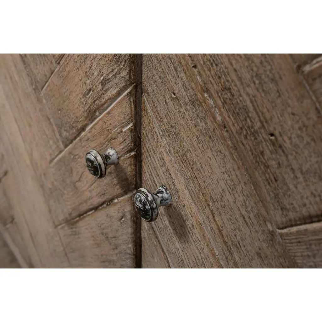 Elevate your home with the perfect blend of form and function. This sideboard boasts a timeless chevron herringbone pattern, adding a touch of artisanal sophistication to your space. With generous storage behind four sleek doors, it’s ideal for keeping your essentials tucked away yet accessible.Perfect for a mid-century modern or classic setting, this piece not only serves as a functional asset but also as a statement piece that complements your discerning taste. Made with reclaimed pine and finished in an antiqued distressed stone gray frame with natural finished doors.Dimensions: 65" W x 17" D x 24" H
