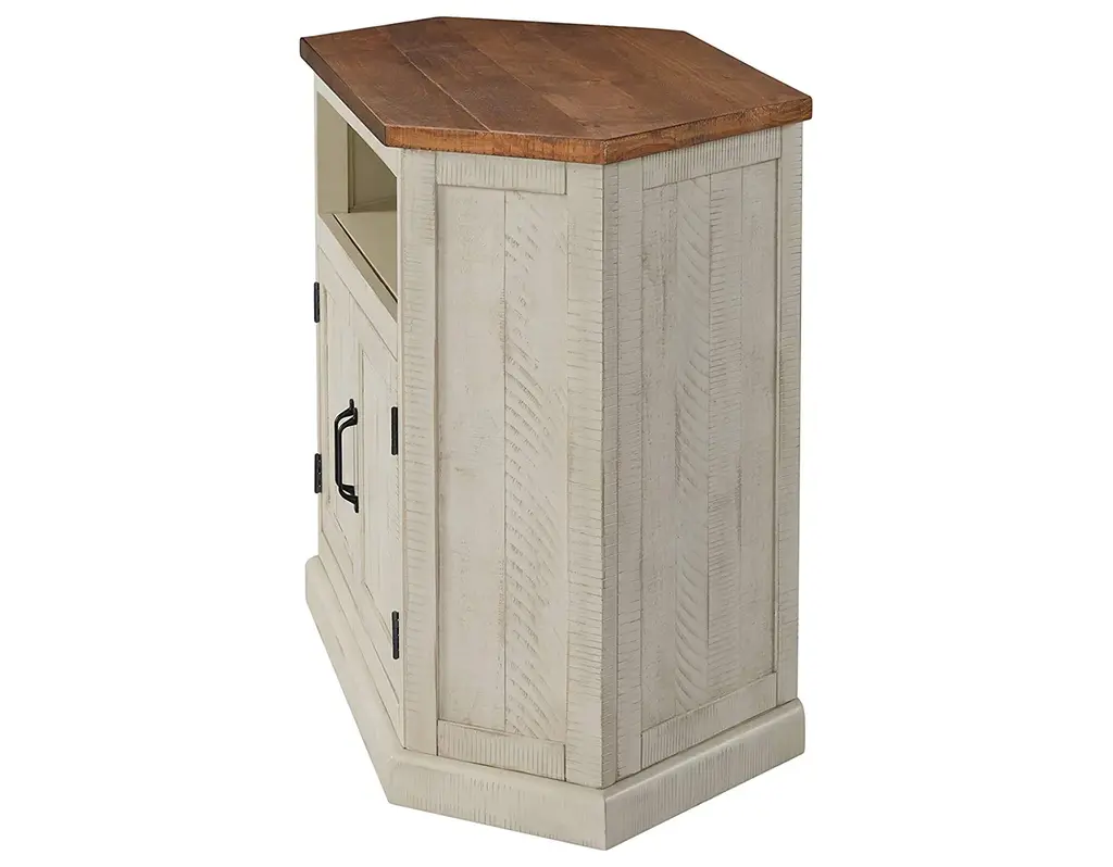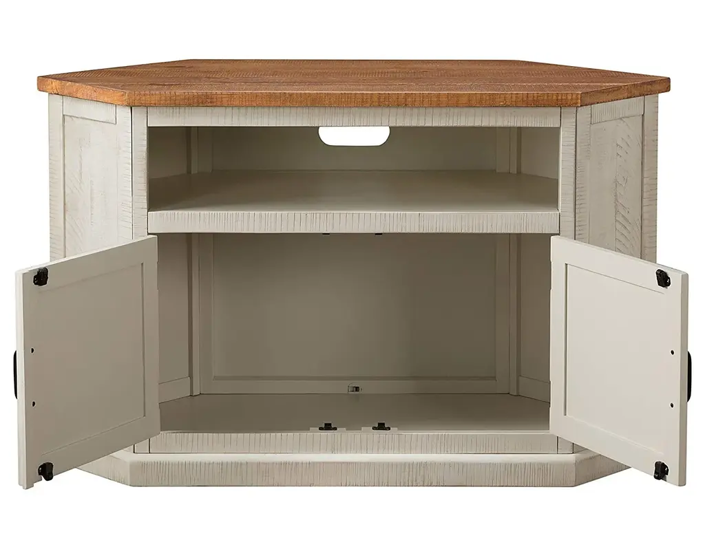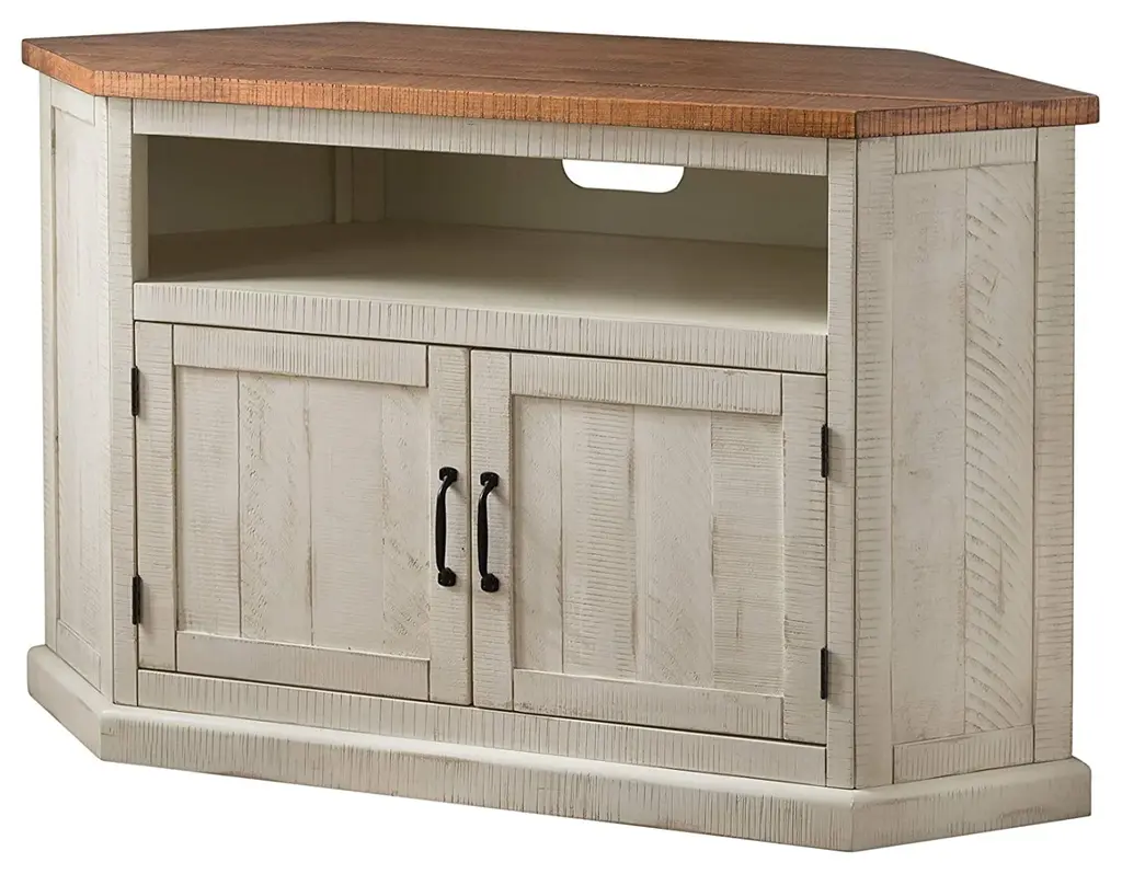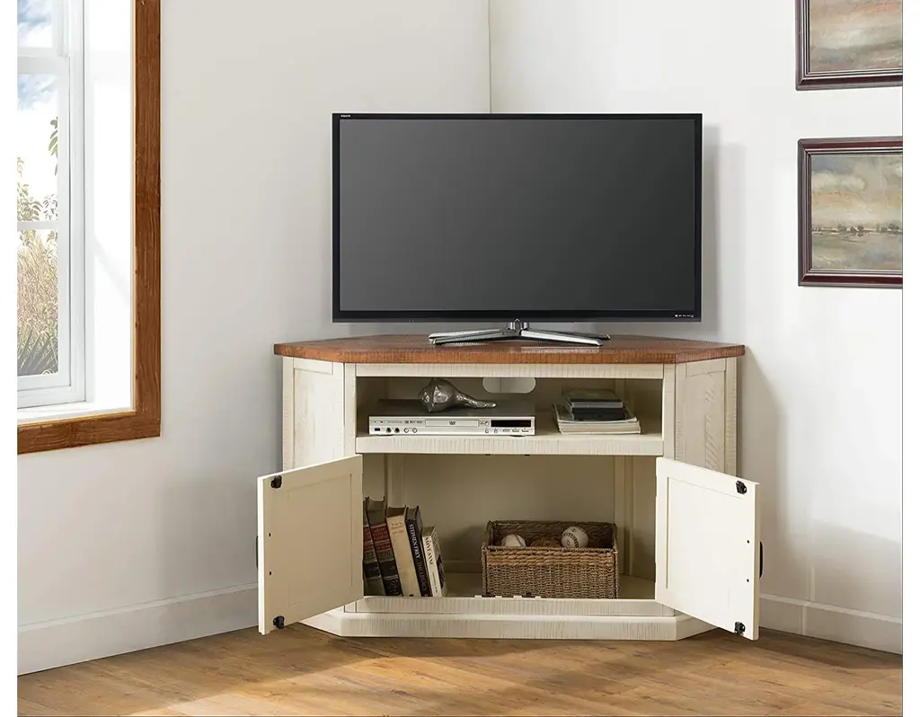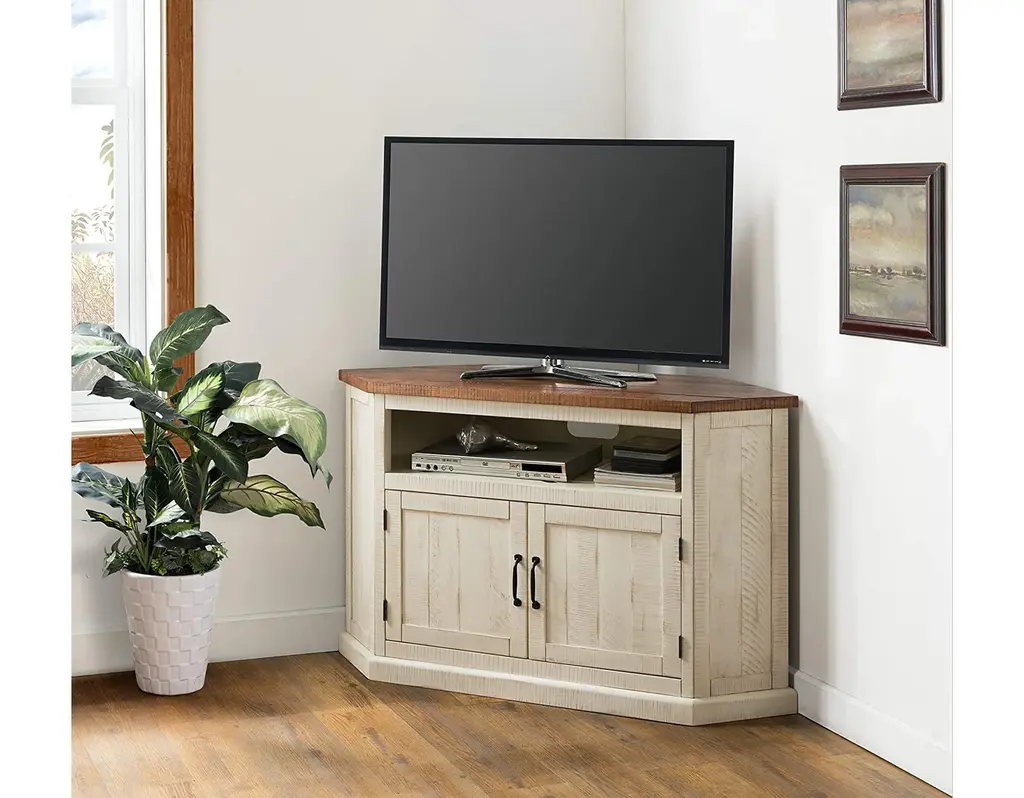 Rustic Corner Tv Stand, Pine Wood Frame And Honey Tobacco Top, Antique White