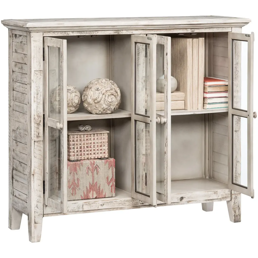 Panel doors in antique white that have a naturally worn look to them with subtle variations throughout is just one feature to love about this piece. Another is the magnetic door catches, which make this character piece versatile and functional. You can store linens and dishes just as easily as you can feature photos and other treasures. The choice is yours.