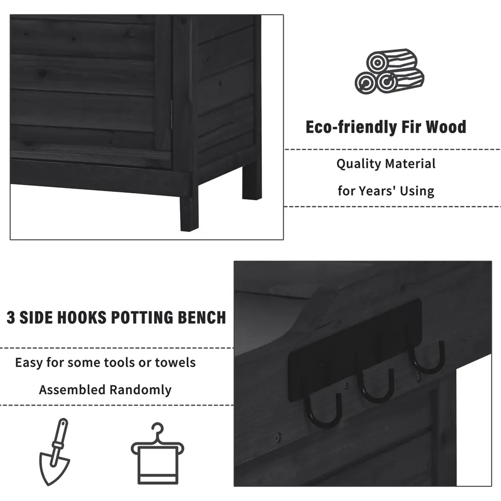 Enhance your gardening setup with this rustic solid wood potting bench, crafted from durable fir wood for lasting performance. Featuring a waterproof galvanized zinc plate, it provides a sturdy and easy-to-clean workspace. A built-in cabinet with two removable loft shelves offers versatile storage options for pots, tools, and accessories. Three side hooks provide additional hanging space for frequently used gardening essentials. Compact yet functional, this potting bench is perfect for outdoor patios, gardens, and backyards, keeping everything organized and within reach for effortless planting and potting.Features:Specifications: