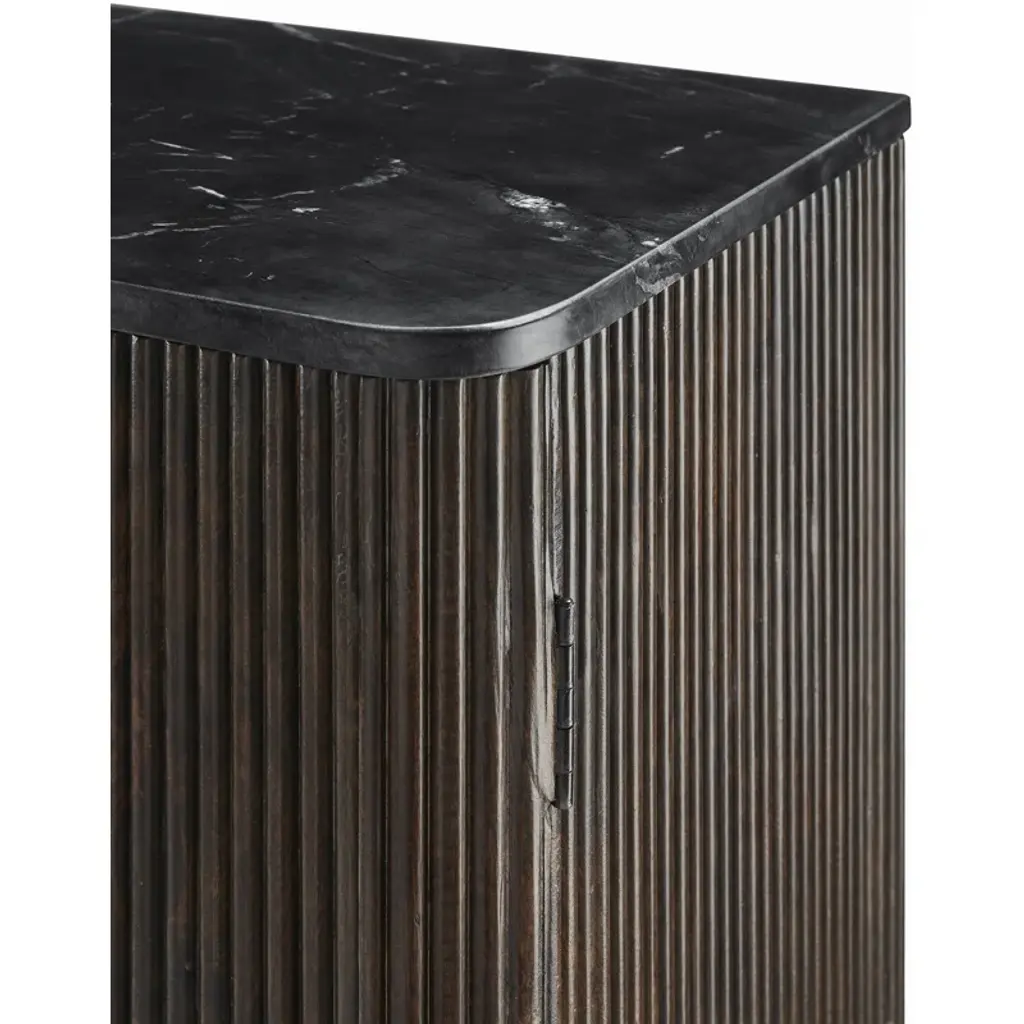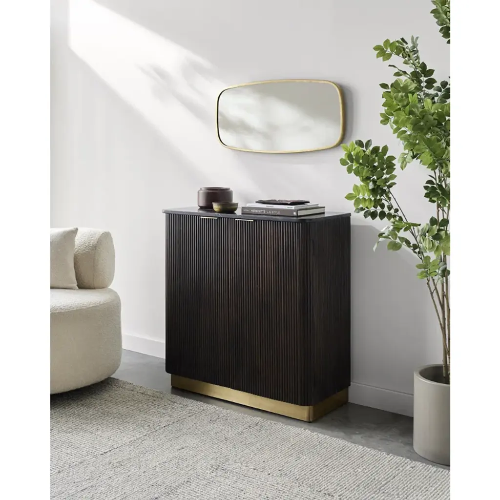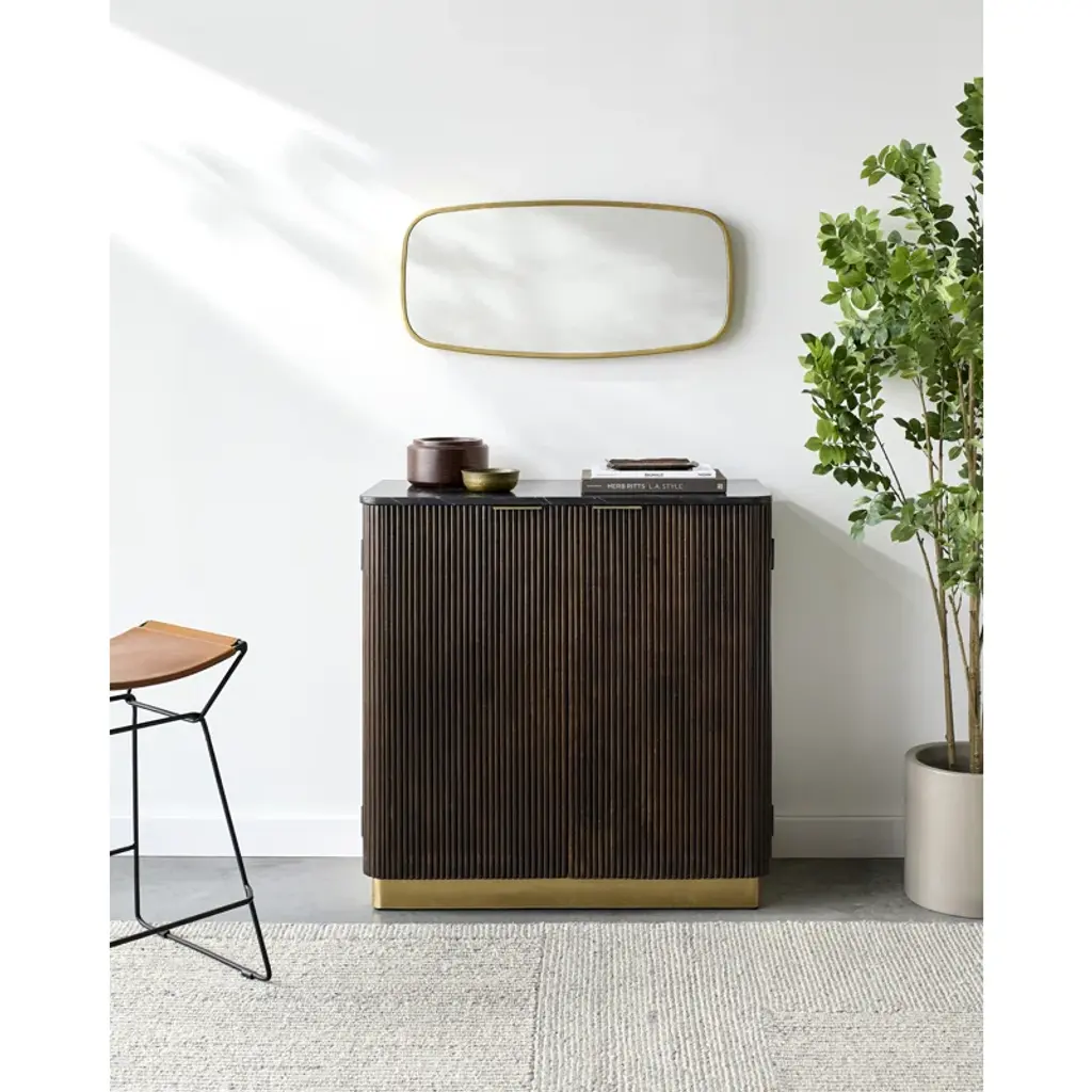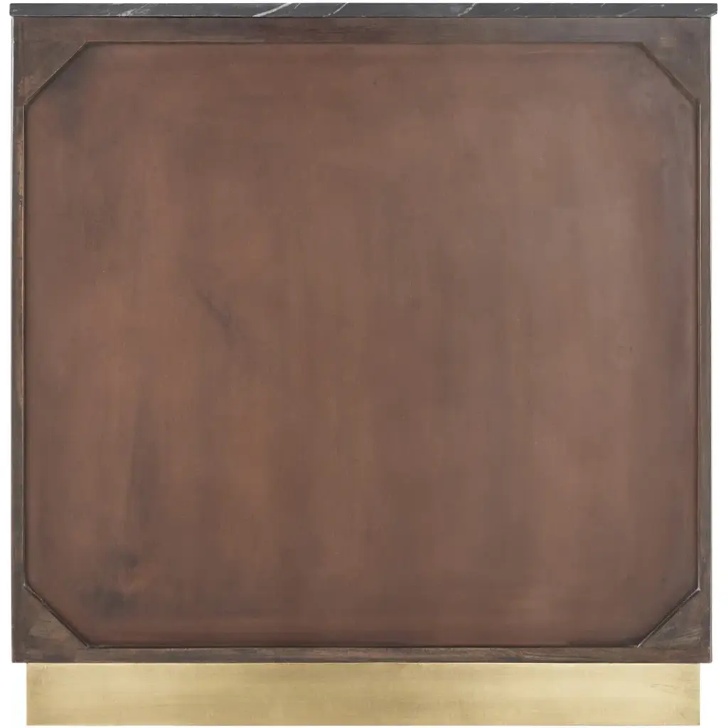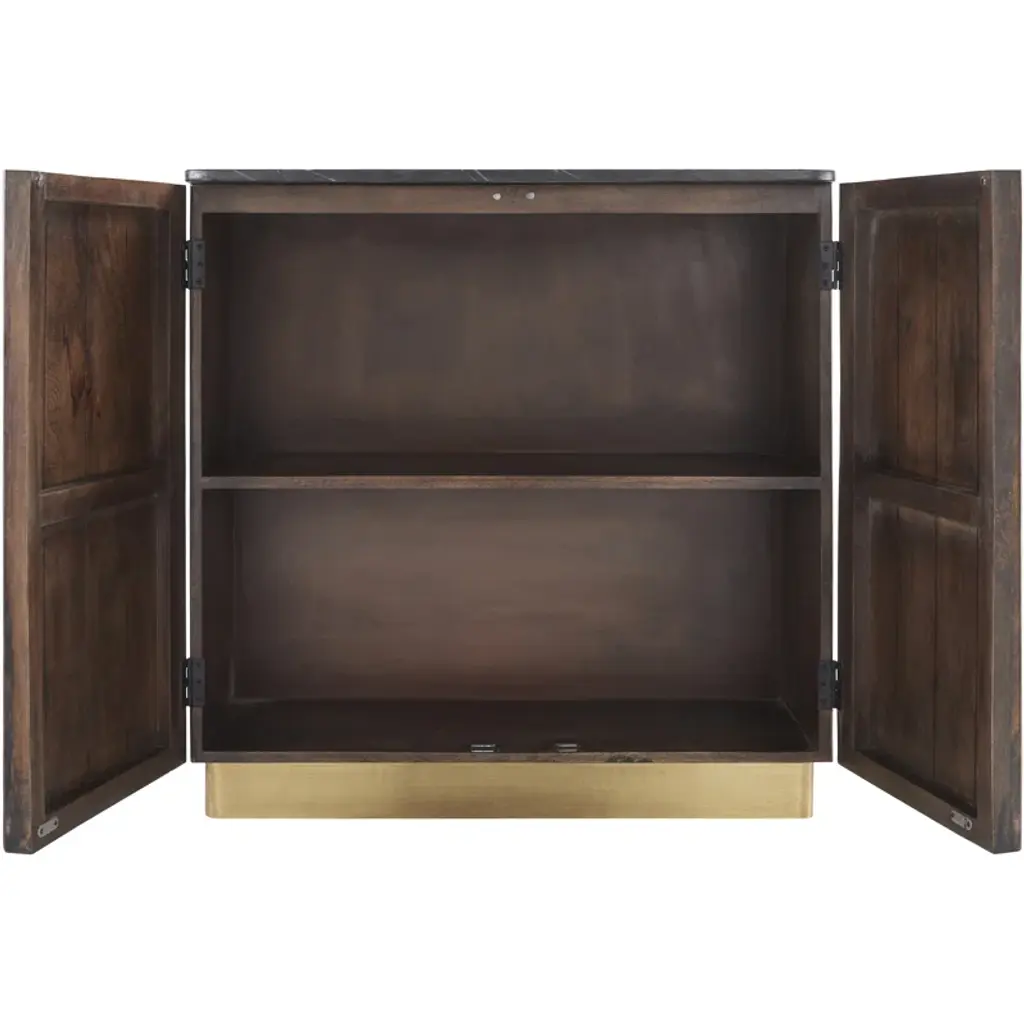 Say hello to the epitome of sophistication! This accent cabinet is a blend of classic and contemporary, featuring a marble top on a solid wood and brass base. Its rectangular shape is adorned with gold hardware, adding a touch of glamour to any room. The two-door cabinet is perfect for keeping your essentials hidden but within reach. Plus, its wooden shelf offers an additional storage option. With its finished back, this cabinet not only looks good, but also stands strong, making it a timeless addition to your space.