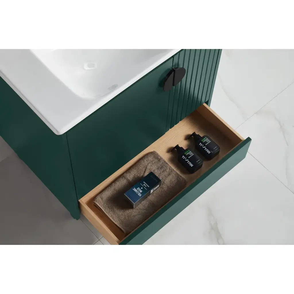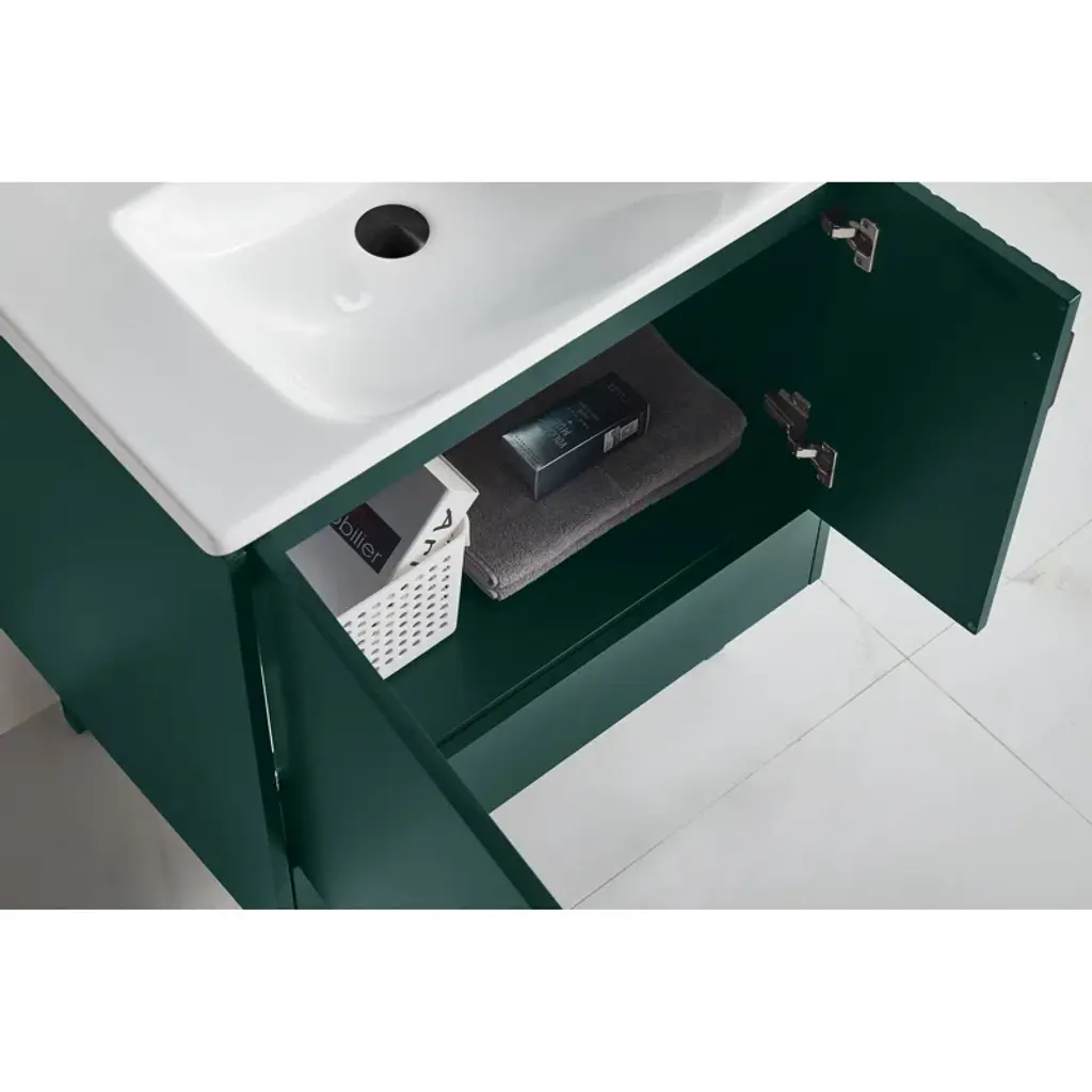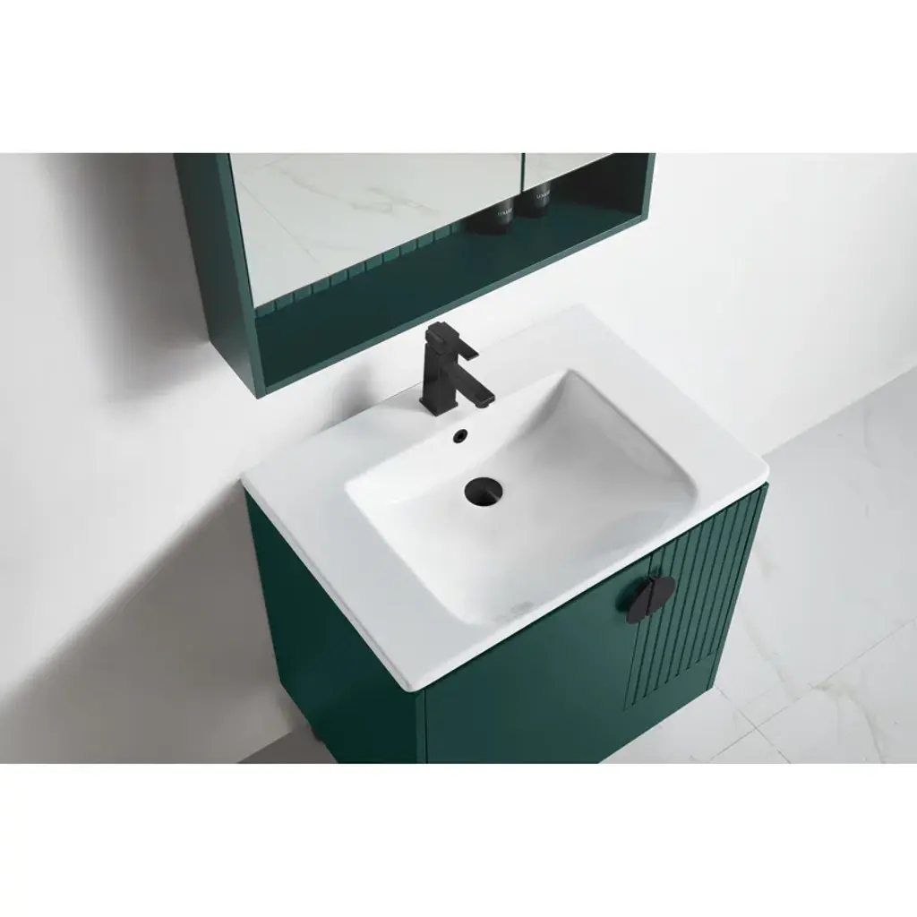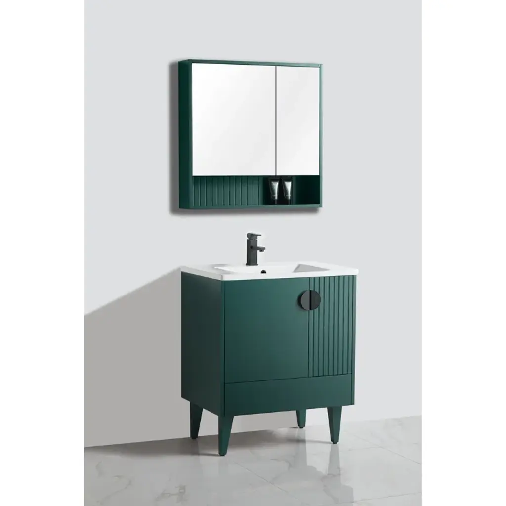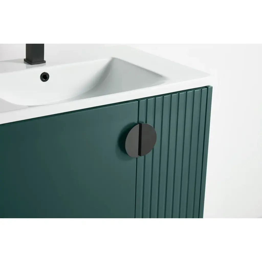 This bathroom vanity uses asymmetrical cabinetry, beadboard paneling, and a split circular handle to create a playful – and functional – design inspired by mid-century abstract art. A soft-close drawer adds extra storage, and the counter + sink are crafted from white ceramic