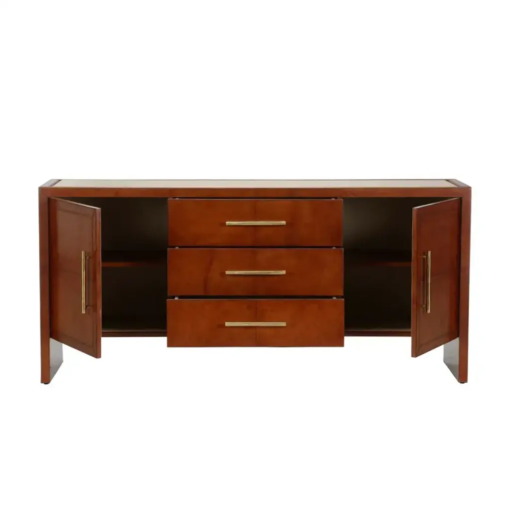 The Santino Buffet featuring a rich leather-covered exterior that exudes timeless style. The smooth leather finish adds a touch of warmth and texture, while the sturdy natural travertine top provides a striking contrast with its natural stone beauty. The drawers and cabinet space is designed for ample storage, making this buffet as functional as it is stylish. The combination of fine materials and expert craftsmanship makes this piece a standout addition to any room, offering both practicality and refined elegance to your home décor.