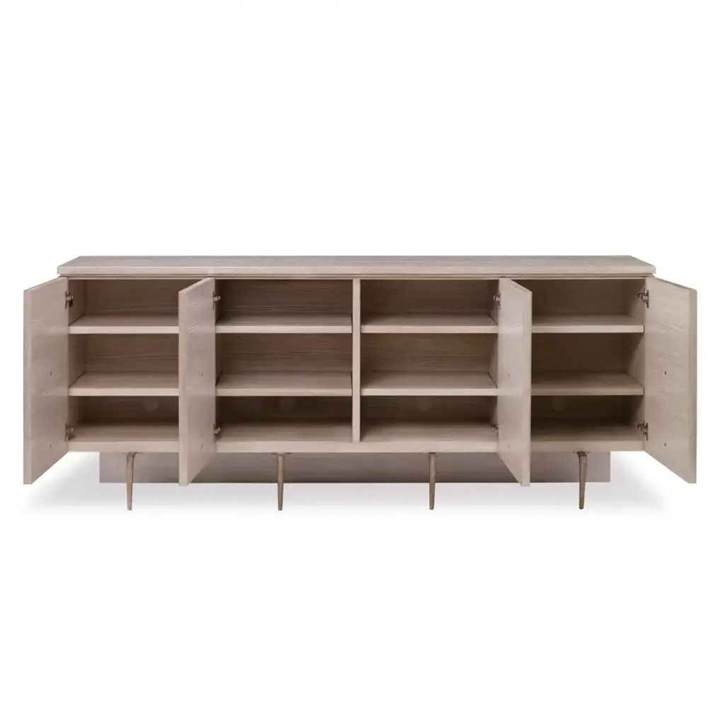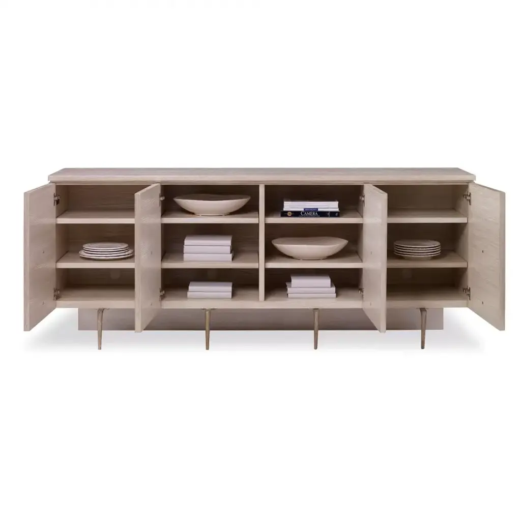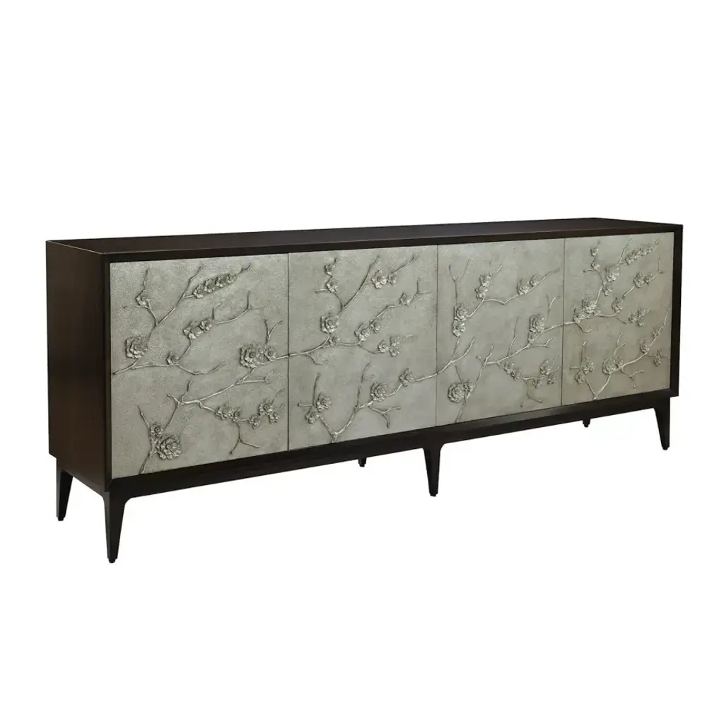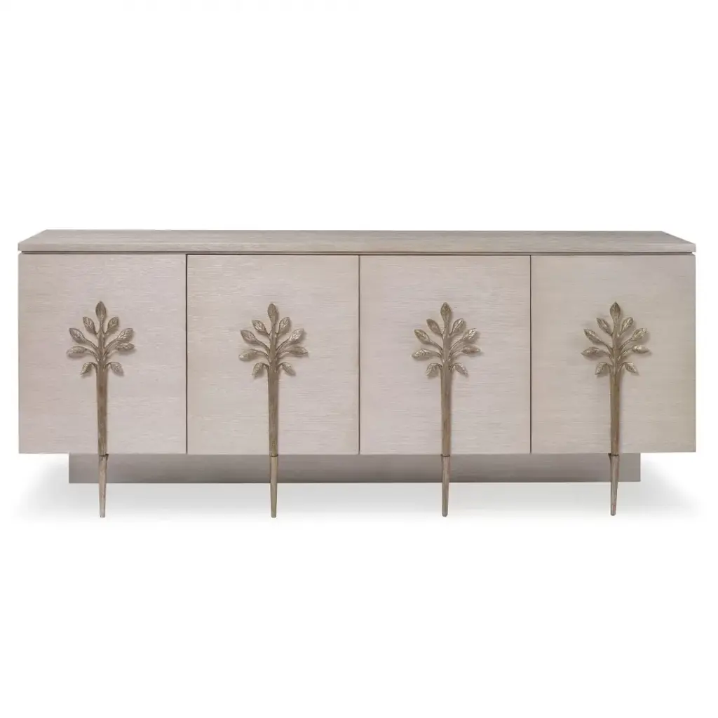 The stunning Sapling Multi-Use Cabinet is made of solid hardwood and American White Oak veneers with a pearlized platinum finish. Behind doors that feature uniquely designed sapling shaped pulls, there are eight adjustable shelves, 2'' grommets and raceways to provide easy access for wiring. This versatile cabinet functions perfectly as a media cabinet, sideboard or a multitude of other storage options.