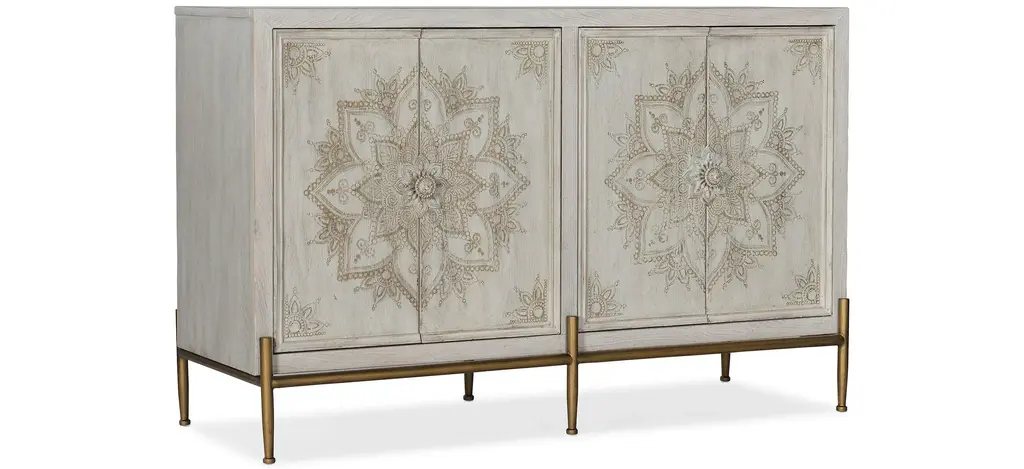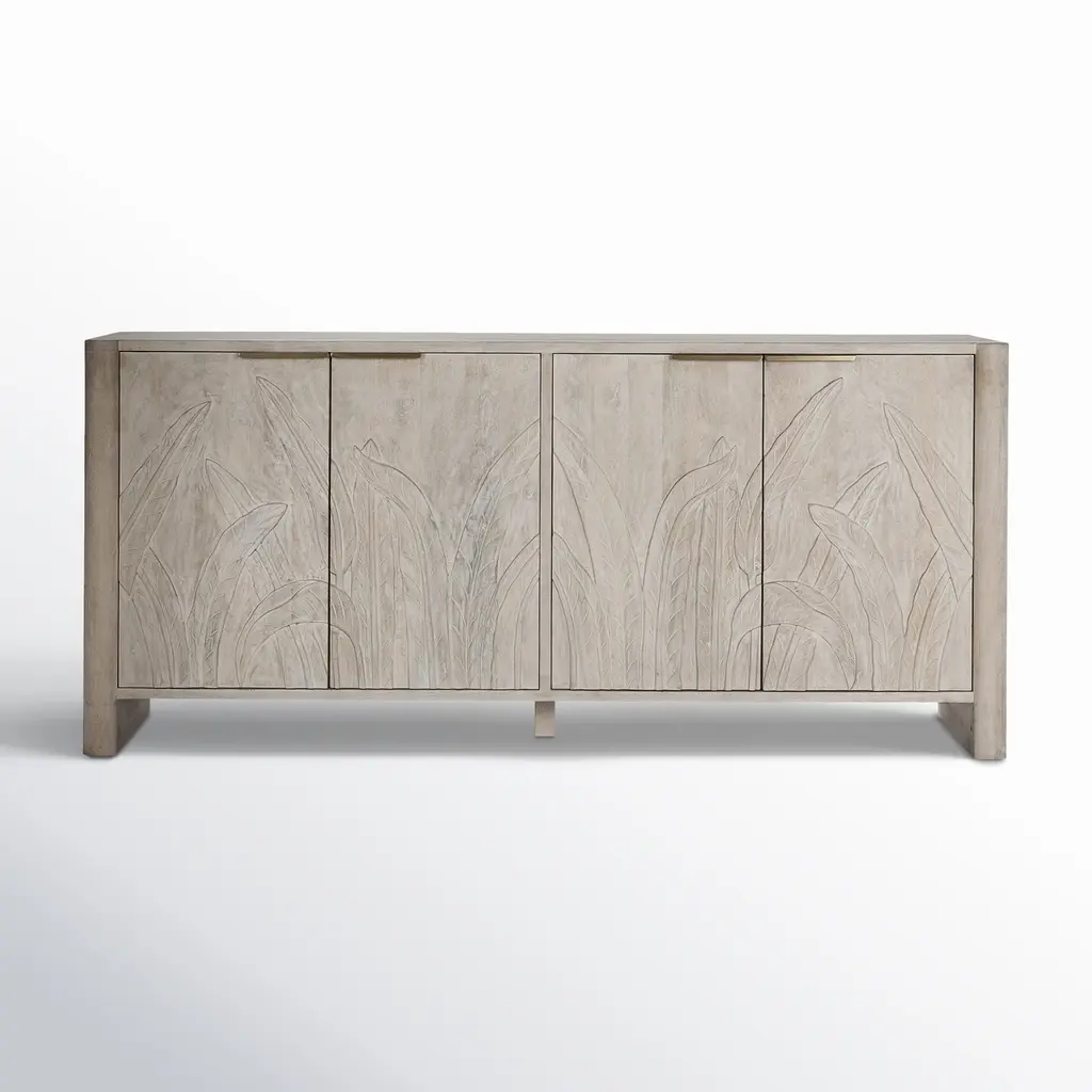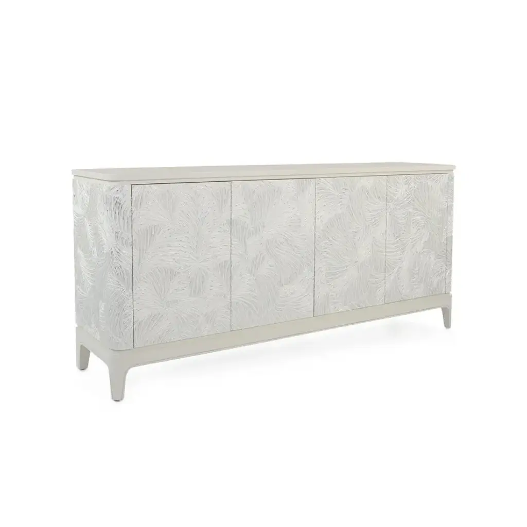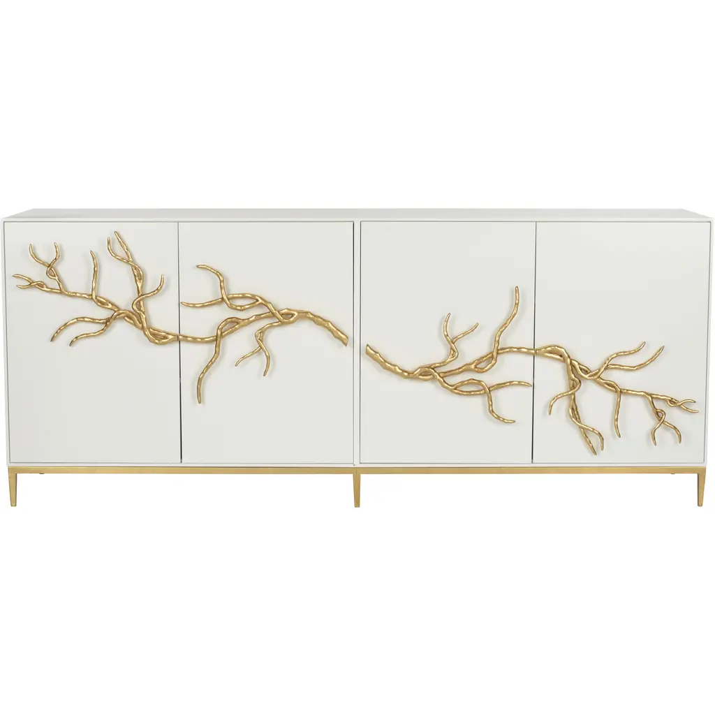 The stunning Sapling Multi-Use Cabinet is made of solid hardwood and American White Oak veneers with a pearlized platinum finish. Behind doors that feature uniquely designed sapling shaped pulls, there are eight adjustable shelves, 2'' grommets and raceways to provide easy access for wiring. This versatile cabinet functions perfectly as a media cabinet, sideboard or a multitude of other storage options.