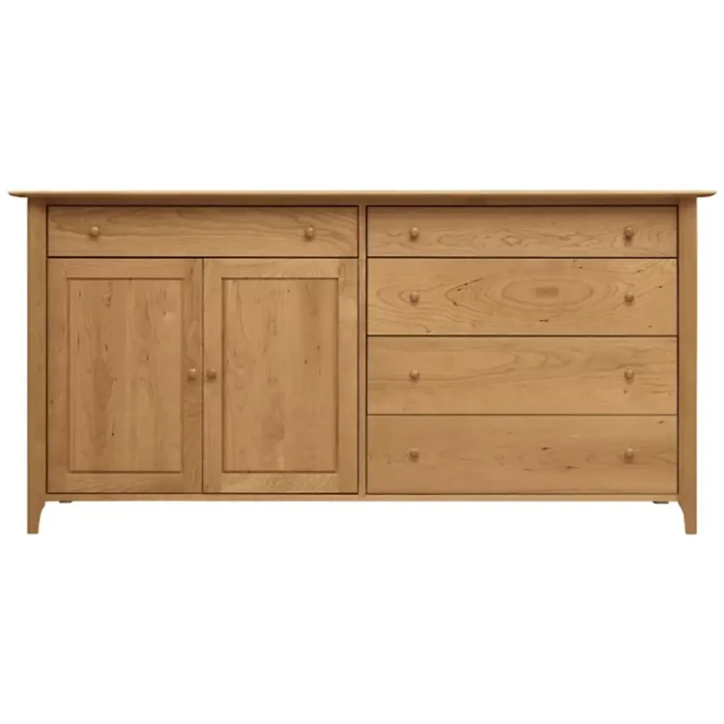 The Copeland Furniture Sarah Buffet - 2 Doors and 5 Drawers has a clean yet comfortable form evocative of Shaker style. This characteristic--and its array of storage options--also makes it a versatile piece in a variety of dining room settings. Made out of solid cherry wood, this buffet is available in your choice of wood tone and cabinet position.