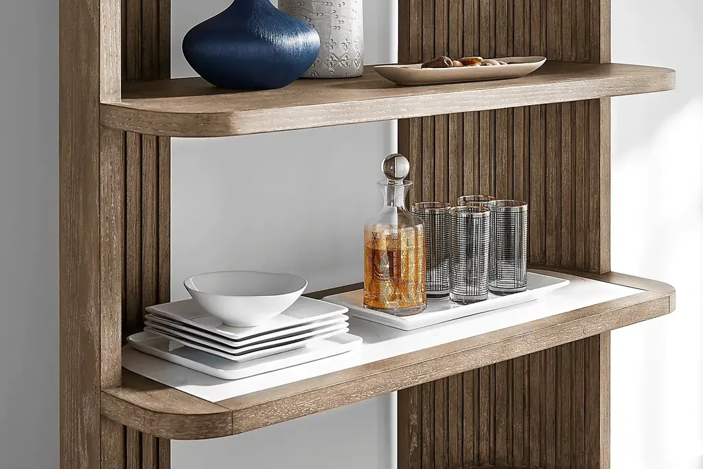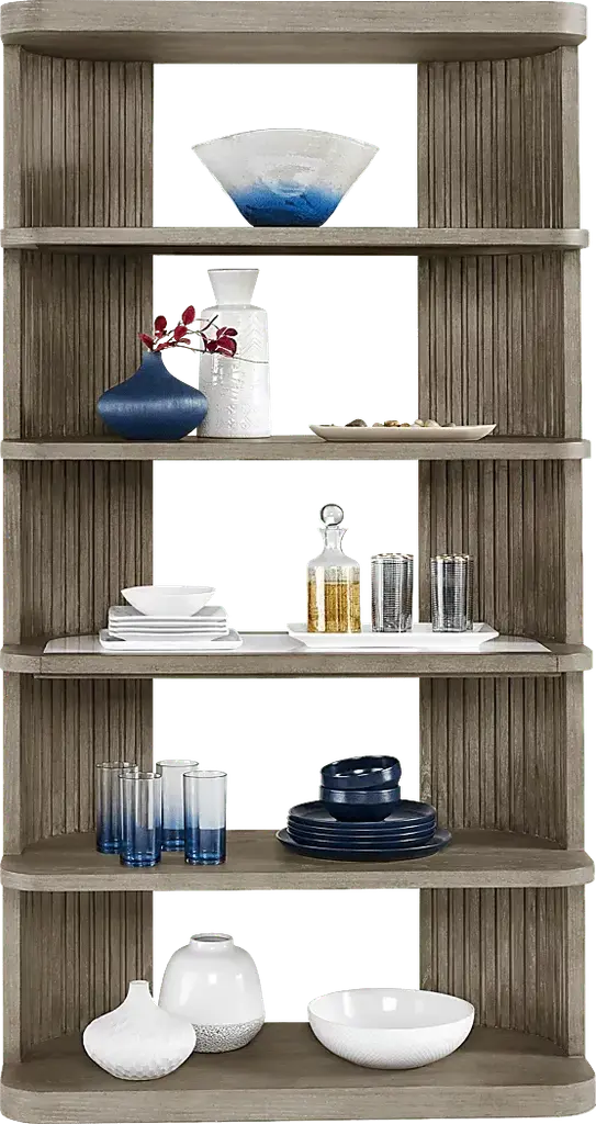 Boldly confident with a gentle touch of softness, the Sausalito display cabinet from Drew and Jonathan punctuates the day with a quiet double-take at its red carpet-worthy looks. Contemporary in style, this piece's commanding silhouette is crafted with oak veneers while the interior channeled detailing of the vertical framing adds visually provocative contours. The spacious shelves allow for maximum use of available space while a stone inlay on the middle shelf provides the final, authoritative detail.