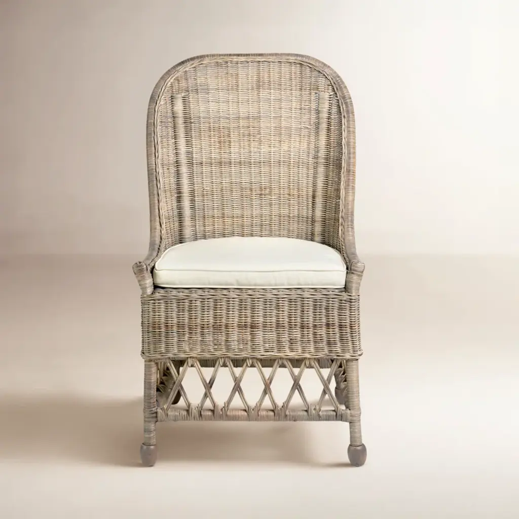 Inspired by ocean waves, this beautiful dining chair adds charm + character to any space. Handwoven in natural wicker with a fabric sand linen sheet. Feature in a coastal home around a breakfast nook.