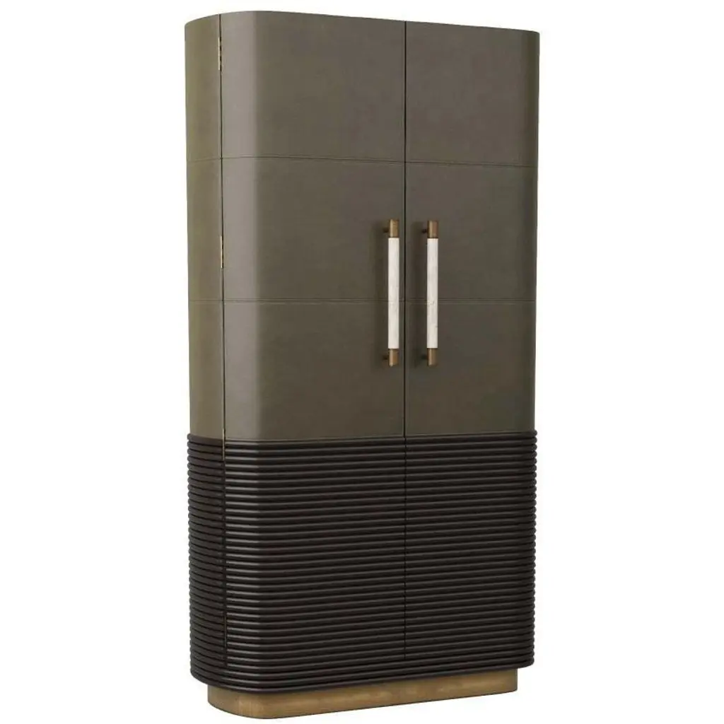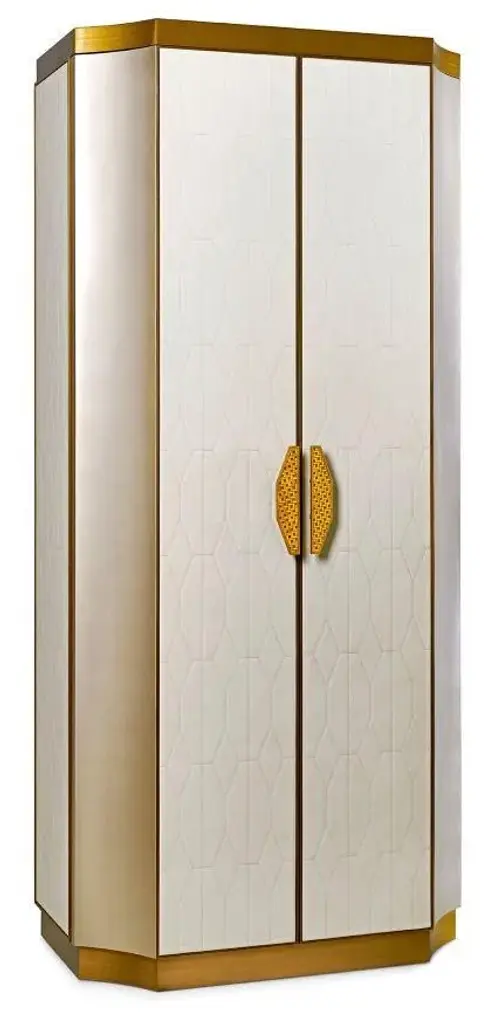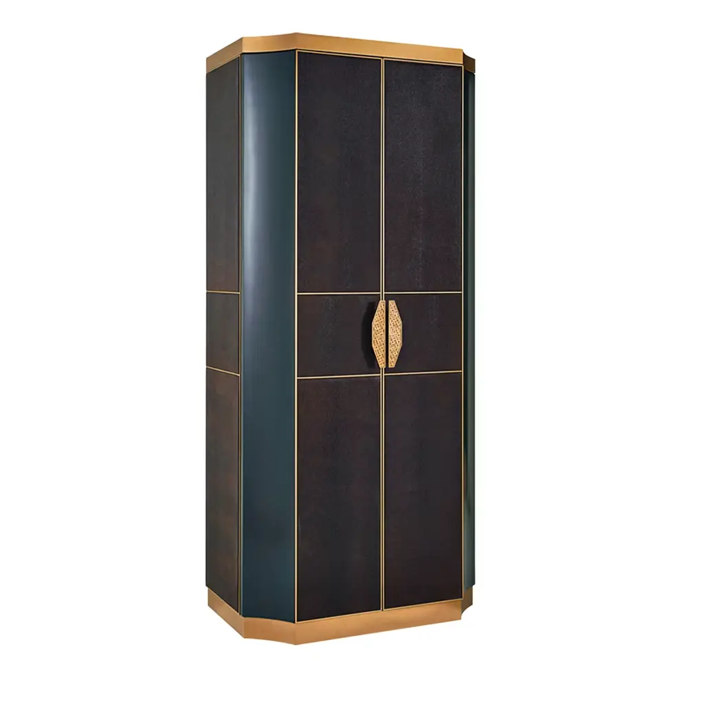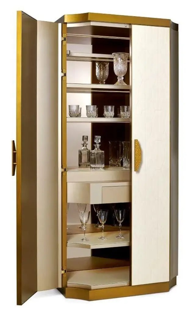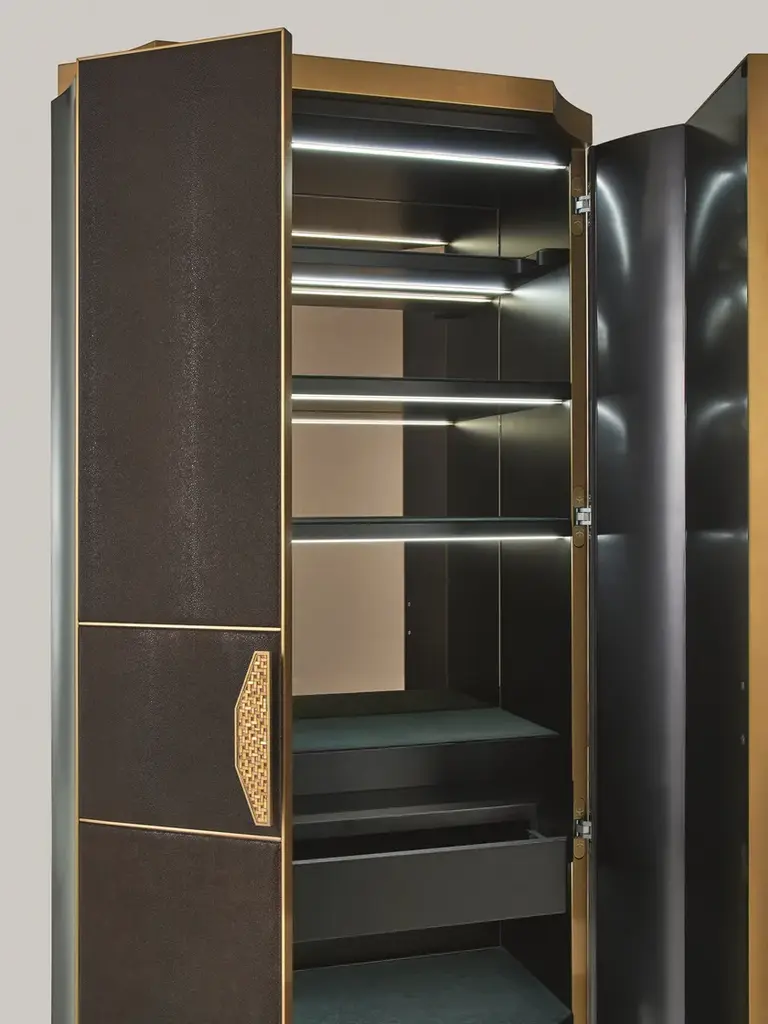 Savoy is a unique, distinctive piece of furniture with a strong shape and refined choice of materials that really bring out the Haute style. Beautiful minute mosaic decoration on the handles.Structure with coated lacquer finish or antique bronze. Doors and sides in quilted fabric or leather. Mirror back on the inside. LED lighting with opening sensor. Microfiber mats on shelves. Handle with minute mosaic decoration, with coated lacquered or antique bronze finish.