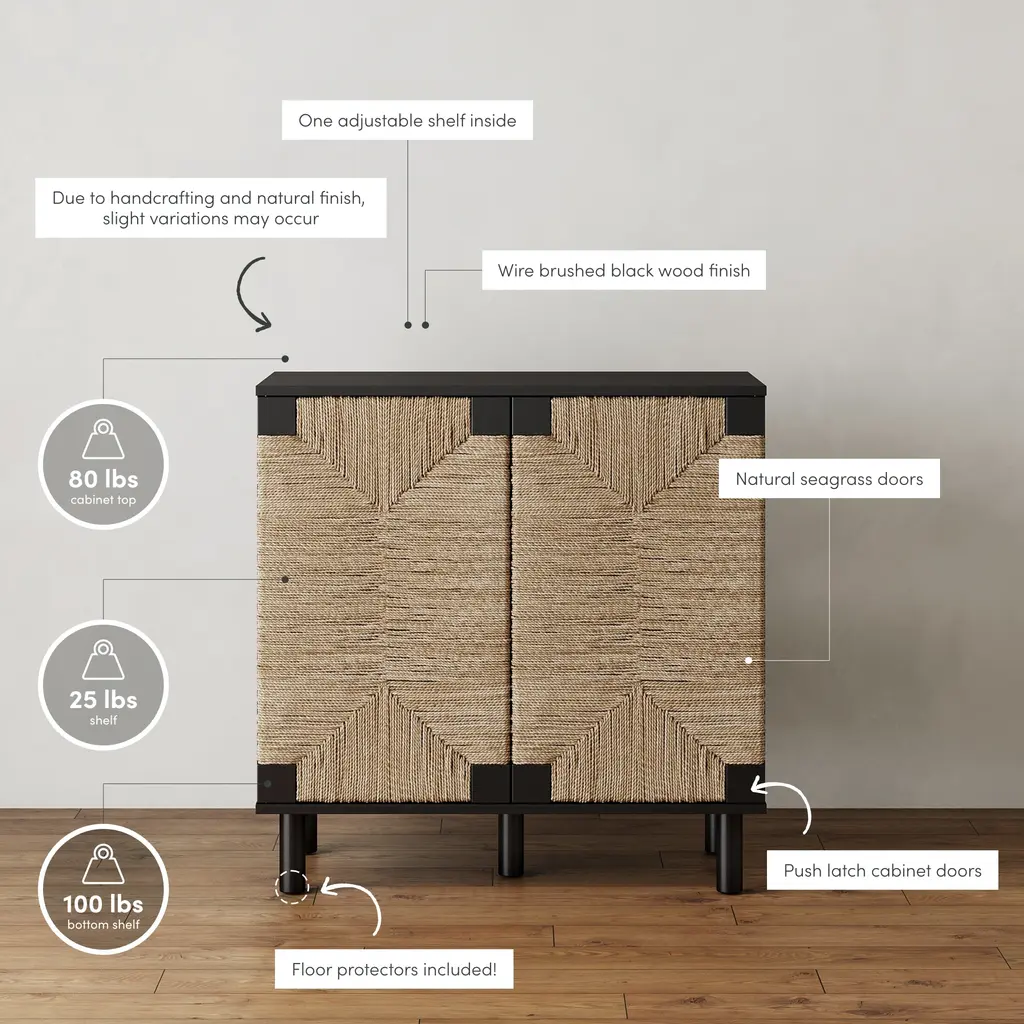Say hello to Beacon, the perfect textured storage cabinet. A wire brushed black finish is paired with push-latch natural seagrass cabinet doors for the an on-trend look that fits right in with any decor. An adjustable shelf gives you plenty of space to store records, books, or anything else you want to keep tidy and out of sight; or pair two side-by-side for extra storage. The handcrafted natural finish means some slight variations may occur.