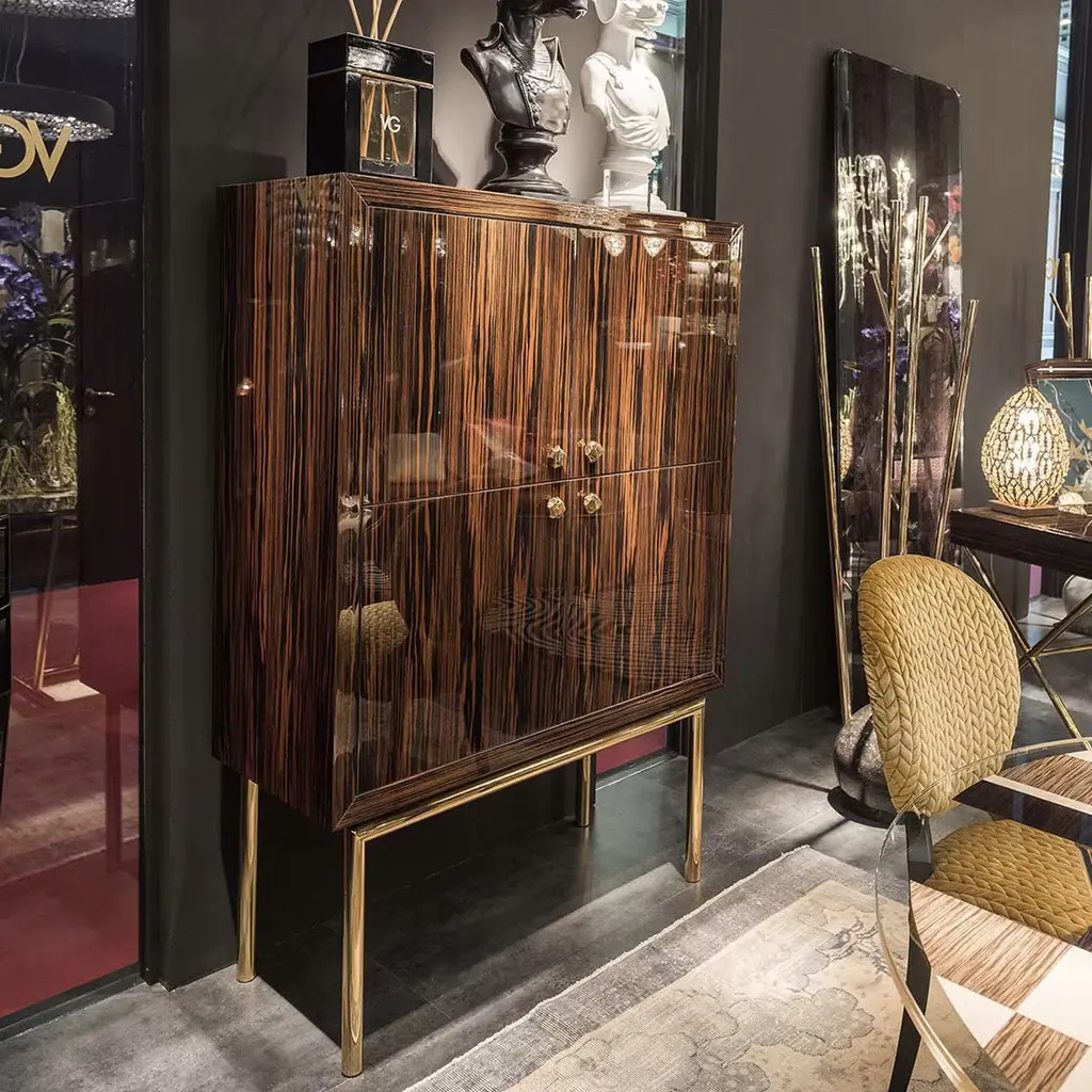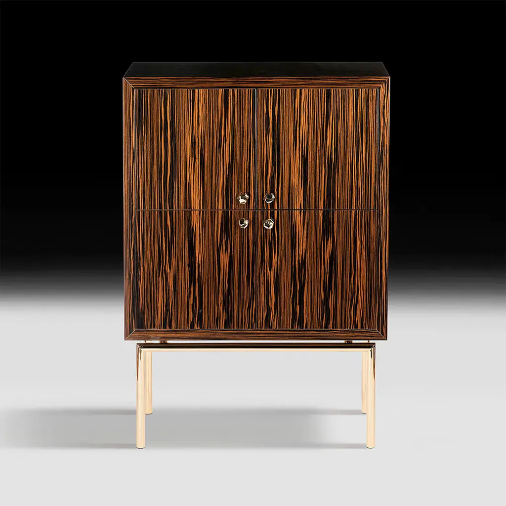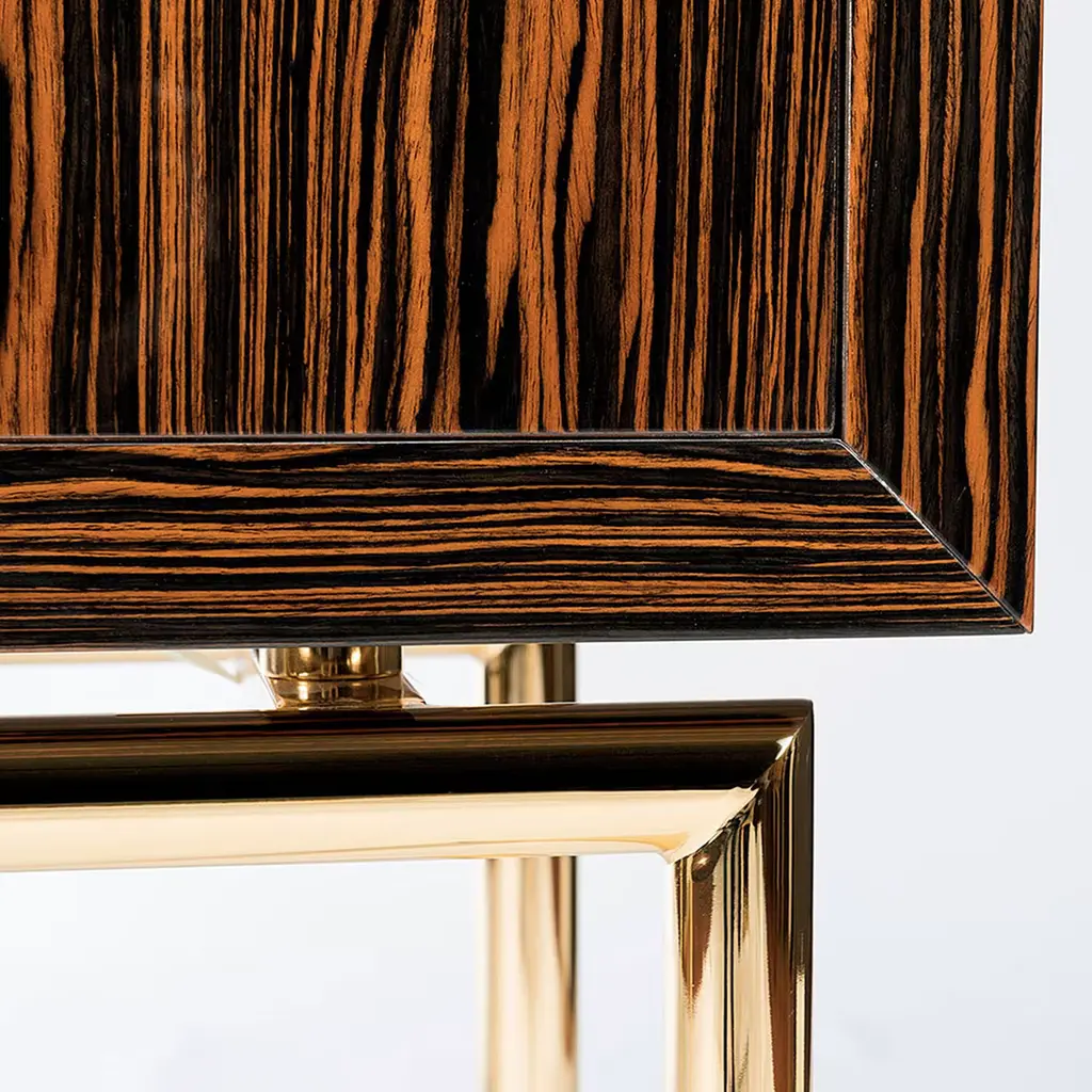 This exquisite piece is part of the Original Sin collection designed by Giorgio Ragazzini. The luxurious feel of this cabinet, with its ebony wood with a glossy finish and the metal structure with a precious coat of 24k gold, matches the other pieces of the same collection and will bring a touch of precious elegance to any decor. Inside, the finish is matte and the interior is equipped with a back mirror and one structural shelf (plus two glass shelves that are supplied separately). The handles are in metal with a gold finish.