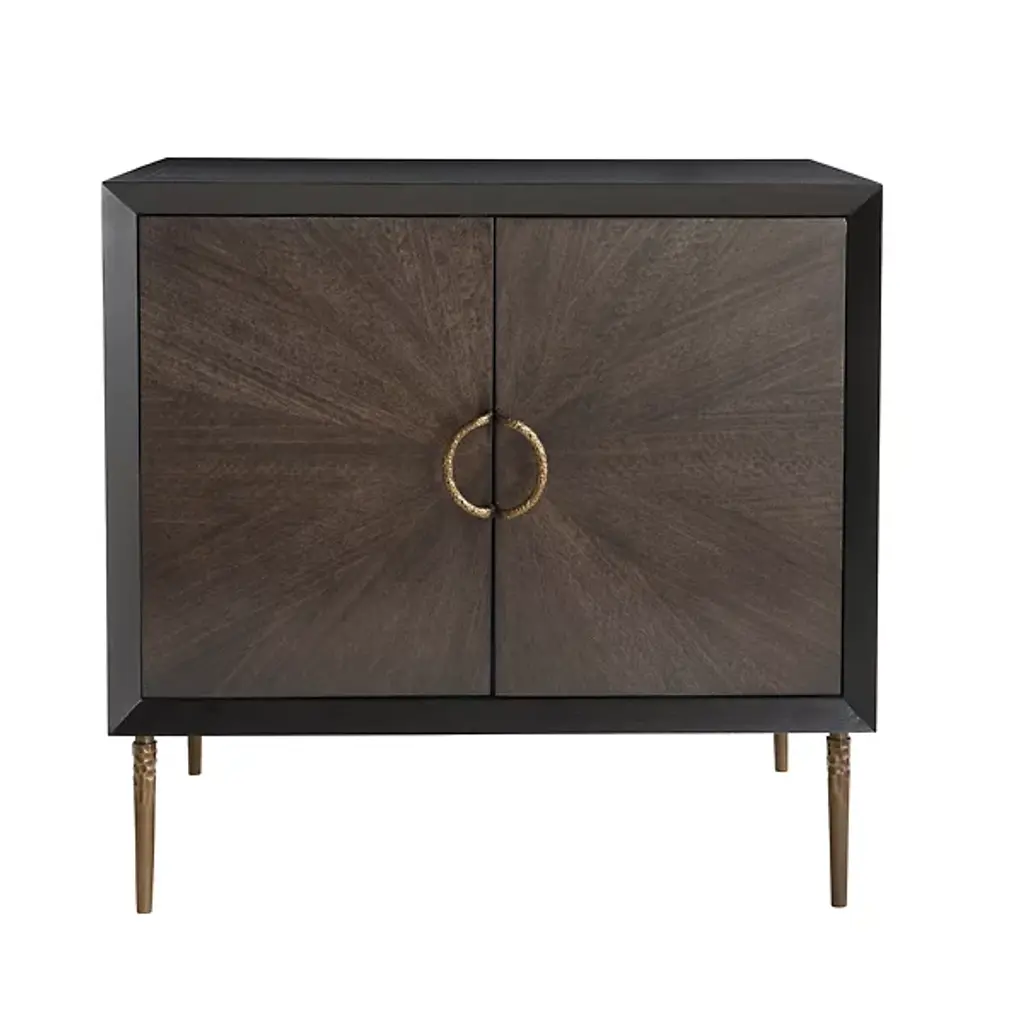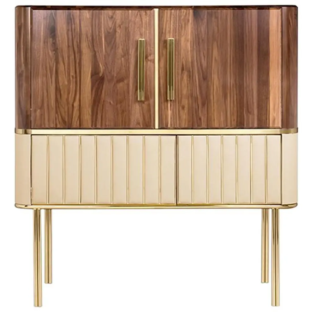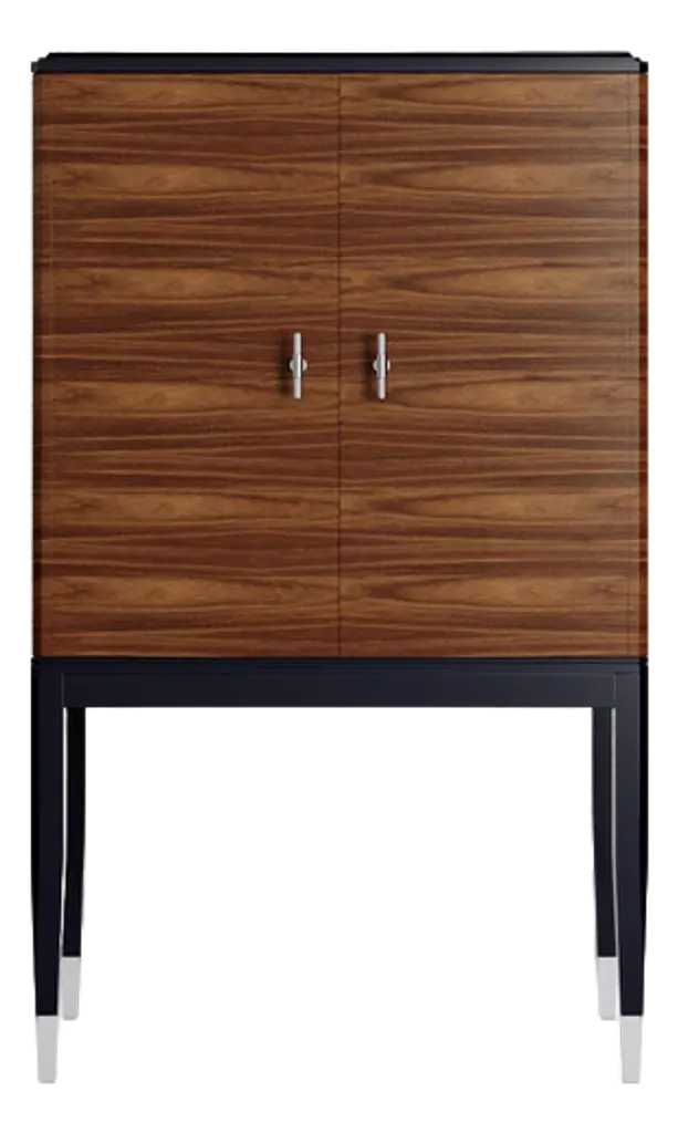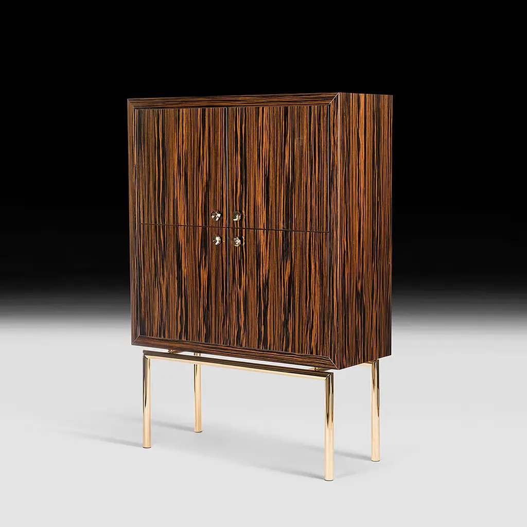 This exquisite piece is part of the Original Sin collection designed by Giorgio Ragazzini. The luxurious feel of this cabinet, with its ebony wood with a glossy finish and the metal structure with a precious coat of 24k gold, matches the other pieces of the same collection and will bring a touch of precious elegance to any decor. Inside, the finish is matte and the interior is equipped with a back mirror and one structural shelf (plus two glass shelves that are supplied separately). The handles are in metal with a gold finish.