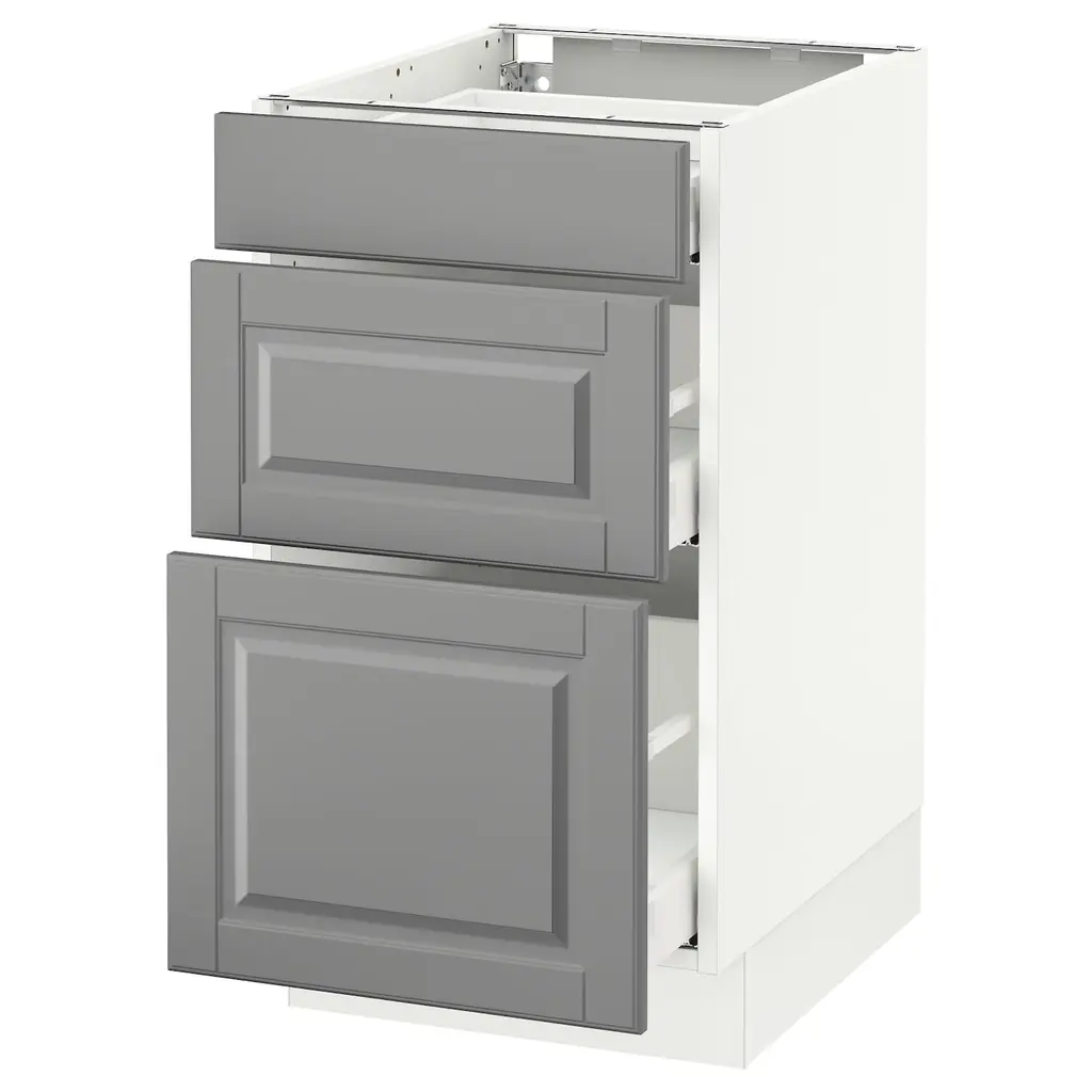 SEKTION Base cabinet with 3 drawers - white Maximera/Bodbyn gray 18x24x30 ". MAXIMERA drawer is a smooth-running, full-extension drawer with built-in dampers so that it closes slowly, softly, and quietly. Sturdy frame construction, ¾" thick. Requires a knob or a handle