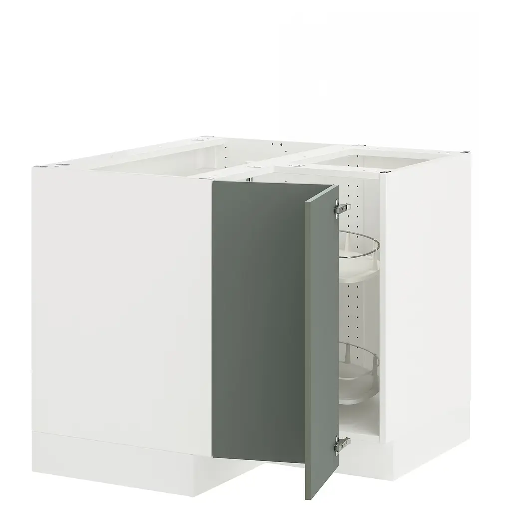 SEKTION Corner base cabinet with carousel - white/Nickebo matte grey-green 38x24x30 ". The shelves can be moved vertically and rotated to make it easier for you to access what you need. Ideal for storing things like pots, pie plates, and dry goods. Sturdy frame construction, ¾" thick.