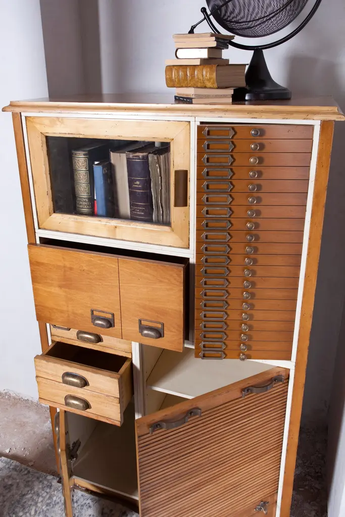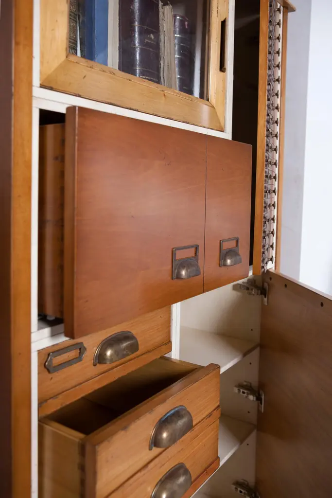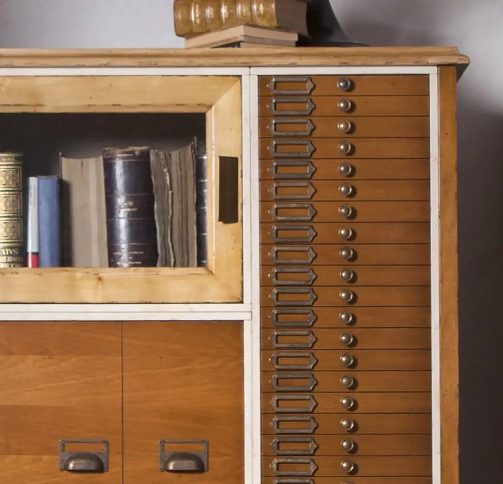 Seller Wooden Cabinet by Lola GlamourDimensions: D 45 x W 97 x H 160 cmMaterials: Wood.Under a nineteenth-century appearance of forgotten filing cabinets, with Seller, we wanted to get closer to the original workshops of cabinetmakers and craftsmen. Trompe l'oeil with countless small drawers, this wardrobe has four doors and three large drawers, with a spacious and very practical interior. The subtle combination of its brown and cinnamon colors gives prominence to the decorative handles and rivets in aged brass.We are Félix and Désirée Ramos, brothers and product designers of our brand, Lola Glamour.We are interested in the singular, the different, the beauty, and the balance of color and materials. We have the ability to observe and the ability to translate any beautiful object into a piece of furniture.We are proud of having created our own style, a way of understanding design, which allows us to tell stories and connect with the souls of people and spaces.Lola Glamor is a Spanish company from Soria, which has designed and manufactured unique furniture in noble woods, with artisanal construction and extraordinary finishes since 1995. Artistic furniture that is customized in size and finish according to the client's needs.We offer original furnishing solutions for professionals and individuals from any country in the world, mixing materials, volumes, motifs, and colors that achieve their own style.We are, above all, the sum of a team of people who contribute their dedication and commitment to a unique level of demand, detail, and quality.