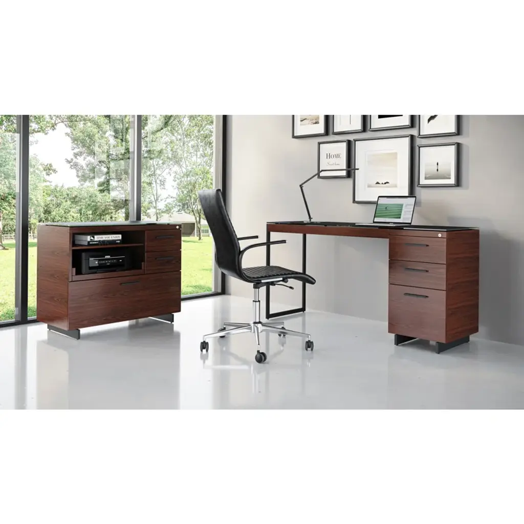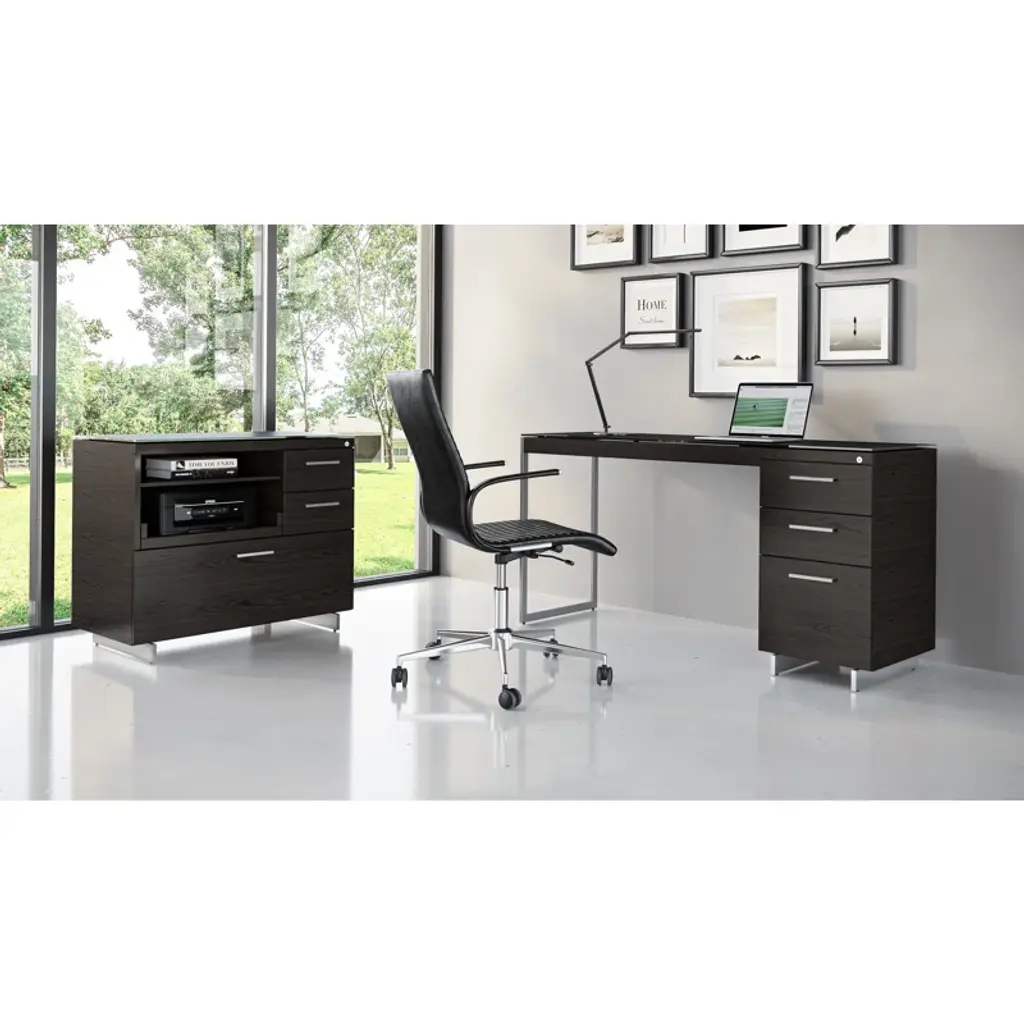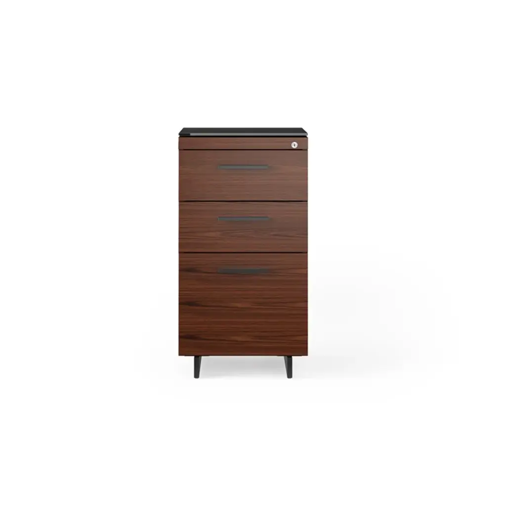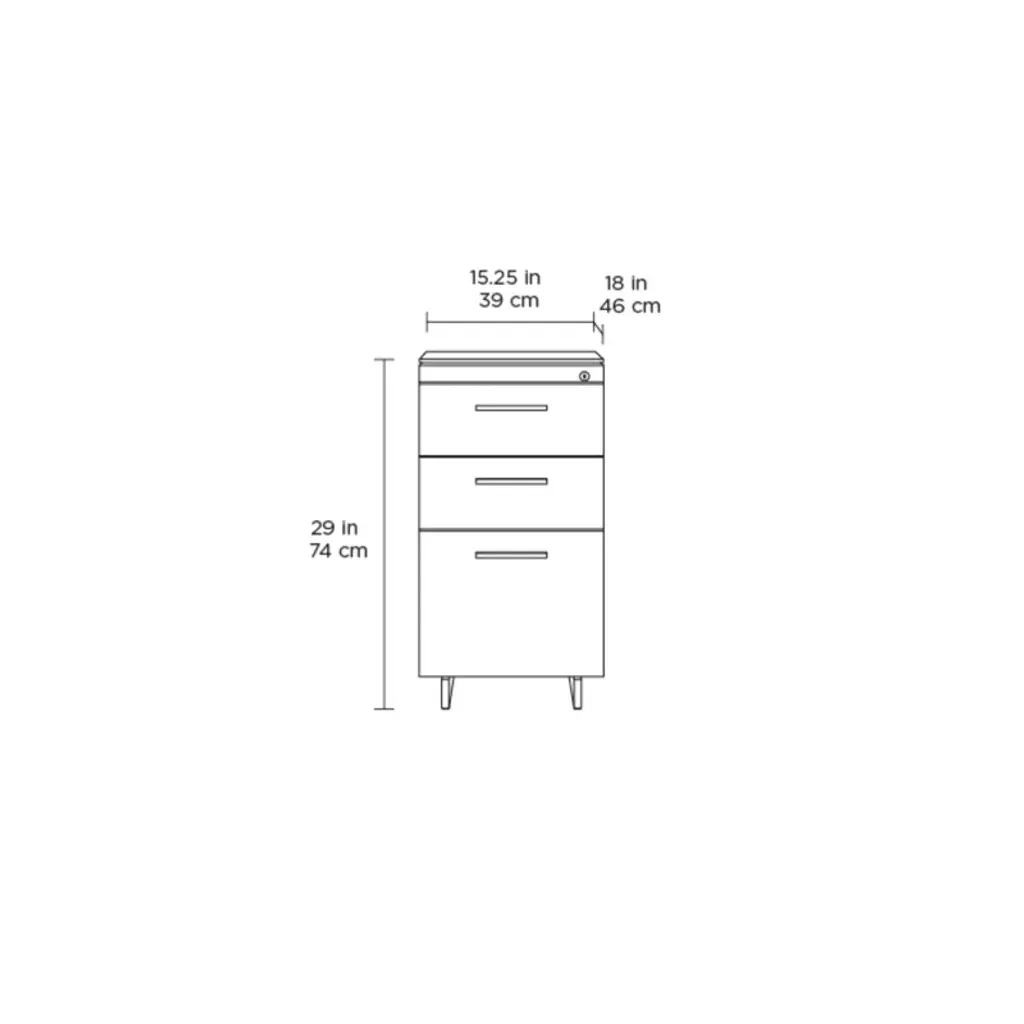 This three-drawer filing cabinet includes two storage drawers for office supplies, a file drawer for letter or legal-sized folders, and can be placed beside a desk to extend the available workspace.